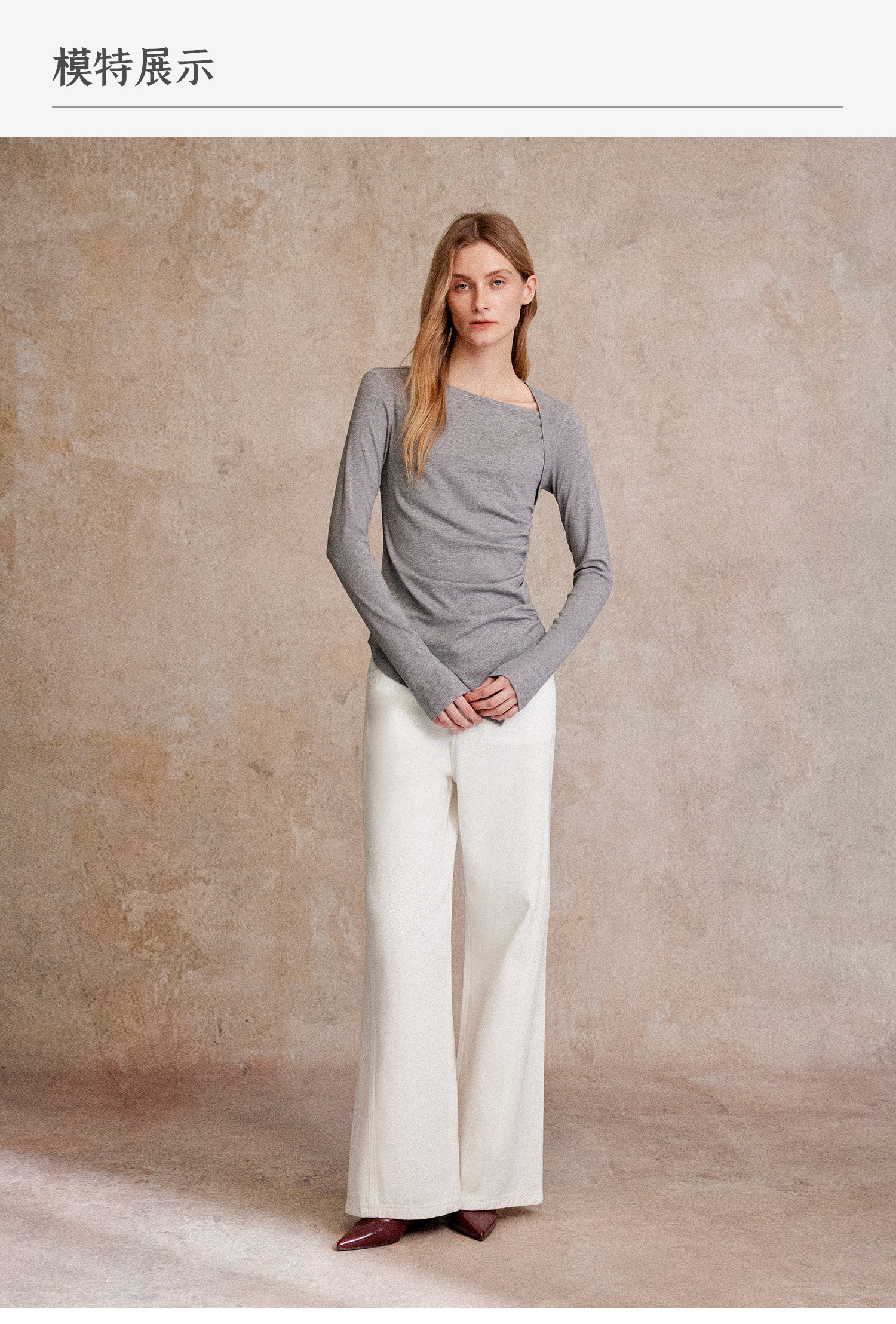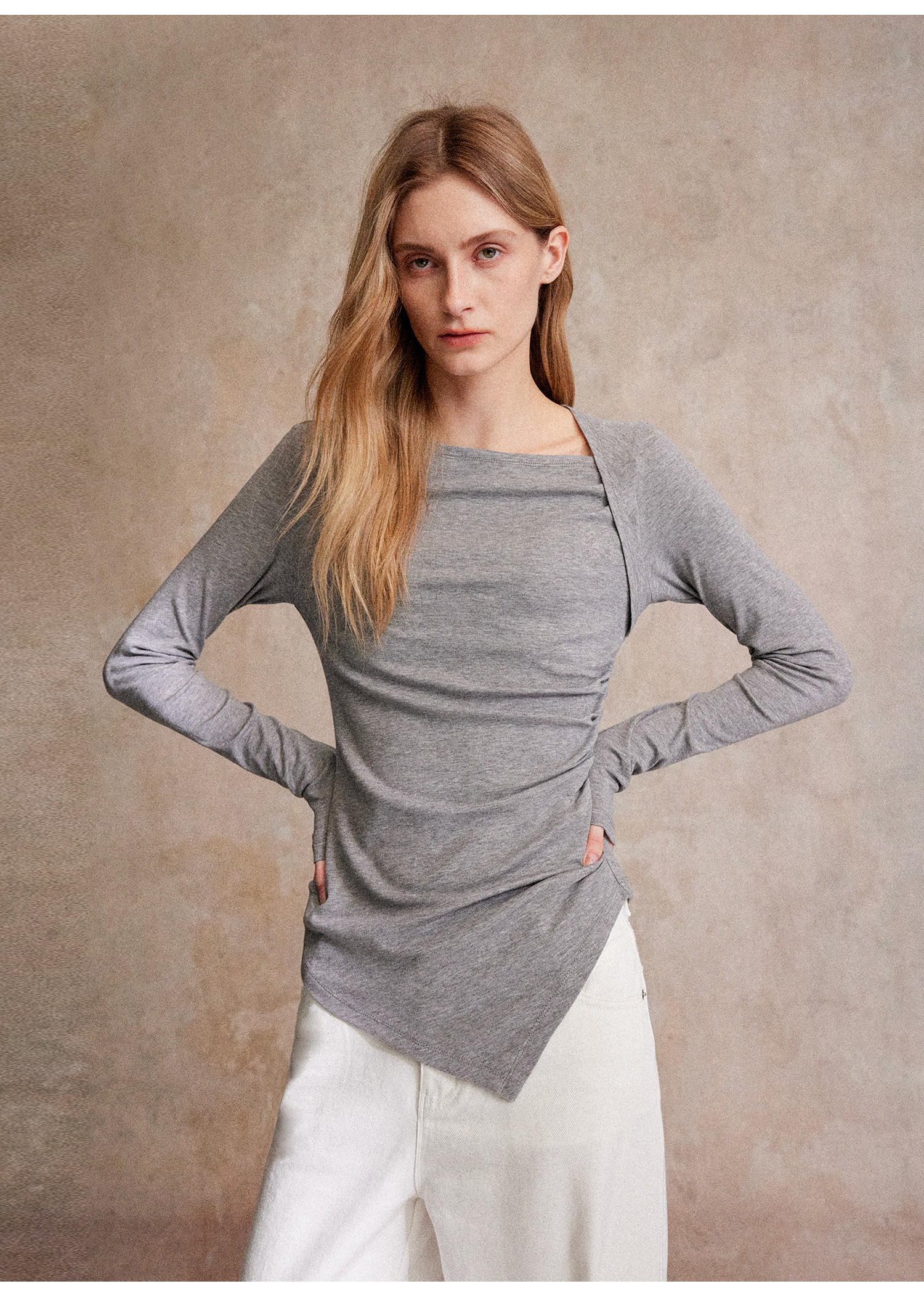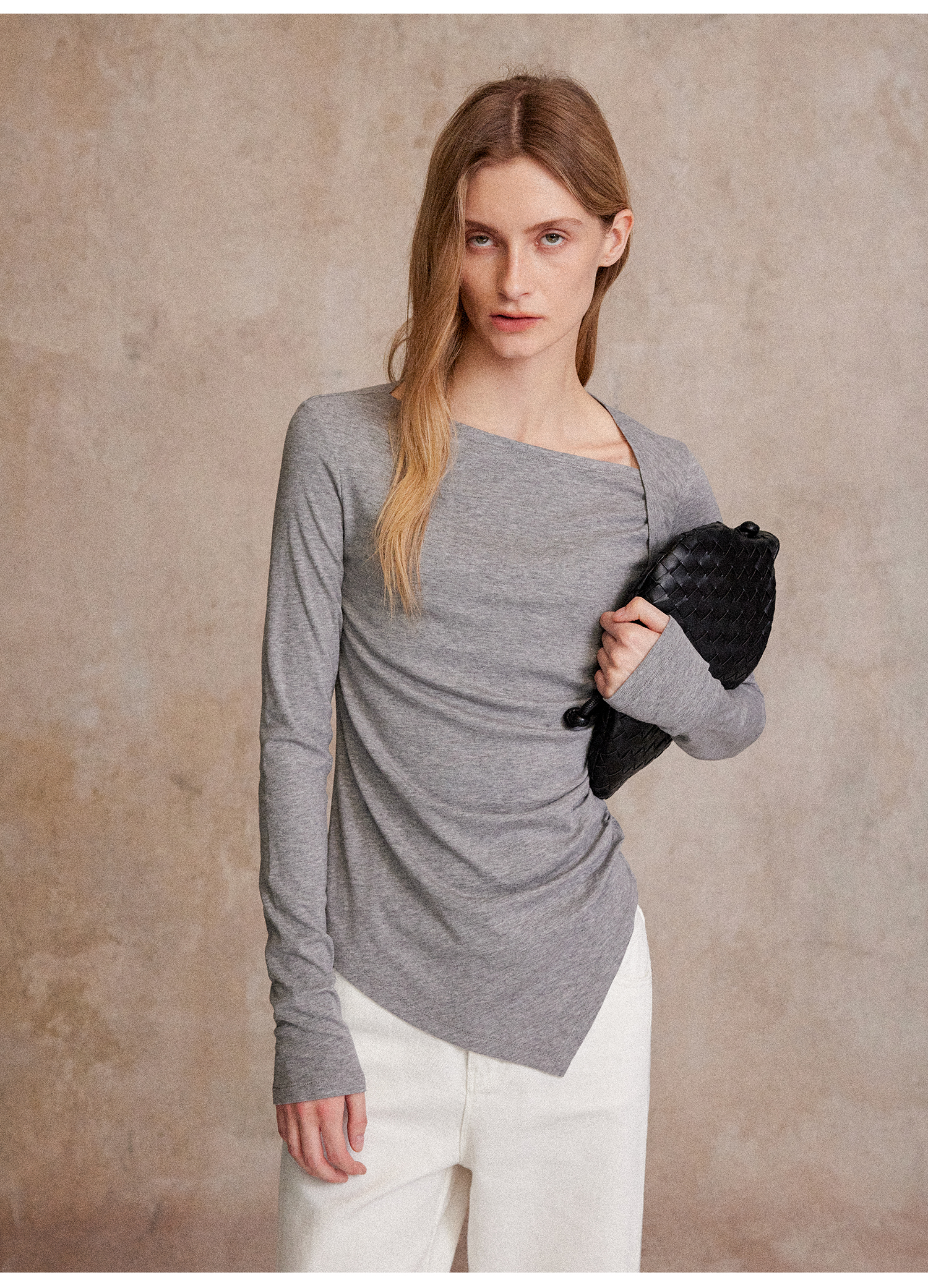 C+IMPRESS/西嘉天丝羊毛 长袖T恤女秋不对称斜领打褶收腰针织上衣T2503050