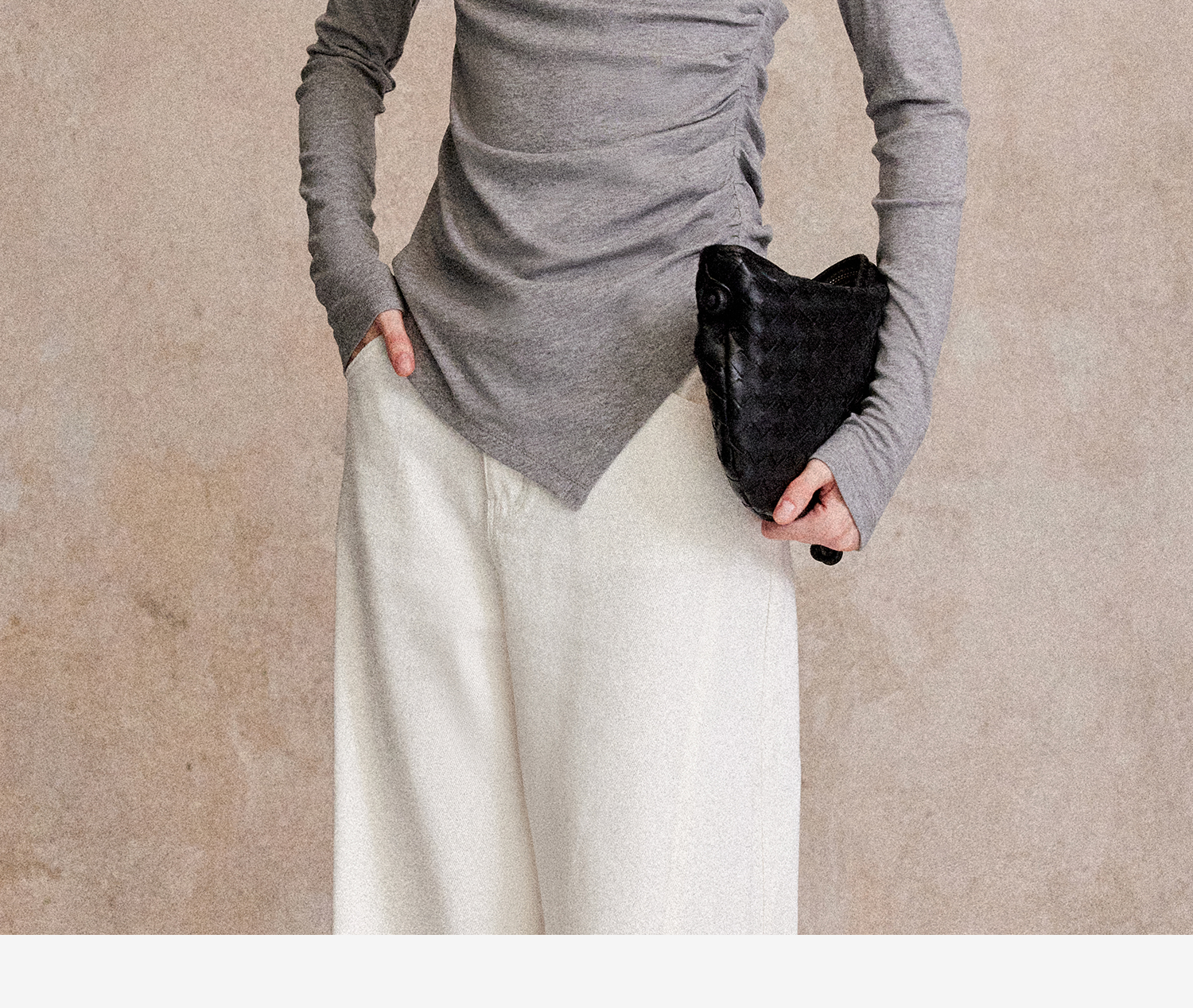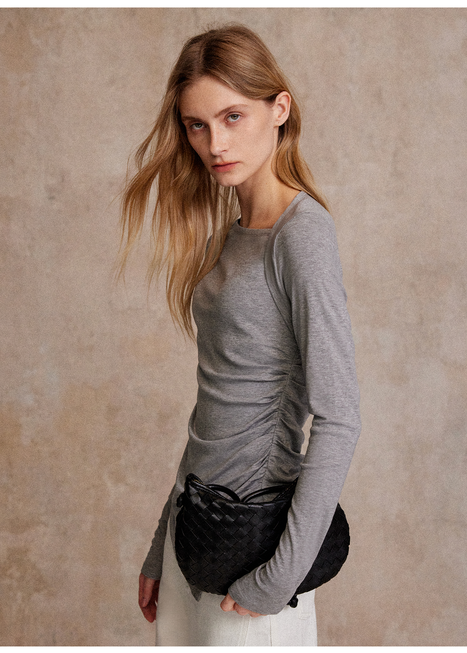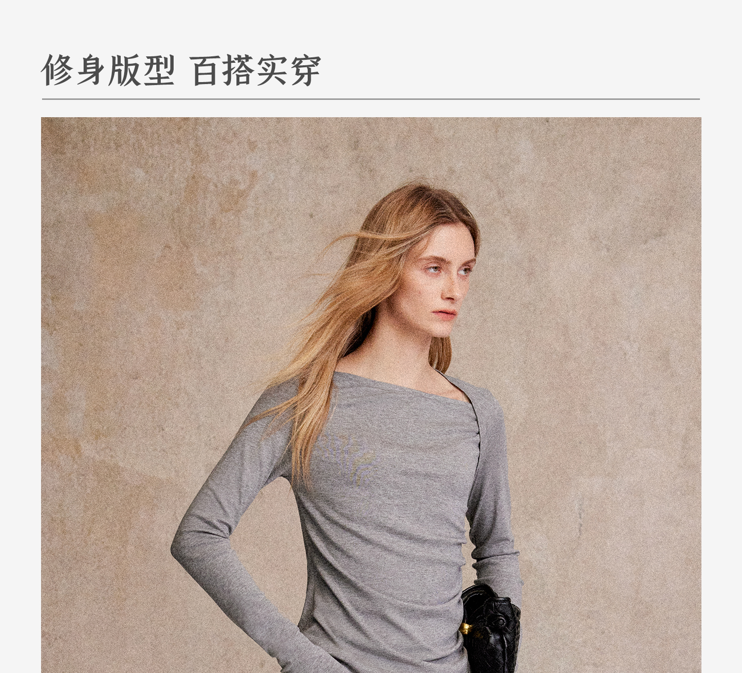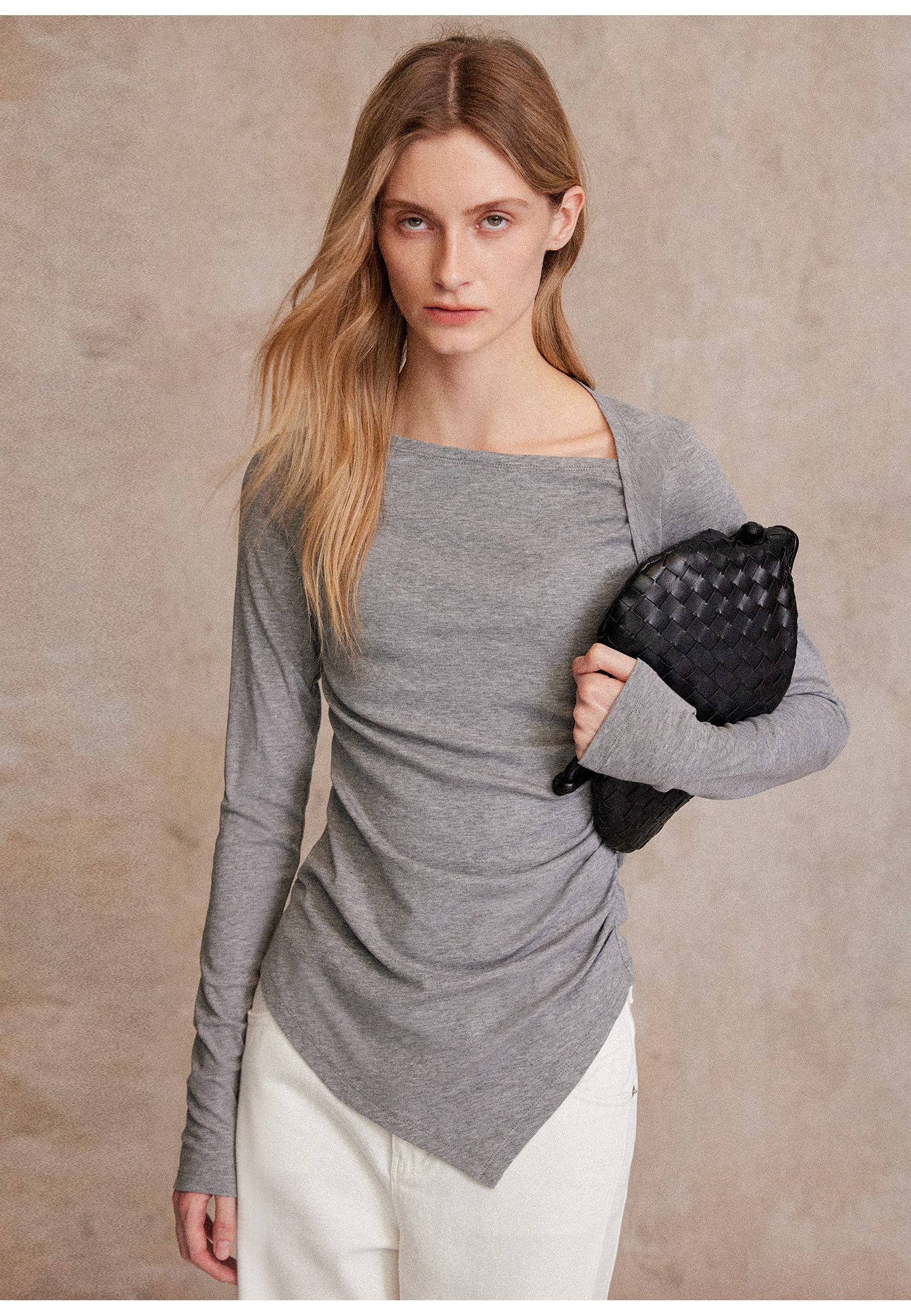 C+IMPRESS/西嘉天丝羊毛 长袖T恤女秋不对称斜领打褶收腰针织上衣T2503050