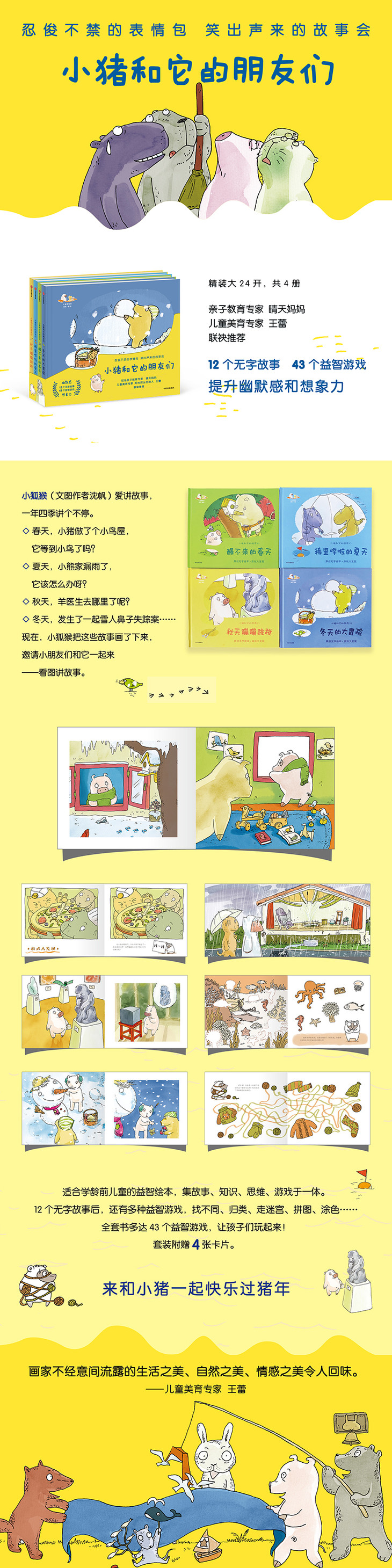 这是一套适合学龄前儿童的绘本,集故事、知识、思维、游戏于一体。读图的同时,潜移默化地培养孩子的幽默感。全套分春、夏、秋、冬四册,共12个故事43个游戏。构思精巧,轻松幽默,画风清新。每个故事之后还有“游戏大发现”,包括找不同、连线、涂色等。书后附有家长导读,方便亲子共读。