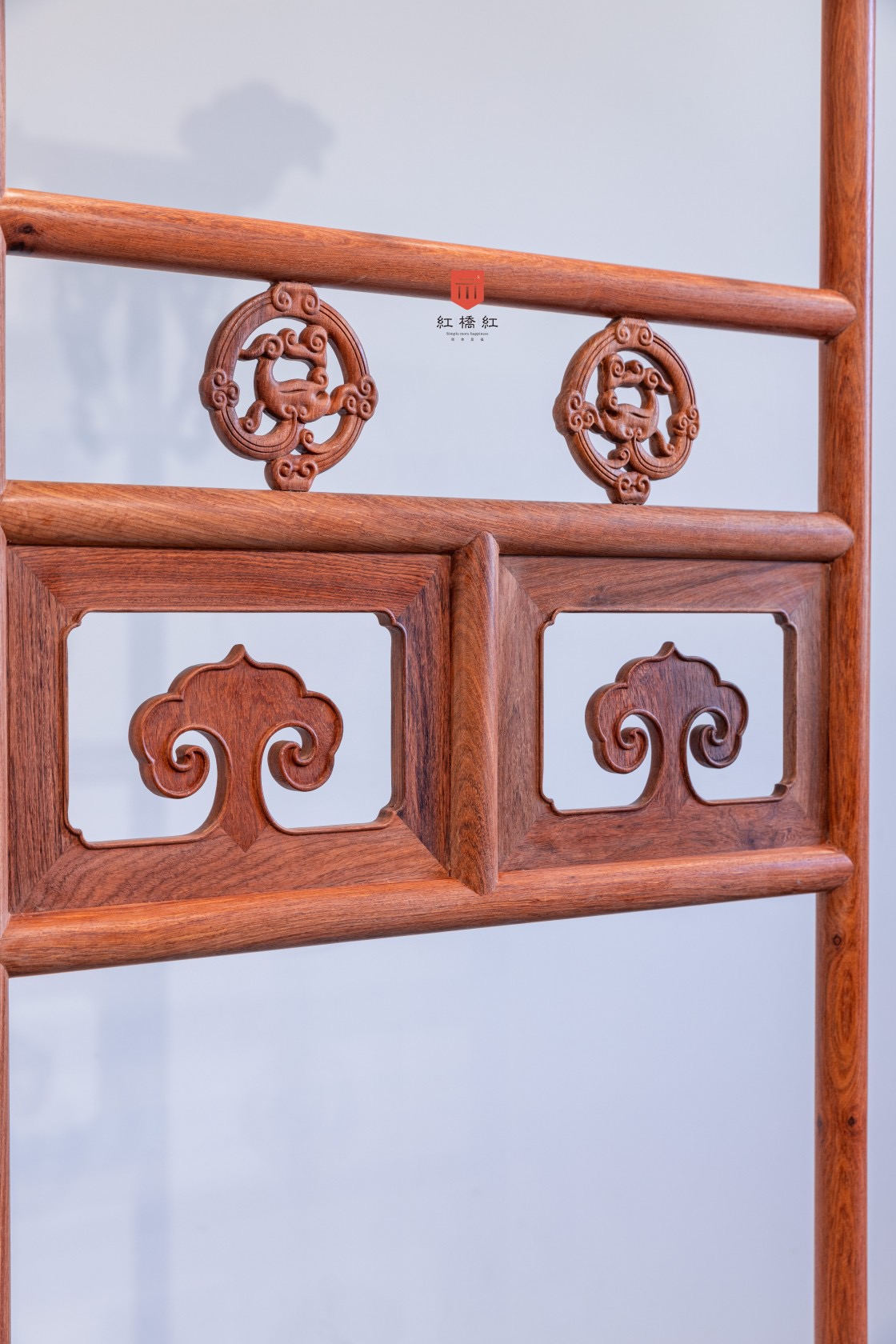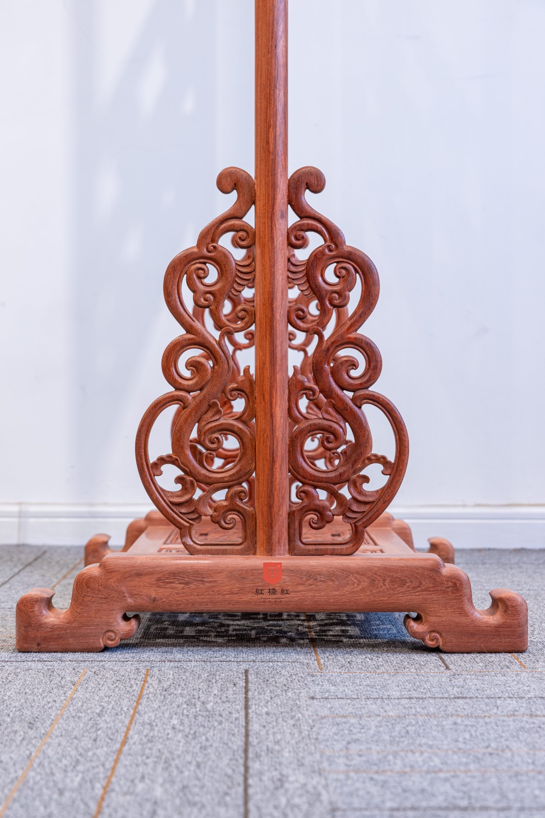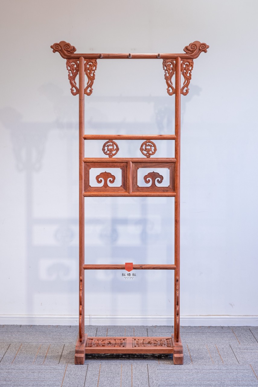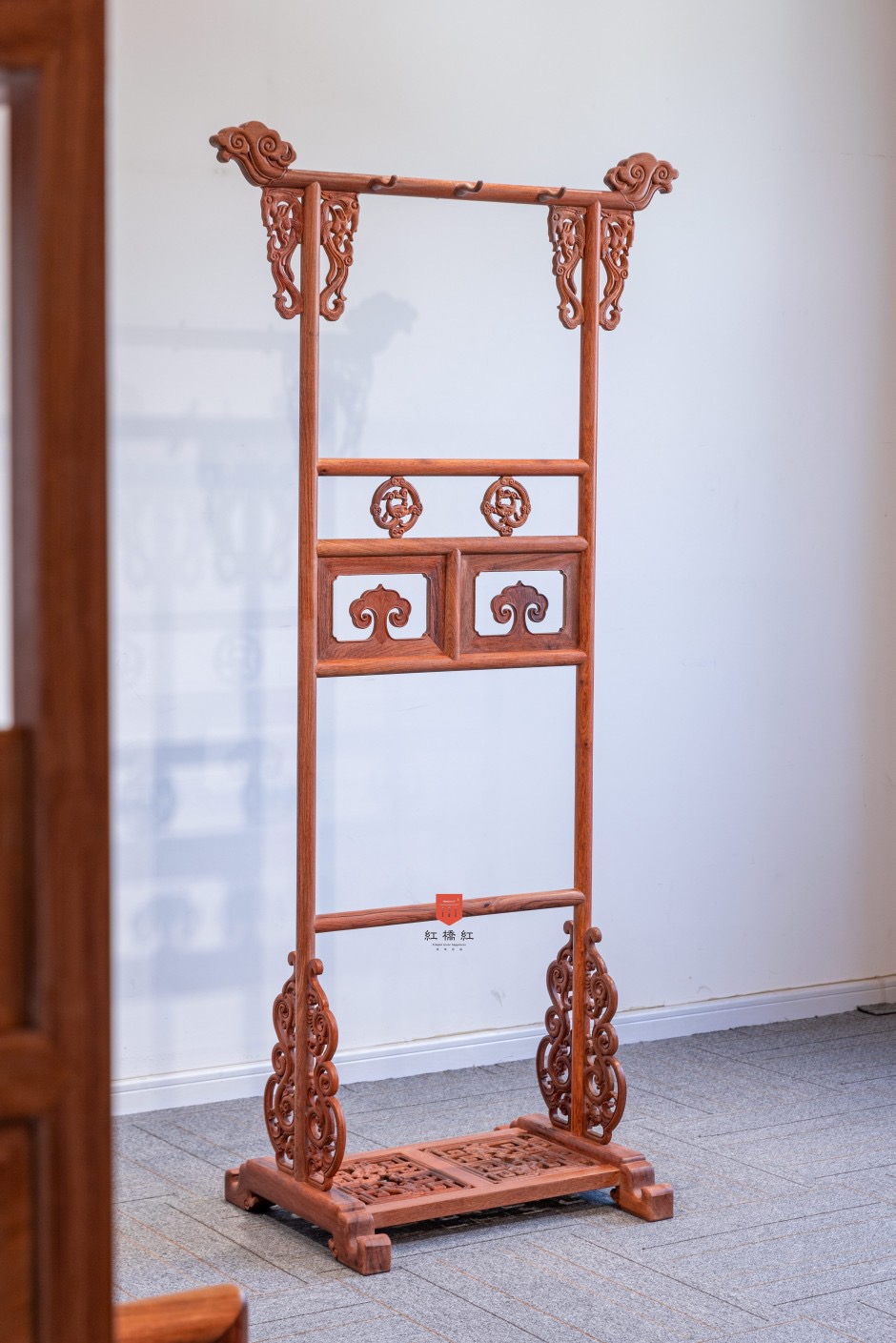 这款清式螭龙衣架,如意云纹至顶部两侧飞天而起,吉祥之意升腾,中牌子镂雕见光,与之呼应,繁中忽简,精美绝伦,各处牙板、卡子等纹饰,均取螭龙纹样,整体装饰统一,威而不严,庄而不重,琳琅相协,墩座厚实稳重,鞋置处加饰回纹,富贵不断,是雕花衣架是代表作品,唯加挂钩以适当代需求。