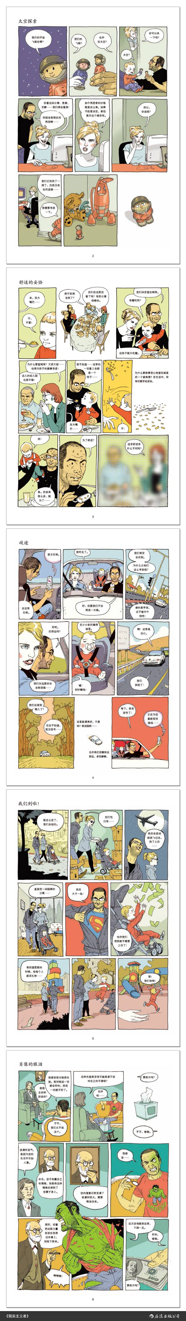故事从房东突然决定卖房开始,哈努卡一家不得不被迫搬离出租屋,面对铺天盖地的租房信息却找不到一间适合自己的……他是幻想破灭的平民,是缴械投降的丈夫,是怨恨气恼的一家之主,是焦虑不堪的父亲,是社交恐惧的普通人,也是自我怀疑的艺术家。有时候,变得现实并不是自愿选择,而是生活所迫。通览全书,灵感枯竭、房贷压力、夫妻关系、亲子关系、理想与现实的冲突……诸多问题在这本自传漫画中逐一呈现,尽显“现实主义”的本色。当然,生活中也不乏一些闪光的幸福瞬间,让人感叹即便辛苦,人间也依然值得。这就是成年人的世界。