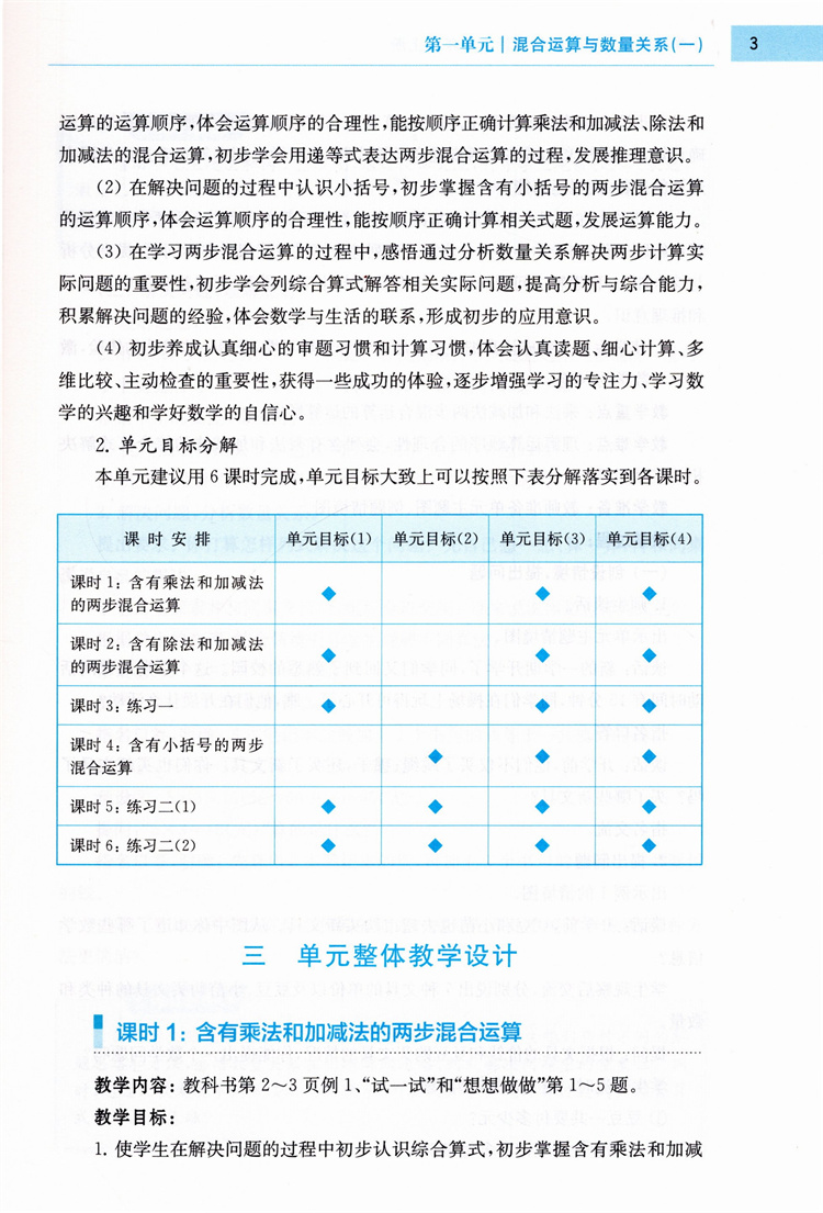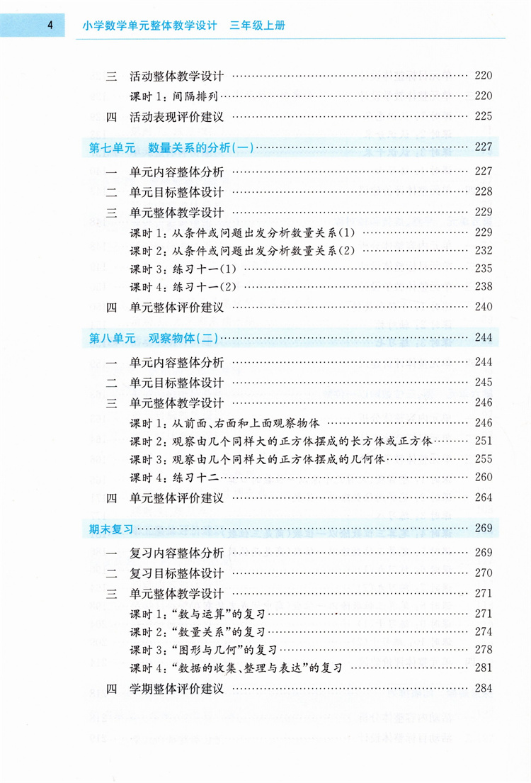 本书配套苏教版小学数学修订教材使用,为教师实施新课标理念下的数学教材的教学提供参考和示范。主要内容包括单元知识节点和知识结构图,单元教学目标和课时教学目标,单元教学重点难点和关键点,课时教学设计和设计意图说明,以及单元教学评价。特点在于:努力体现新课程发展核心素养的课程目标,以单元教学目标统领课时教学目标:立足知识整体 结构分析单元教学内容,把握课时教学内容的逻辑;通过单元教学评价,落顶部 学-评一致。