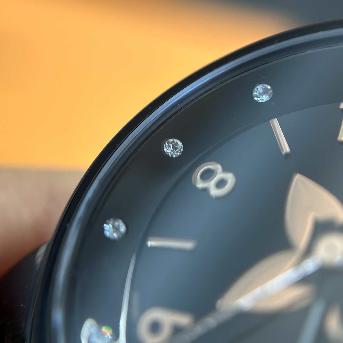 施华洛水钻+抛光不锈精钢表盘+黑色PVD涂层每一个细节都流露出奢华感!