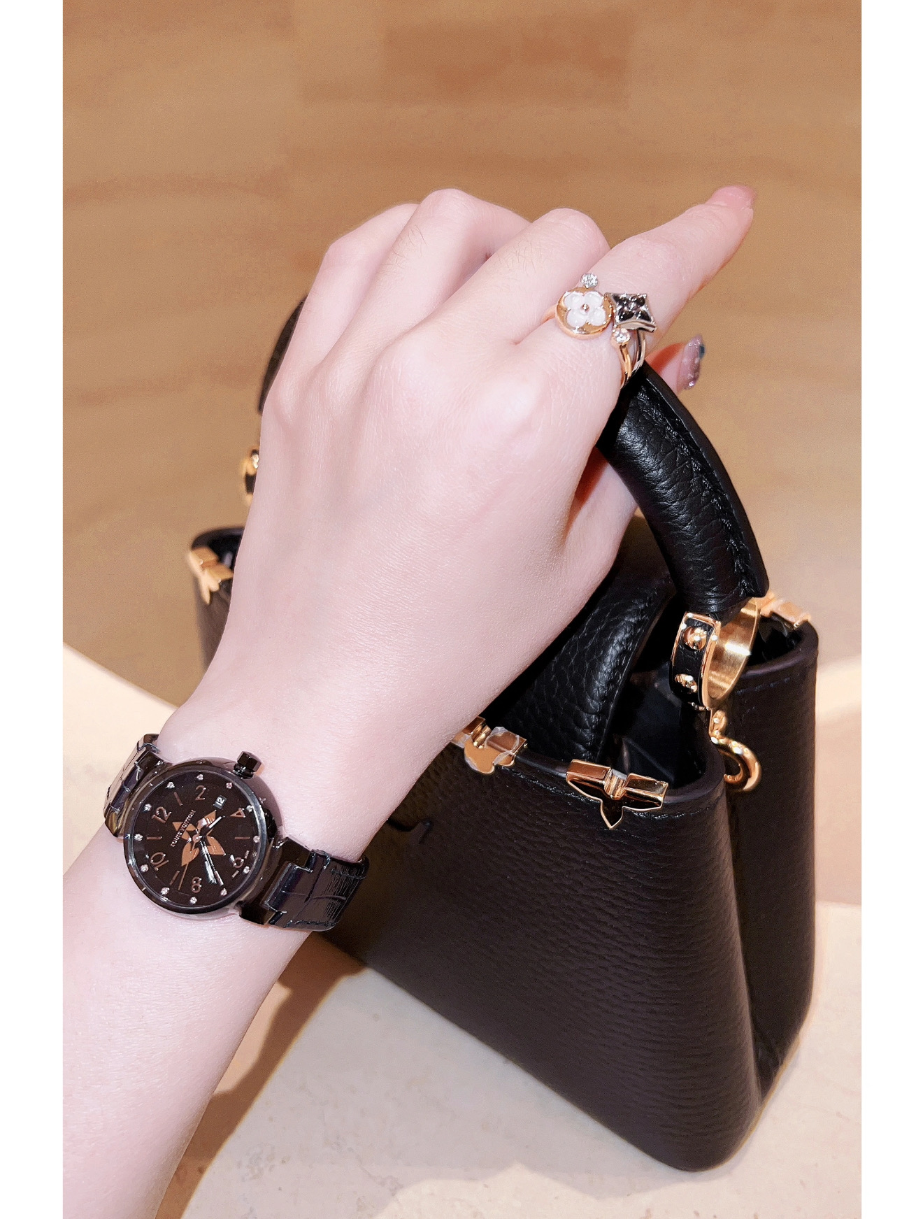 34mm表径表盘内的数字简约而优雅 放佛被施了魔法 让人心动不已!简约的刻度化繁为简 反而带出丝丝清爽亮丽 互相映衬着迷人的质感 是穿搭需备的气质加分单品!!