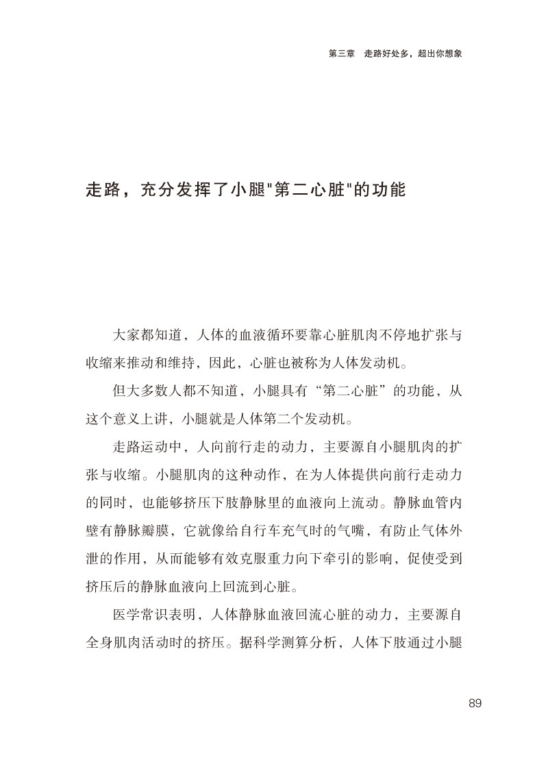 通常,步行15分钟左右,我们就会明显感到脚底发热,20多分钟后,会明显感到心胸开阔舒畅,这与小腿促进全身血液加快流动是分不开的。走路能够通过小腿肌肉扩张与收缩促使下肢静脉血液快速向上回流,这样就大大减轻了心脏的负担,相当于对心脏进行了维护和保养。