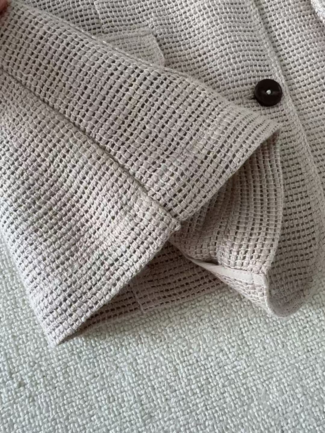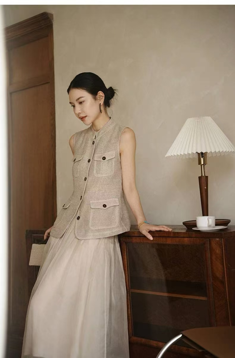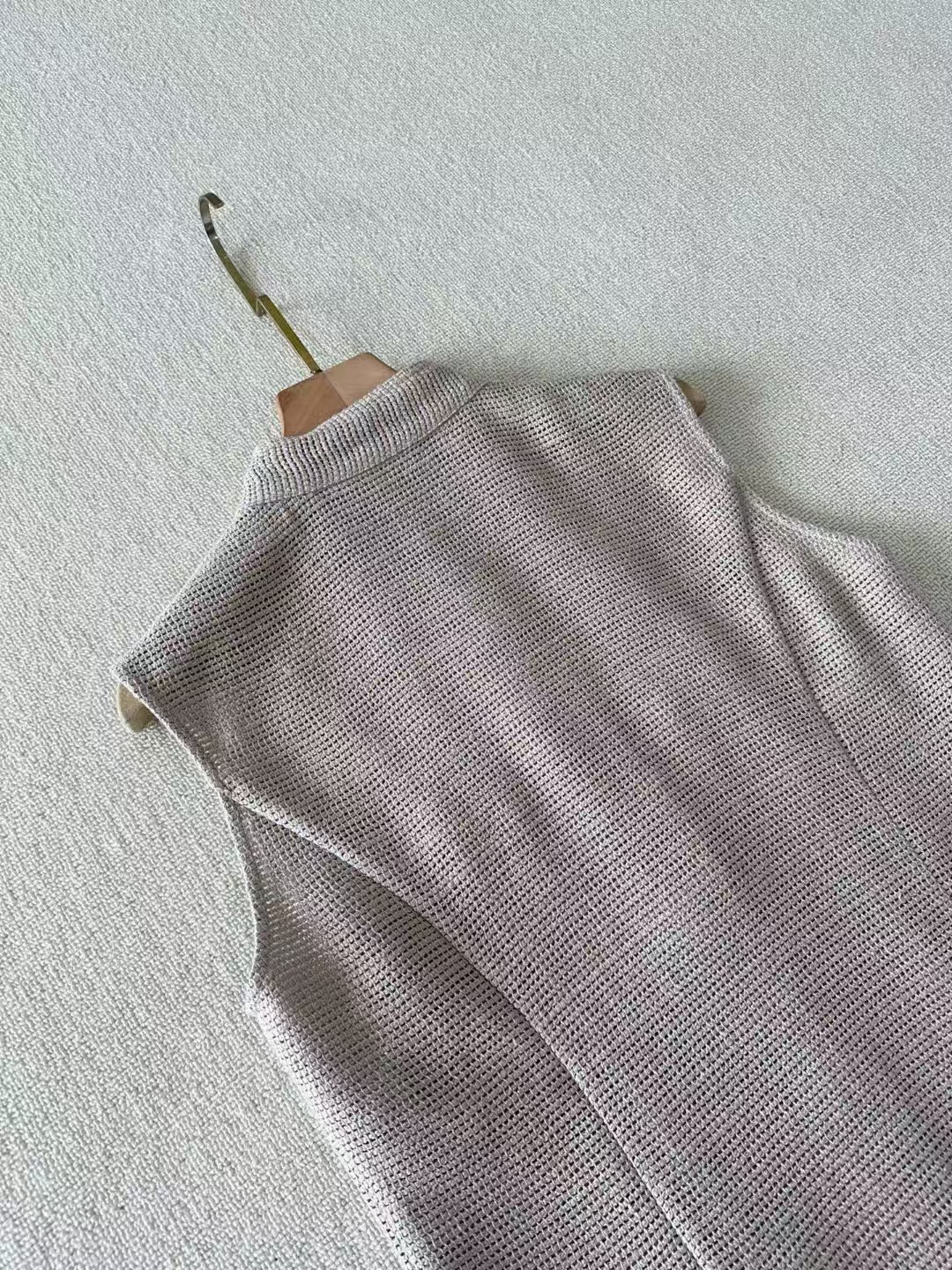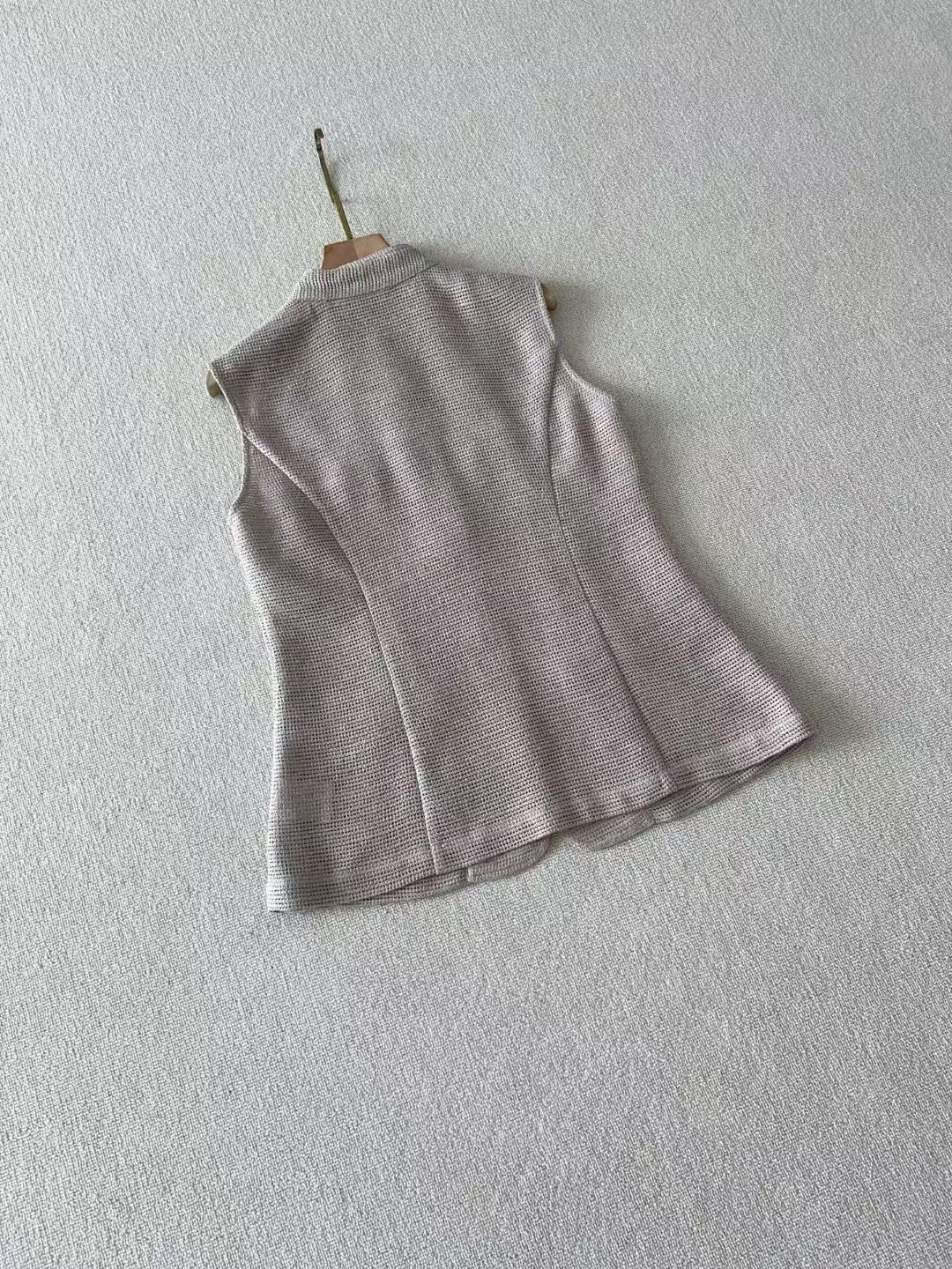 BC*精致小镂空亚麻银丝马甲,经典的镂空设计,领口小立领设计,丰富了整体的层次感,休闲佰搭,不挑人穿,客供棉+亚麻+粘纤+银丝材质,镂空肌理,织面疏松有致,柔软亲肤,舒适透气,做工细致,不易皱,不易变形,好穿好打理,合体舒身版型,勾勒身形曲线,藏肉显瘦,配牛仔裤、半身裙都显好,墙裂建议大家收。