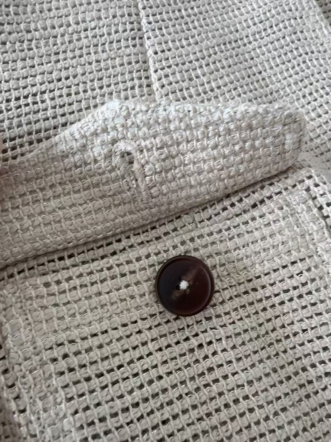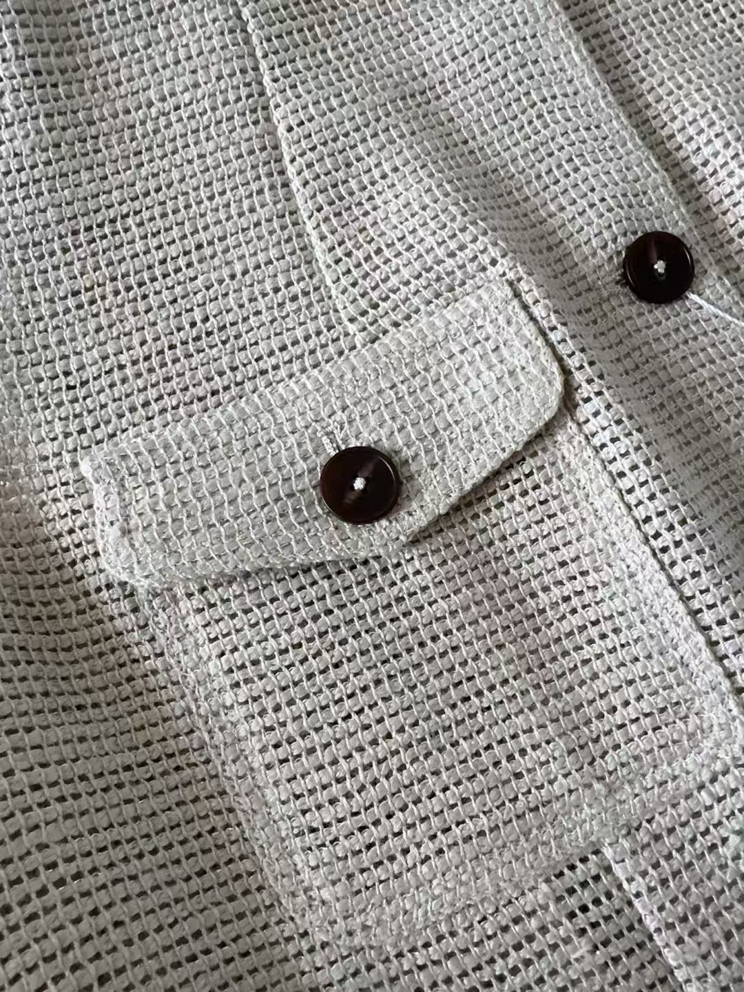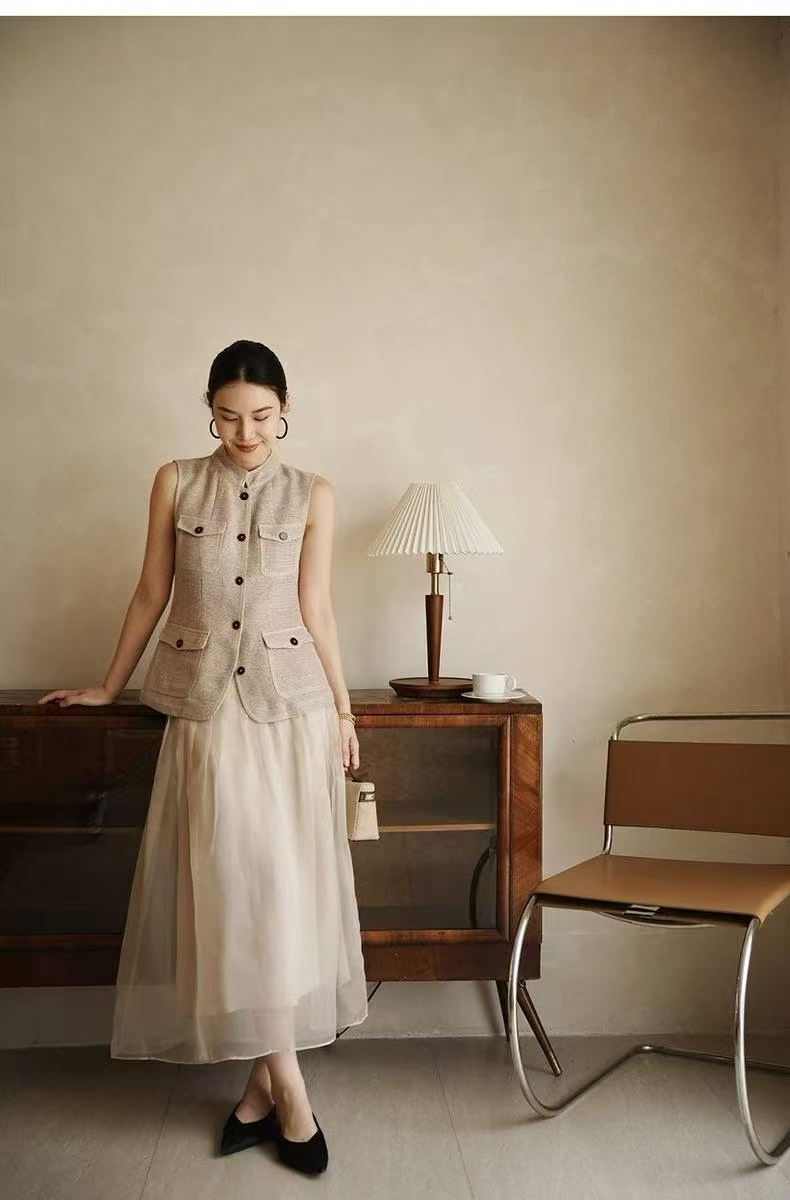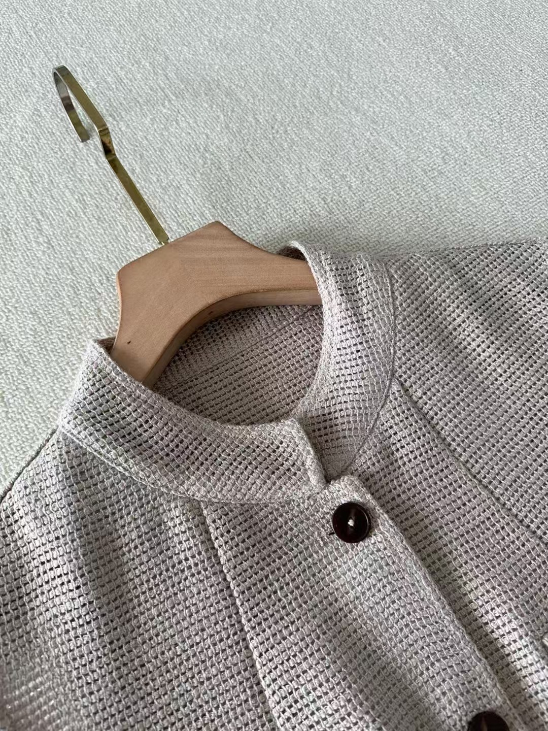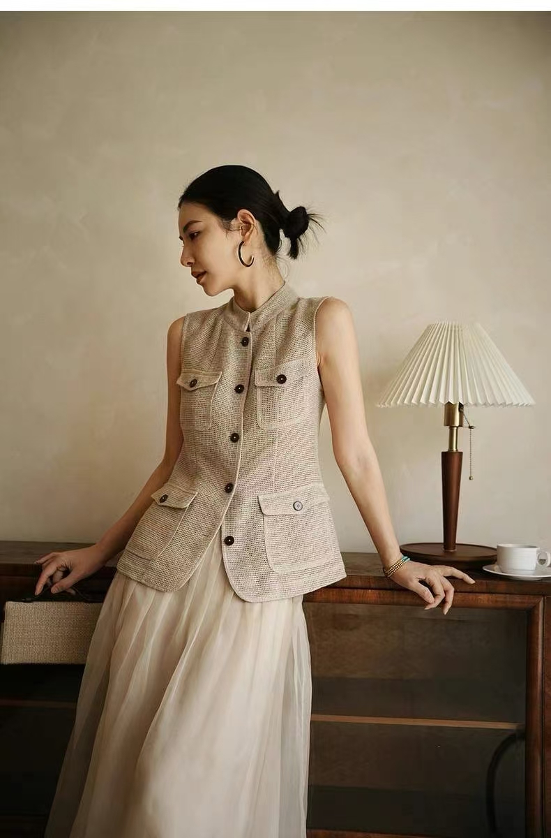 BC*精致小镂空亚麻银丝马甲,经典的镂空设计,领口小立领设计,丰富了整体的层次感,休闲佰搭,不挑人穿,客供棉+亚麻+粘纤+银丝材质,镂空肌理,织面疏松有致,柔软亲肤,舒适透气,做工细致,不易皱,不易变形,好穿好打理,合体舒身版型,勾勒身形曲线,藏肉显瘦,配牛仔裤、半身裙都显好,墙裂建议大家收。