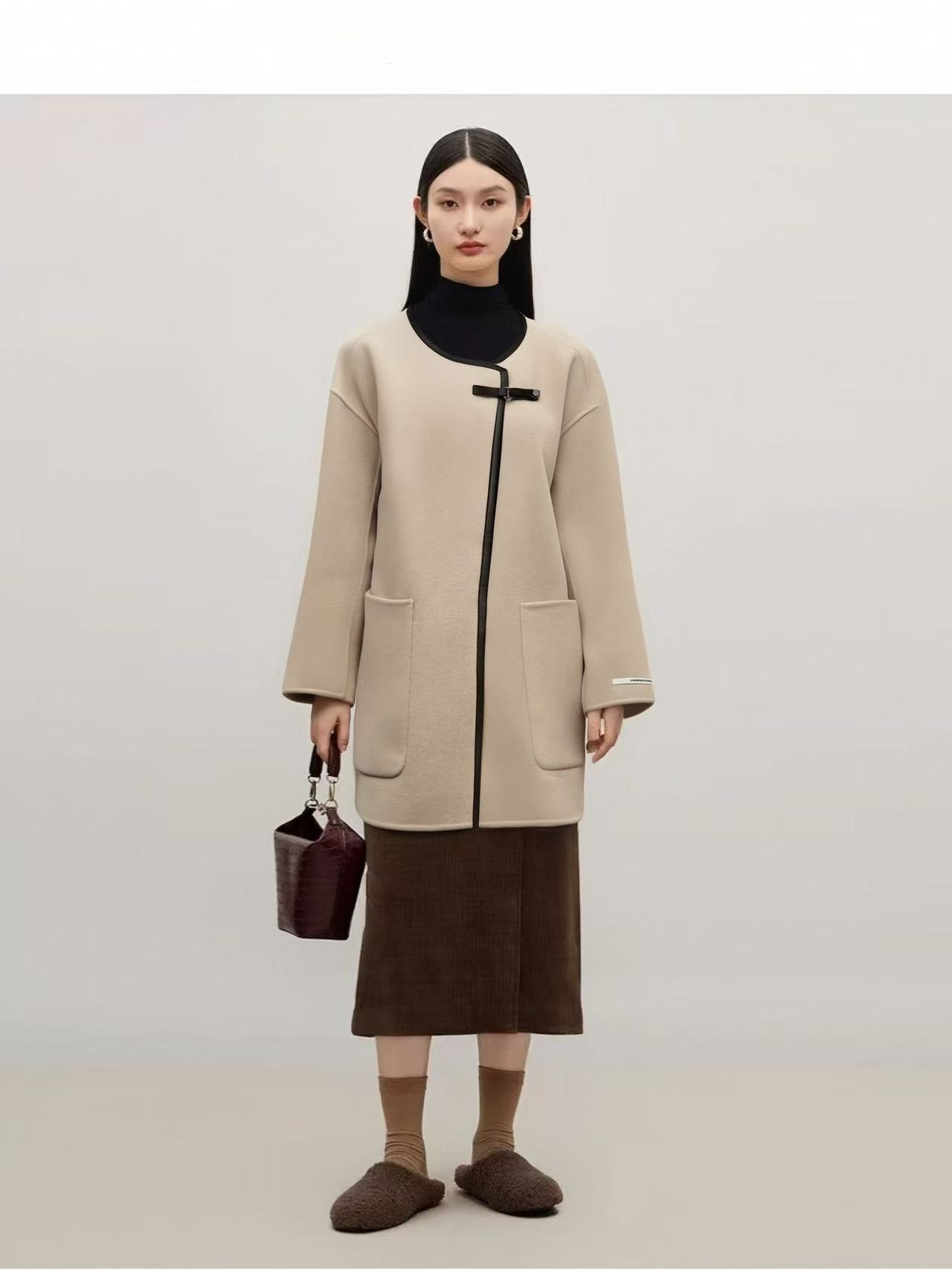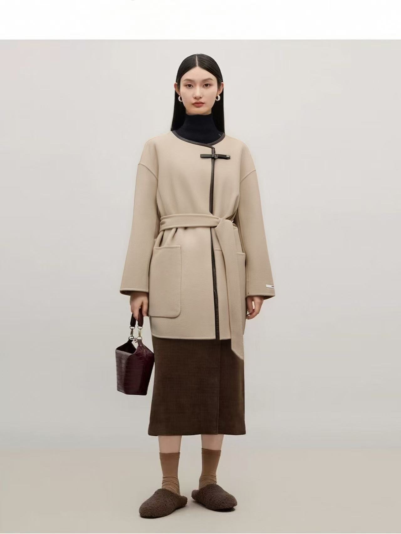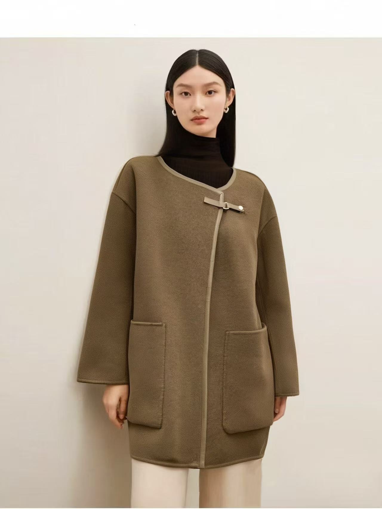 【高端系列】手工定制8503款5%山羊绒➕95%澳洲羊毛优雅皮扣包边双面尼中款大衣-喜出