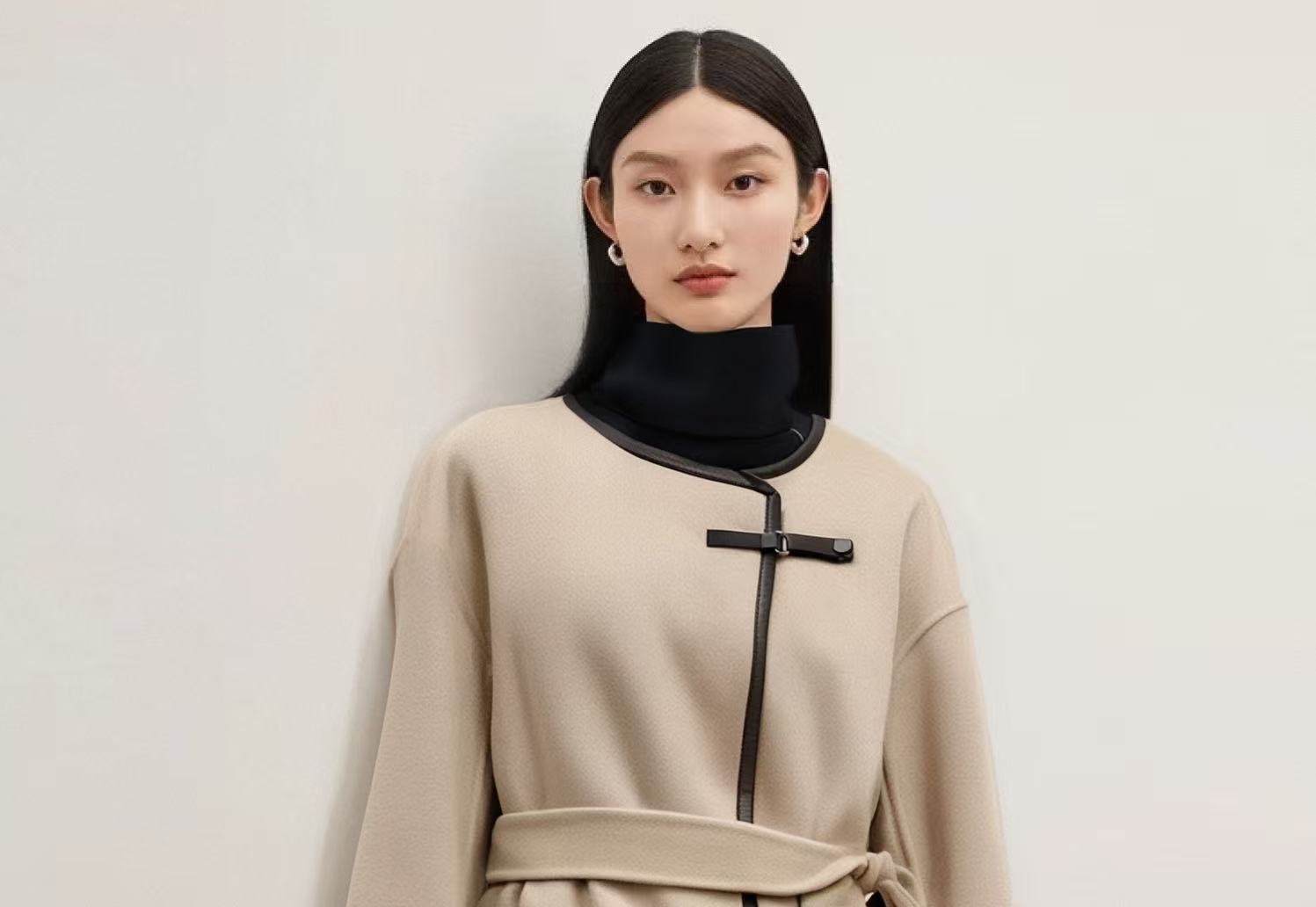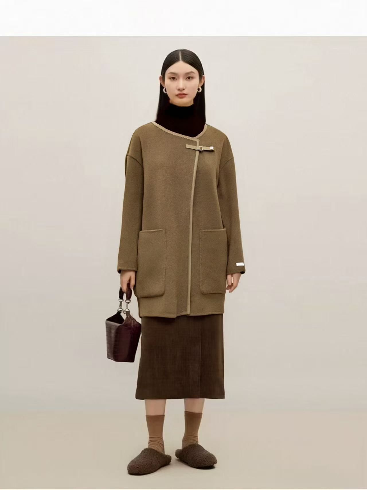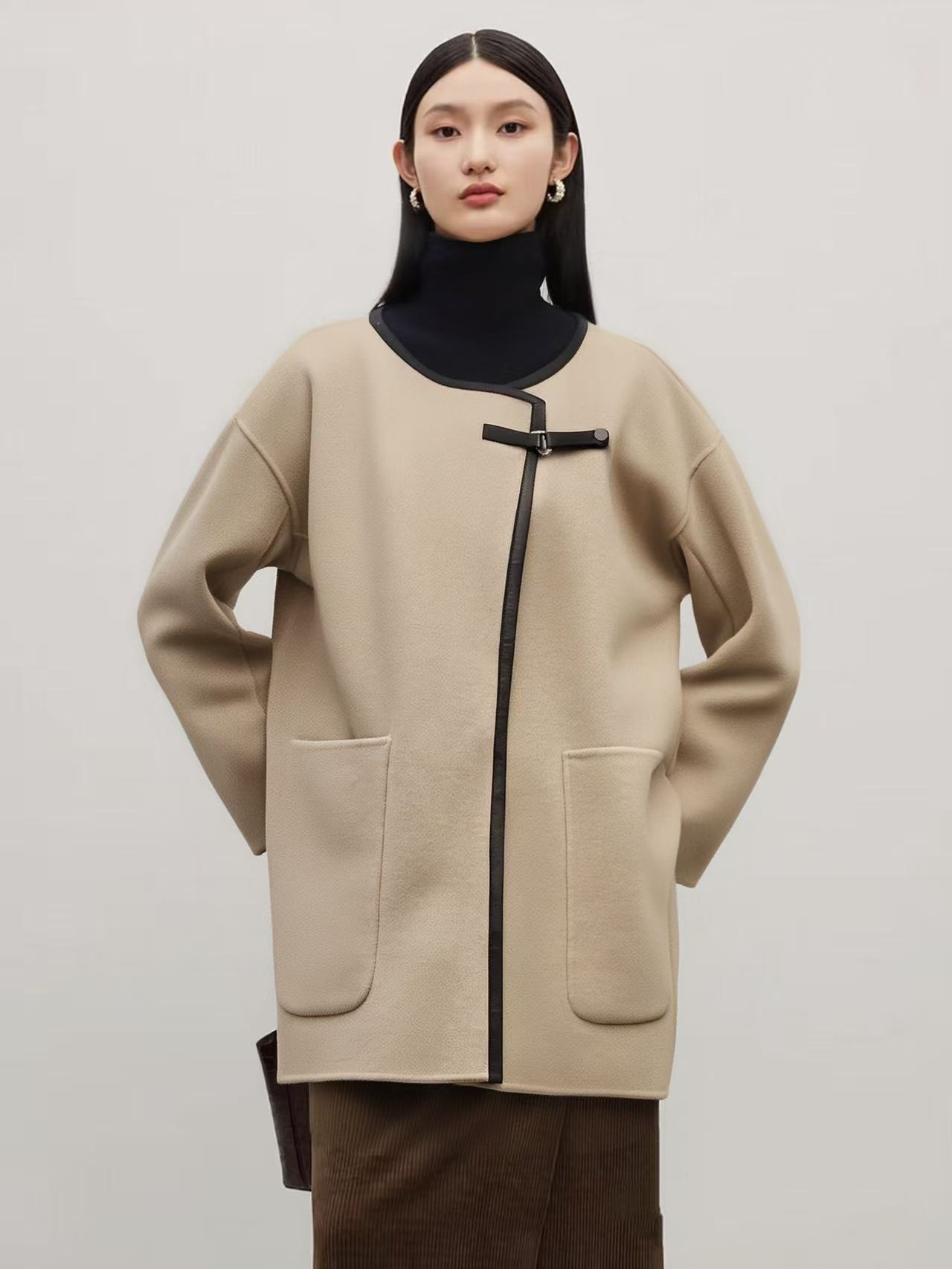 【高端系列】手工定制8503款5%山羊绒➕95%澳洲羊毛优雅皮扣包边双面尼中款大衣-喜出
