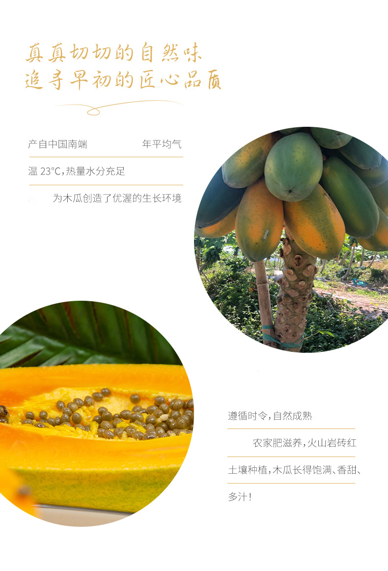 2. 木瓜发货为7-8分成熟的果子,收到表皮微黄即可食用,偏青的木瓜可自行催熟后再食用(过熟的木瓜容易坏且口感偏软,对影响口感)