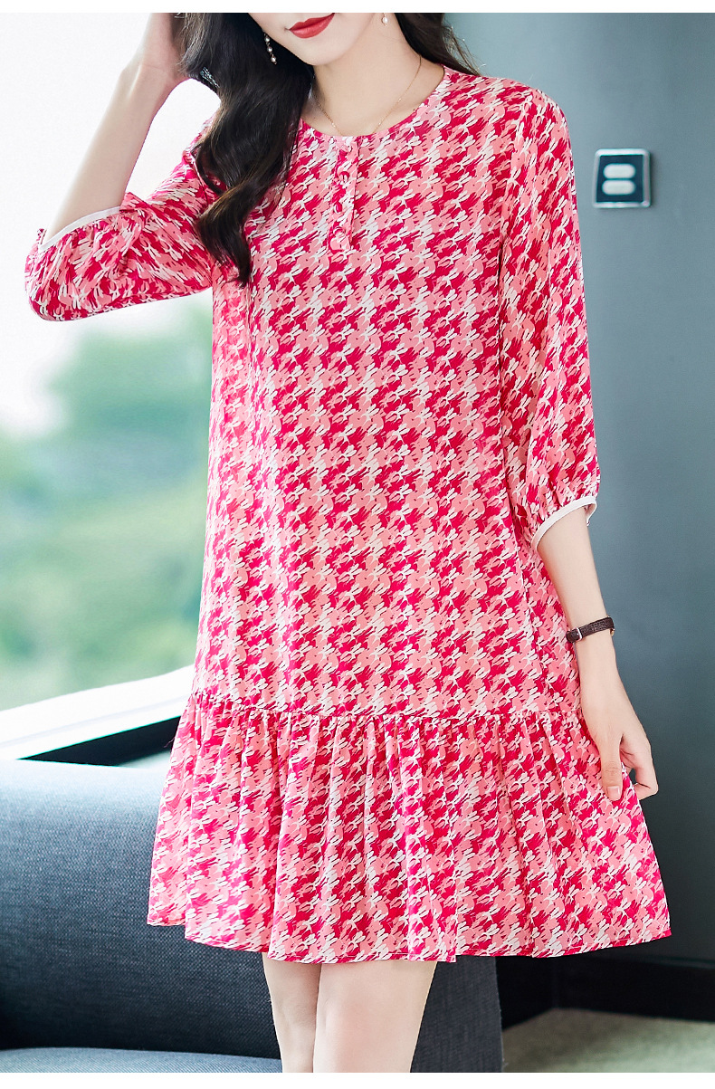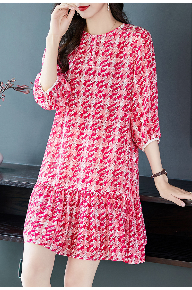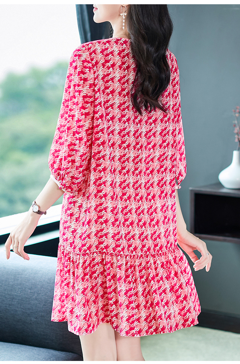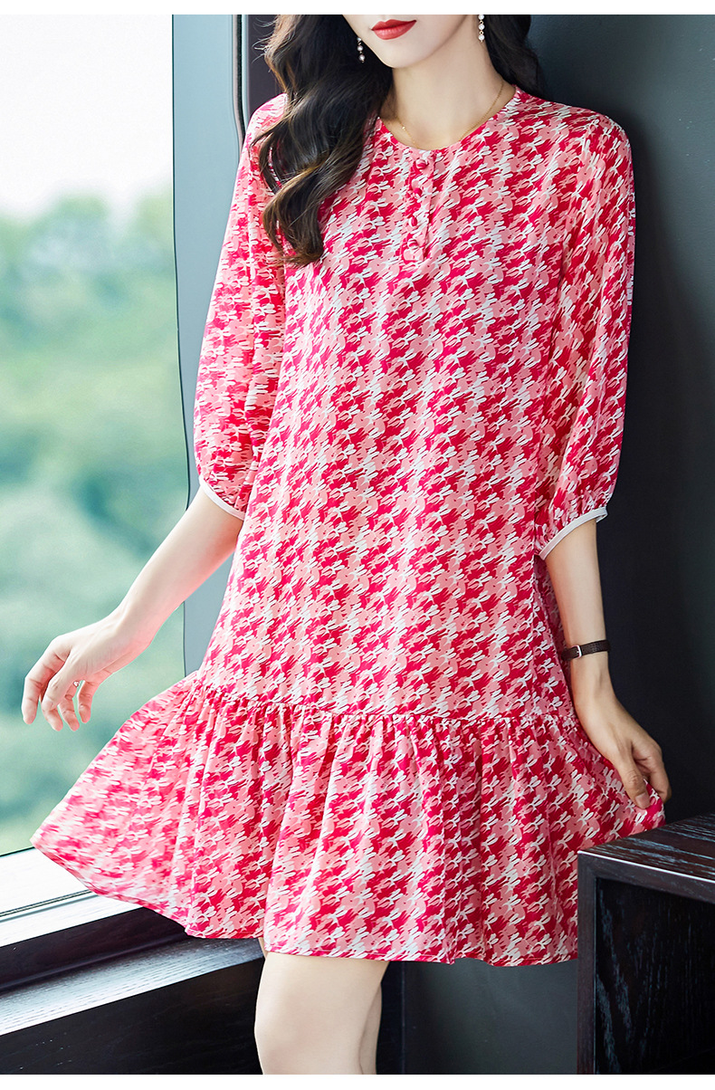 WWM-48807真丝双绉裙子荷叶边红色千鸟格小个子桑蚕丝连衣裙女夏