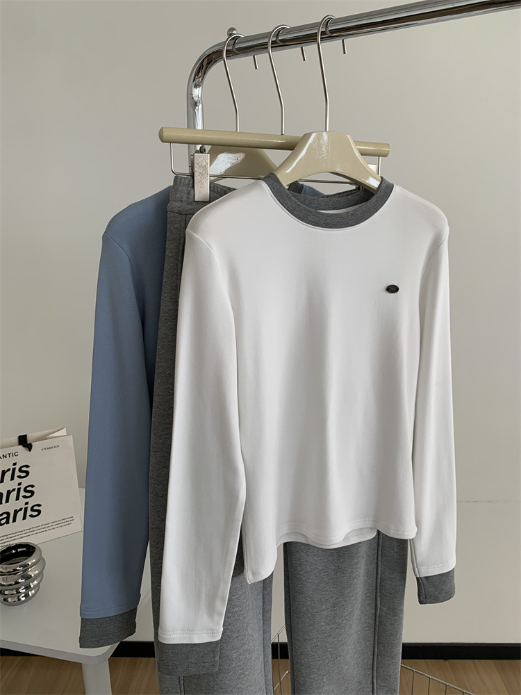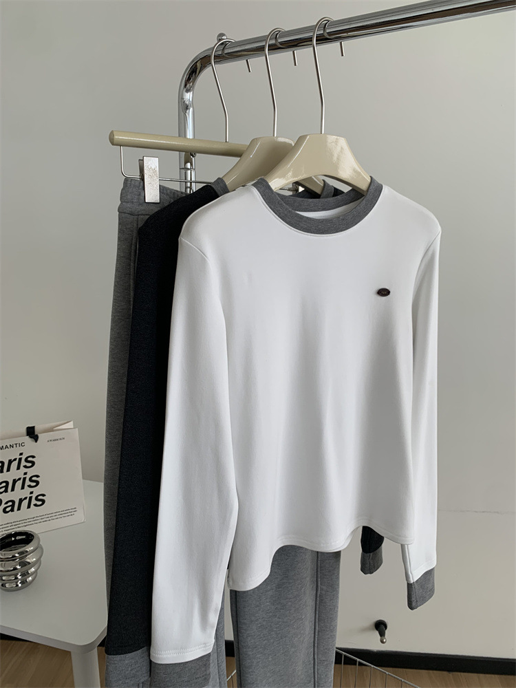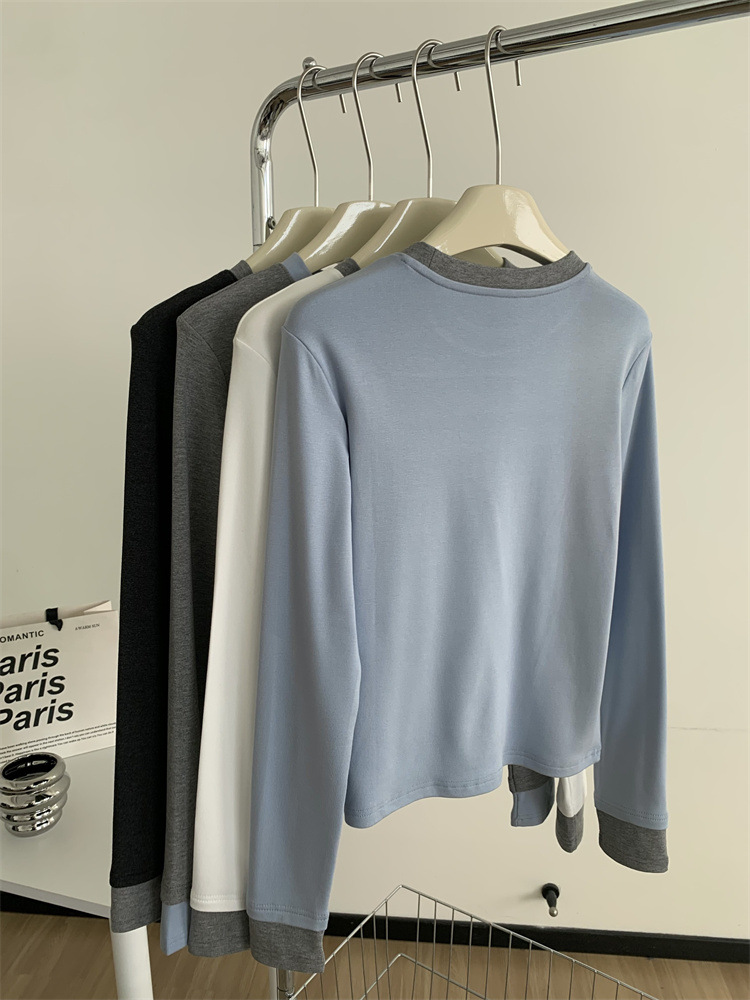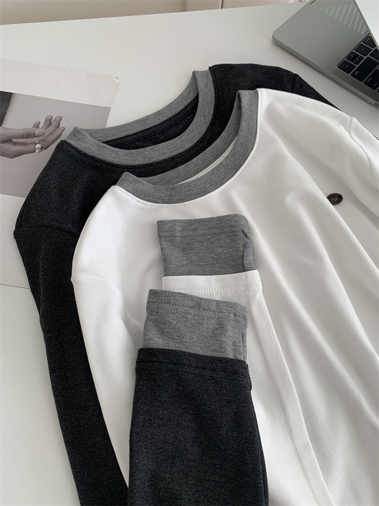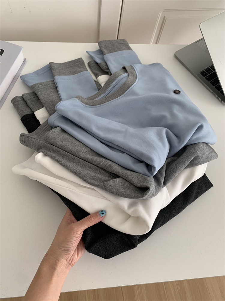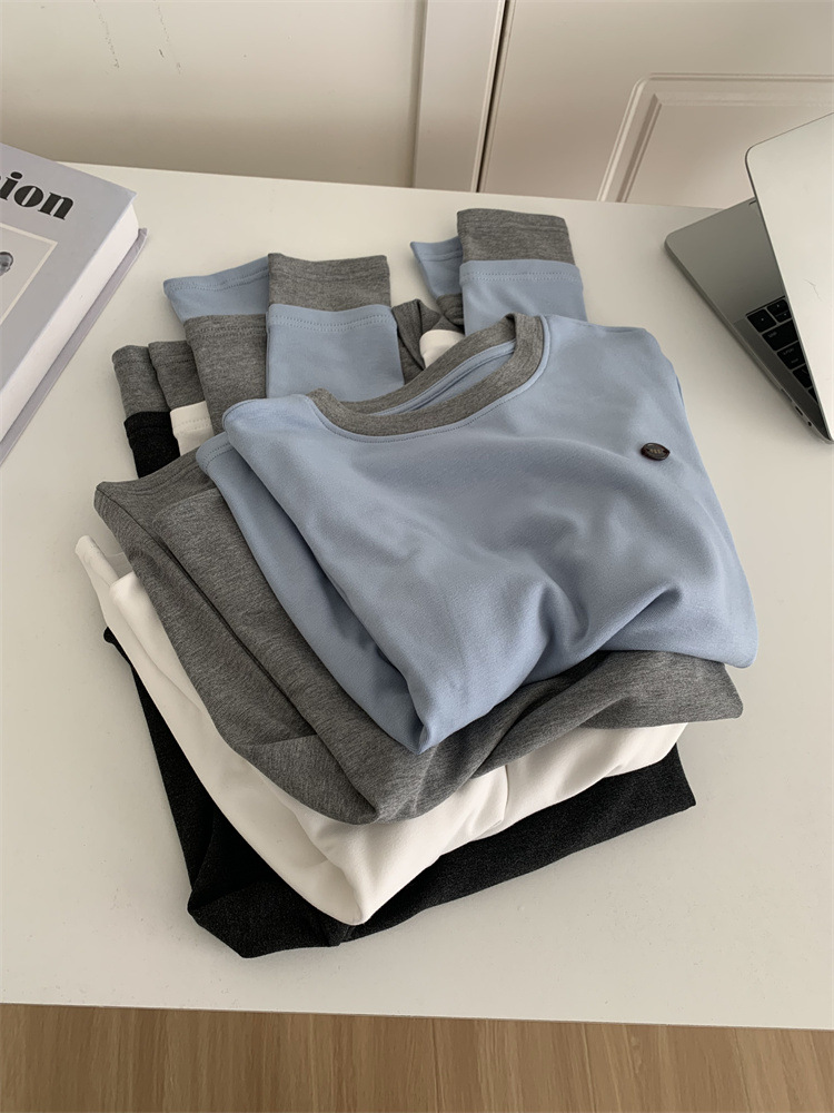 丁摩 拼色圆领长袖抓绒T恤女冬季钉扣仿羊绒加厚打底衫5ZF-3357