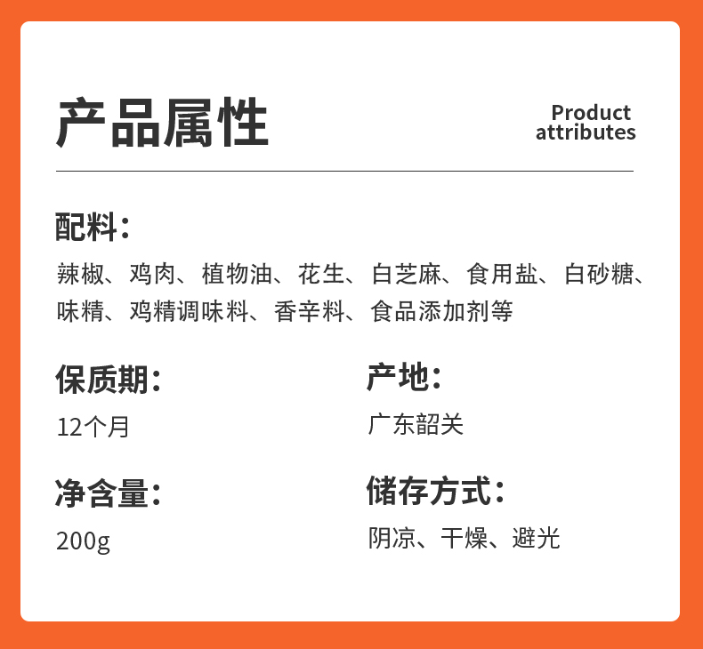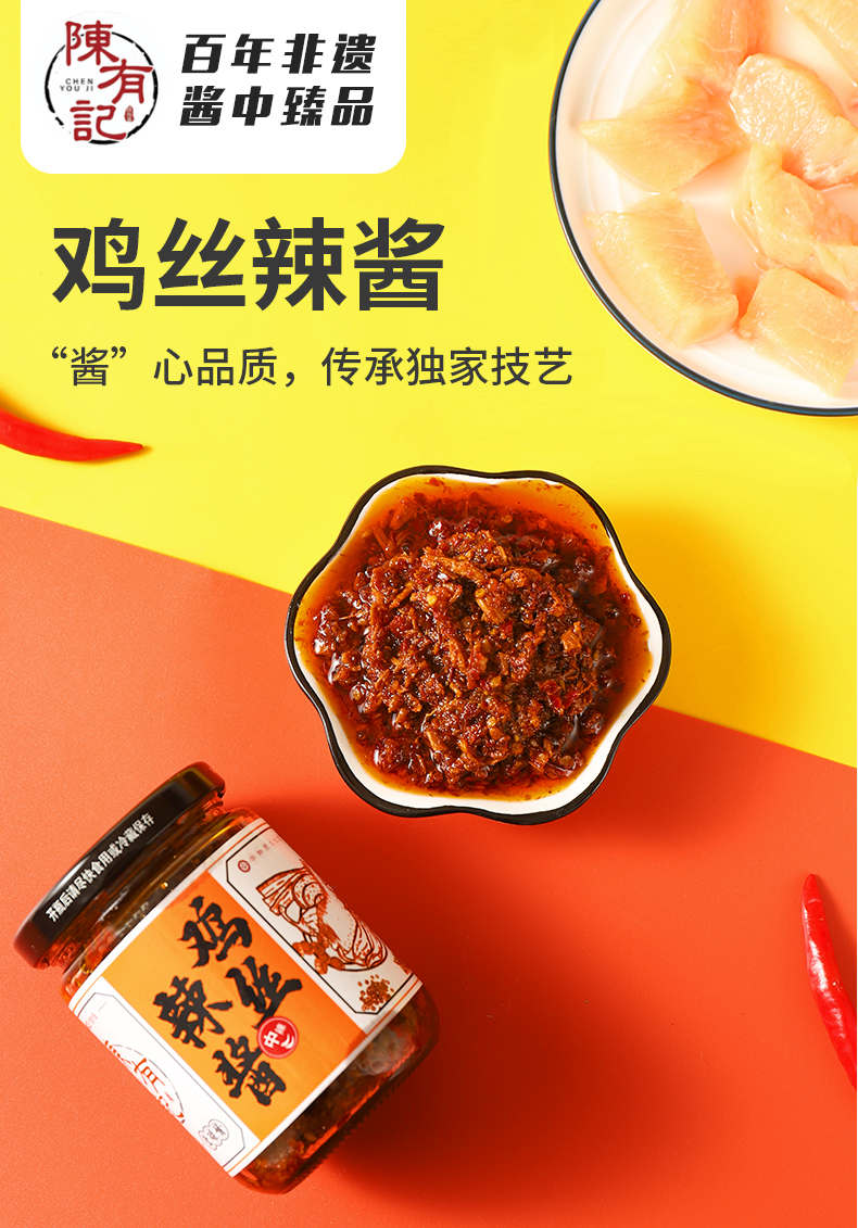 陈有记鸡丝辣椒酱200g/瓶,以优质的鸡胸肉为主要用料,加入了多种传统香辛料经慢火炒制而成,满口是肉,却油而不腻,鲜香辣脆,层次丰富