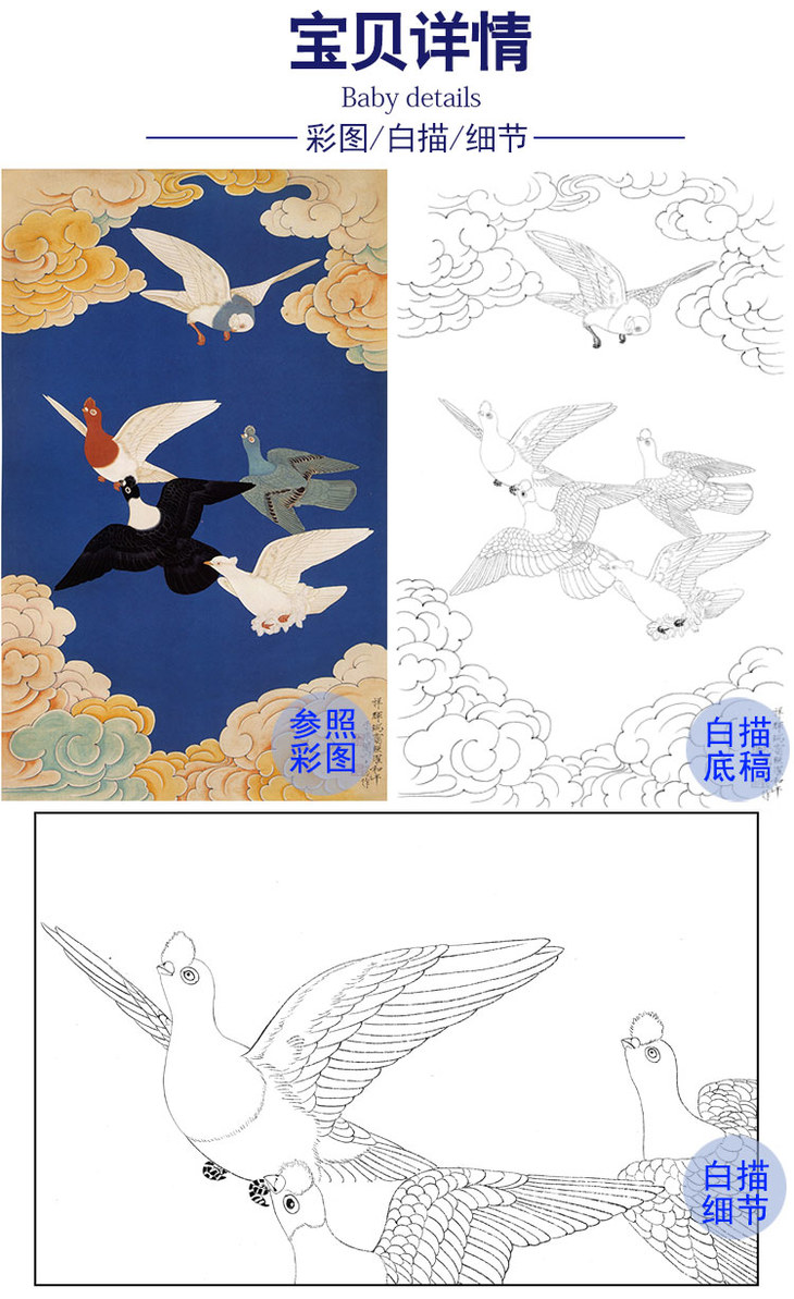 于非闇竖幅工笔花鸟白描底稿-鸽子-《瑞霭和平》-多种白描尺寸可选-YF84