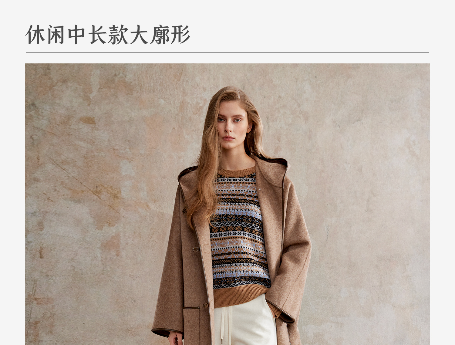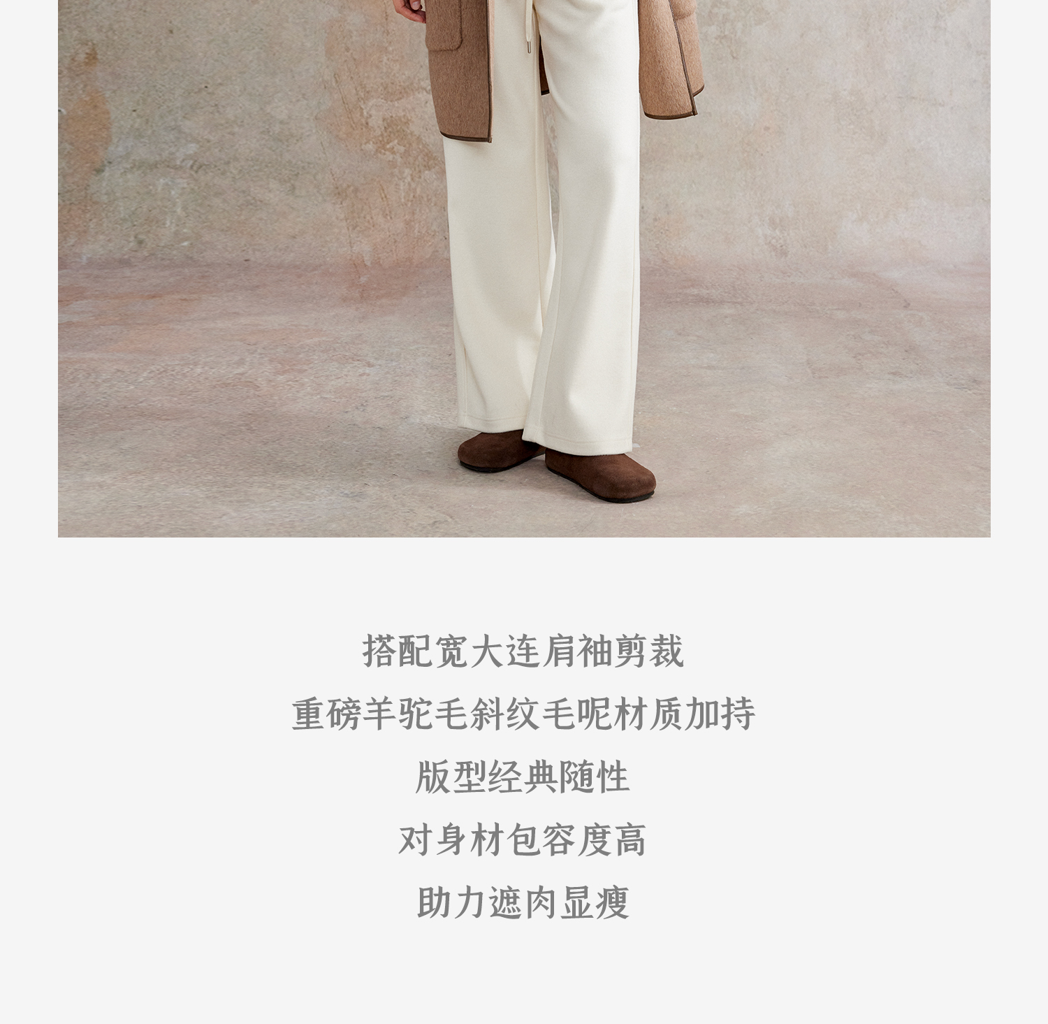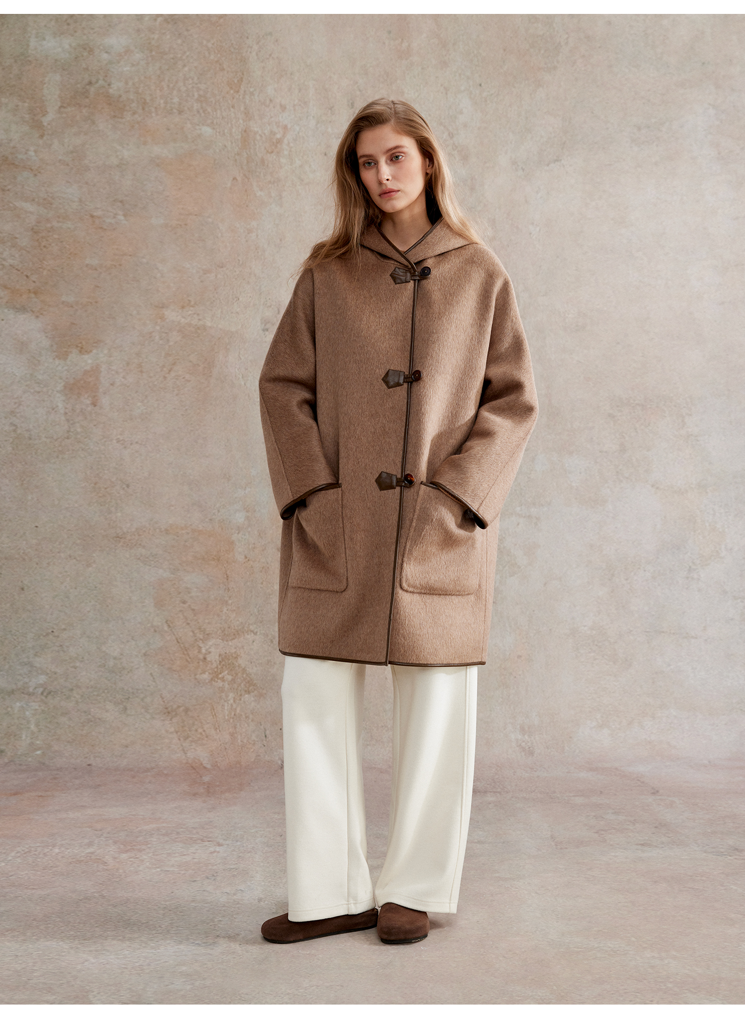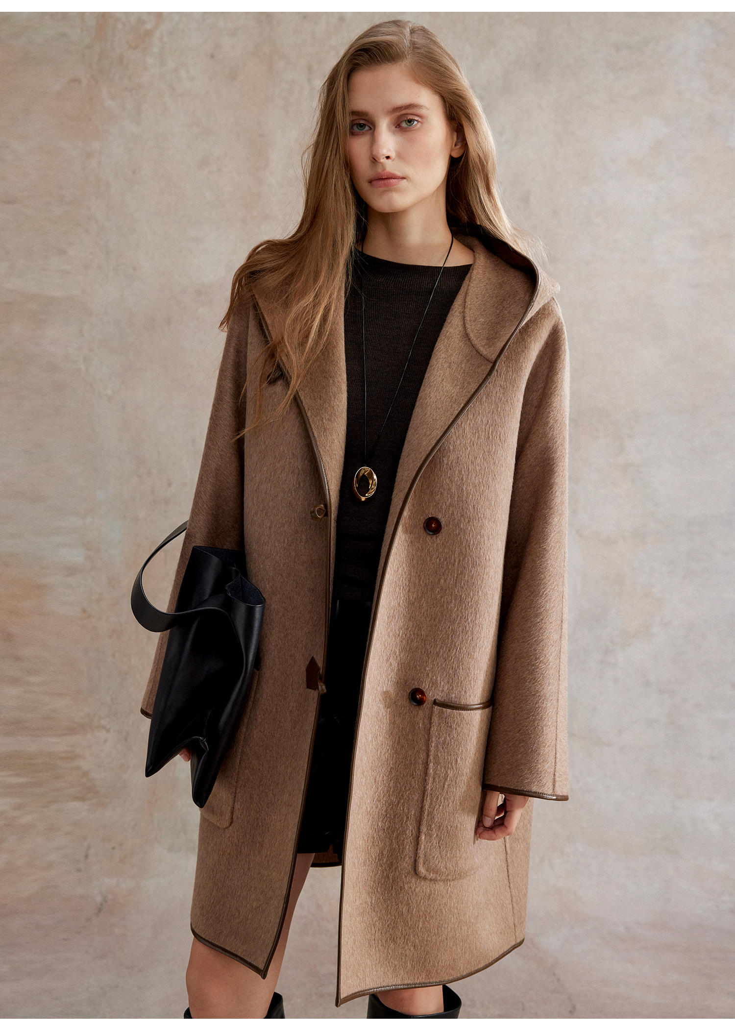 骆驼绒羊毛牛角扣中长款连帽重工皮包边毛呢大衣DY2504029