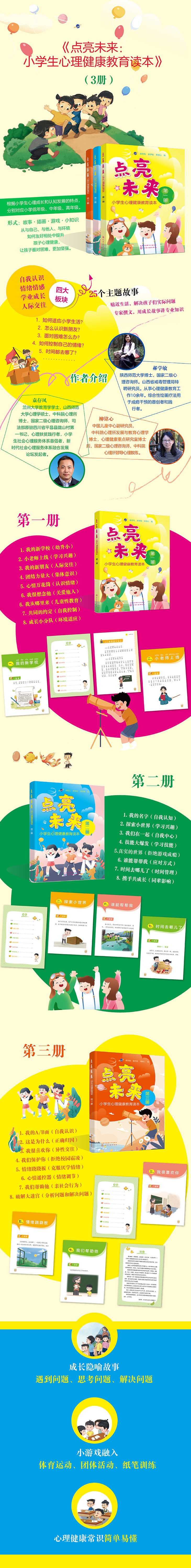 根据小学生心理成长和认知发展的特点,我们将全书分为3册,每册主题包括自我认识、情绪情感、学业成长、人际交往四个大类。每个类别中根据学龄特点选取1-3个主题,以“故事+插画+游戏+小知识”的体例来进行编写。