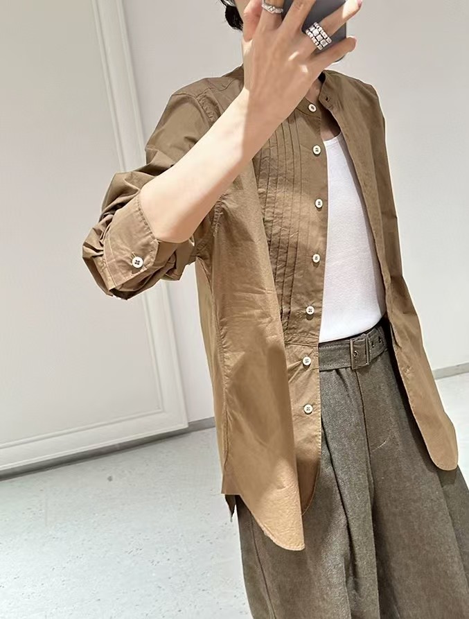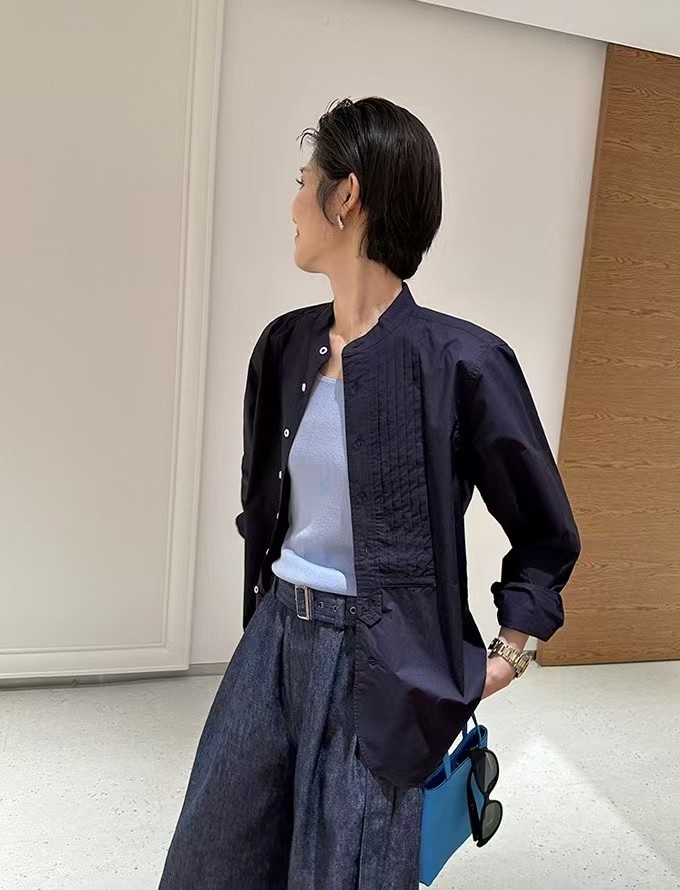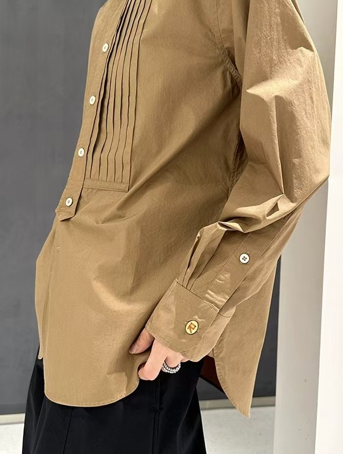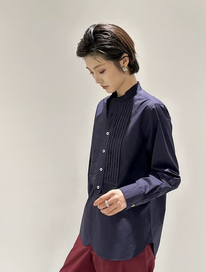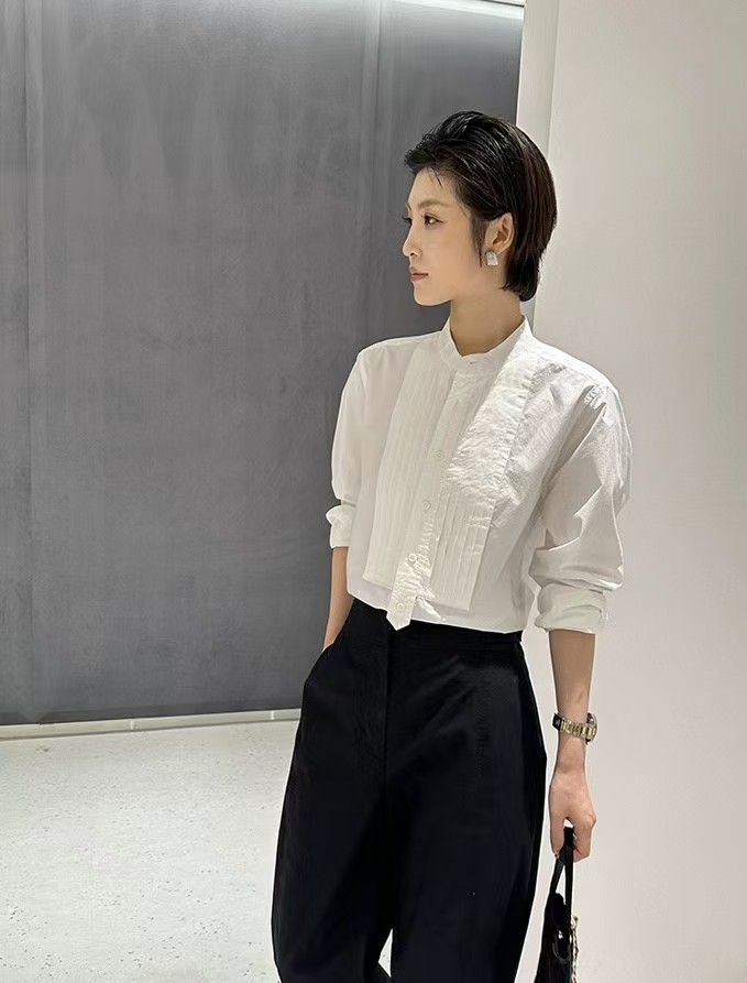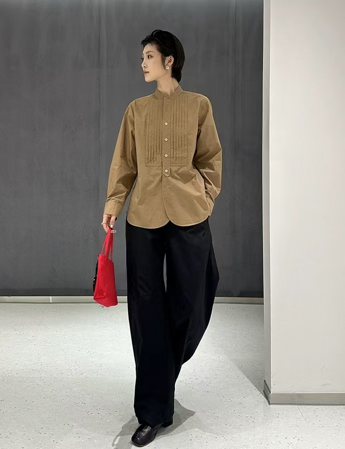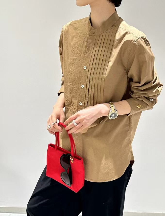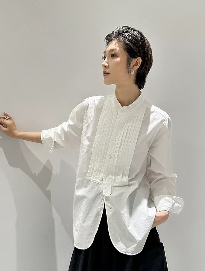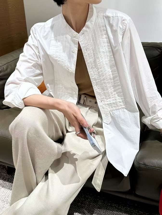 搭配性也会更高一些,整个款式是经典的小立领搭配胸前双组风琴褶设计,层次感拉满!手工将一根一根的褶皱高温熨烫以及缝纫定型的打褶设计,赋予这件衬衣独特的风格,简洁、大气!和T恤叠穿搭配阔腿裤穿出来是很休闲又随性的感觉