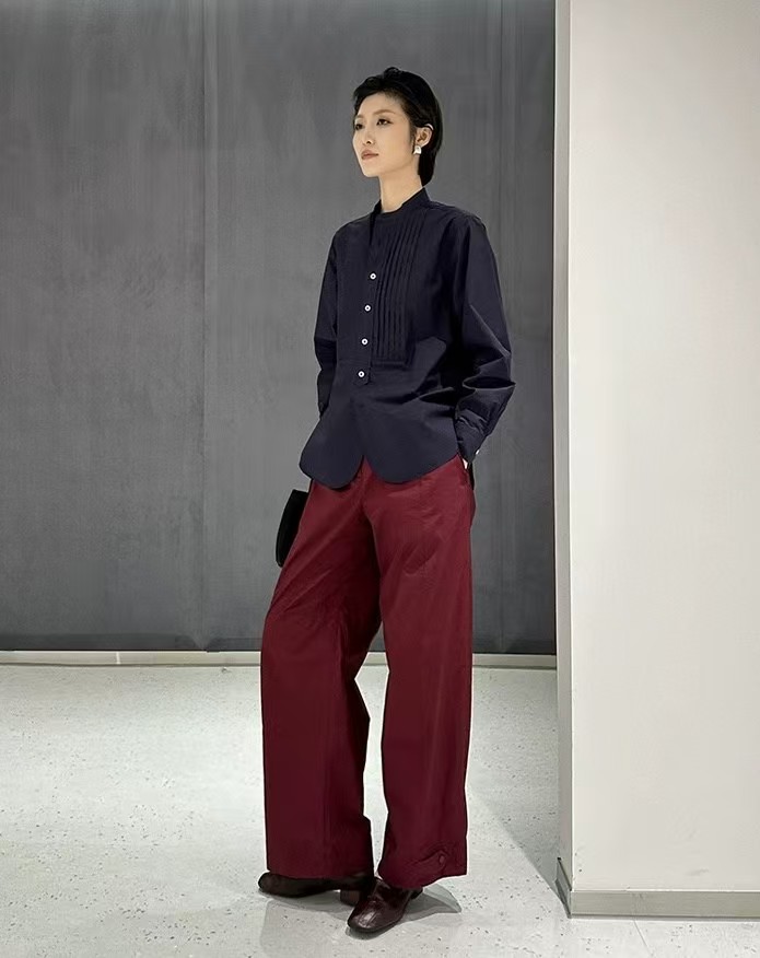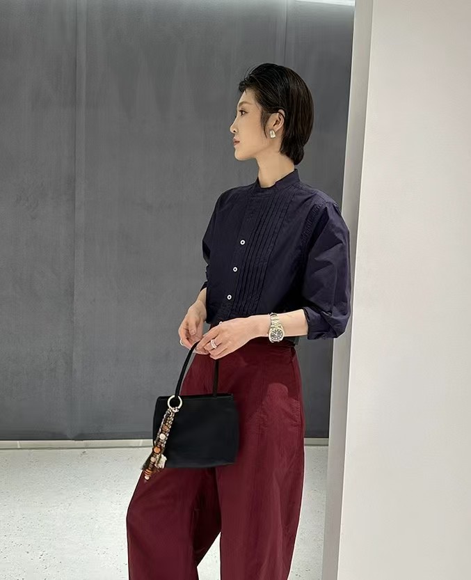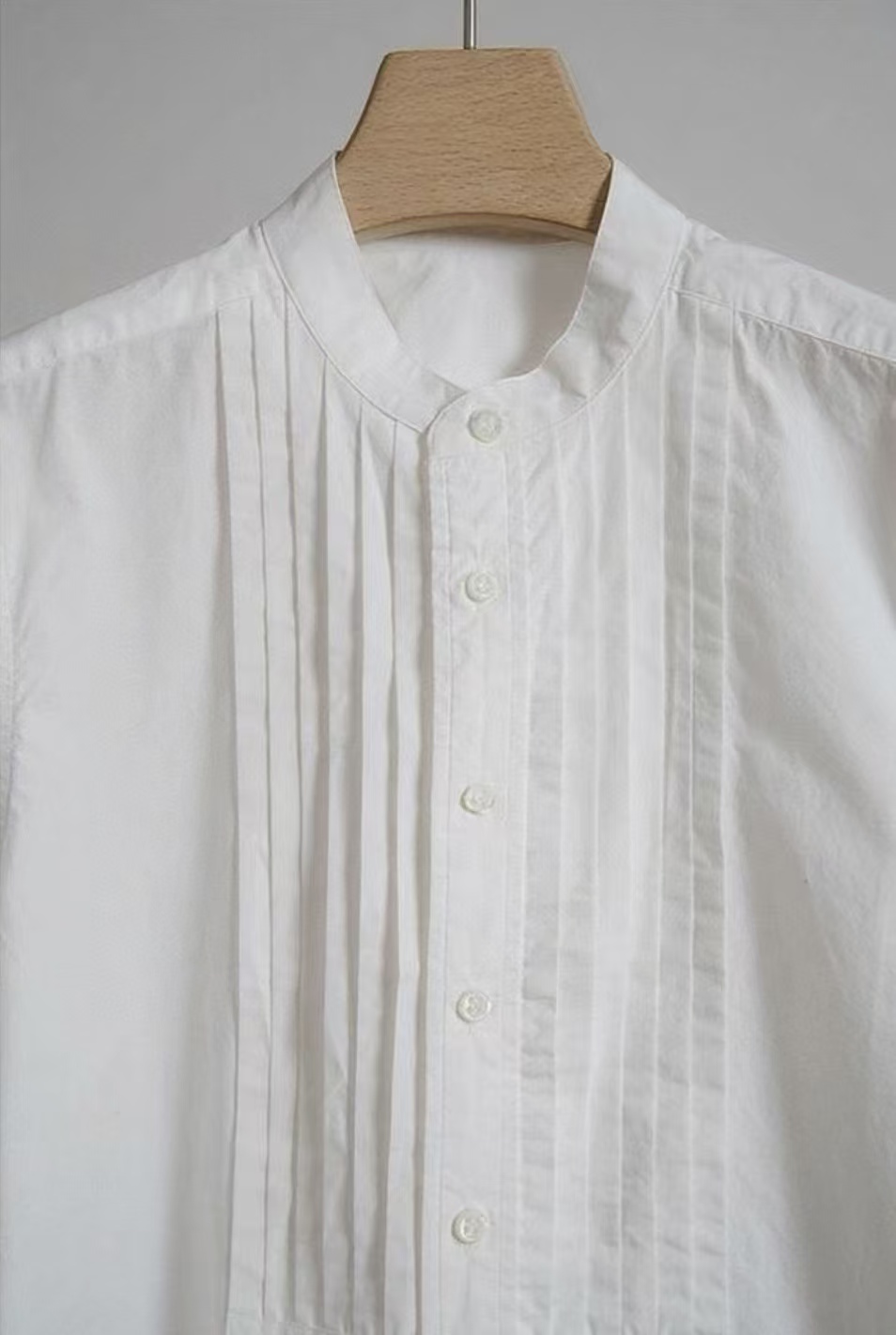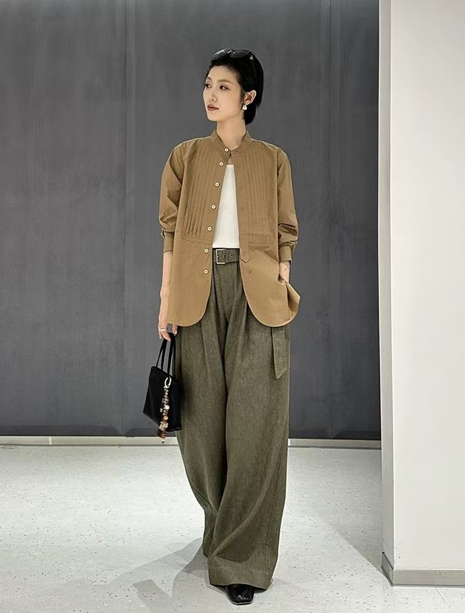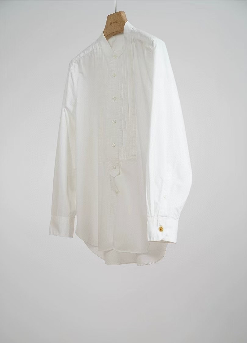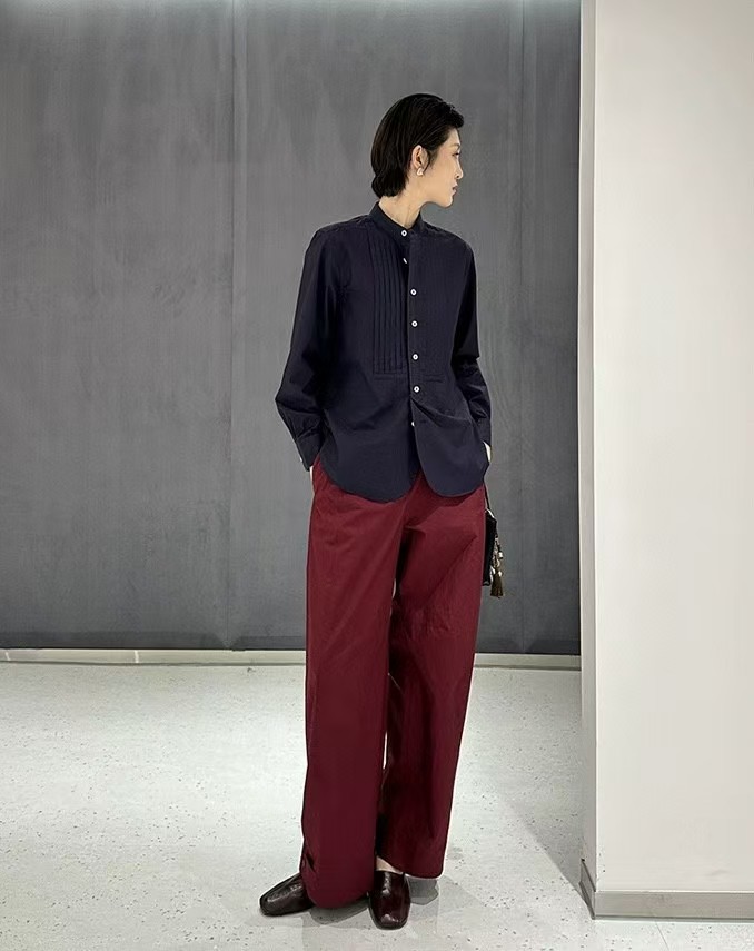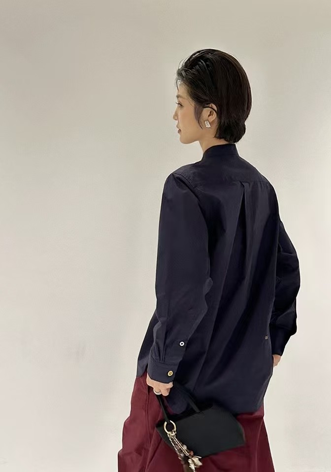 搭配性也会更高一些,整个款式是经典的小立领搭配胸前双组风琴褶设计,层次感拉满!手工将一根一根的褶皱高温熨烫以及缝纫定型的打褶设计,赋予这件衬衣独特的风格,简洁、大气!和T恤叠穿搭配阔腿裤穿出来是很休闲又随性的感觉