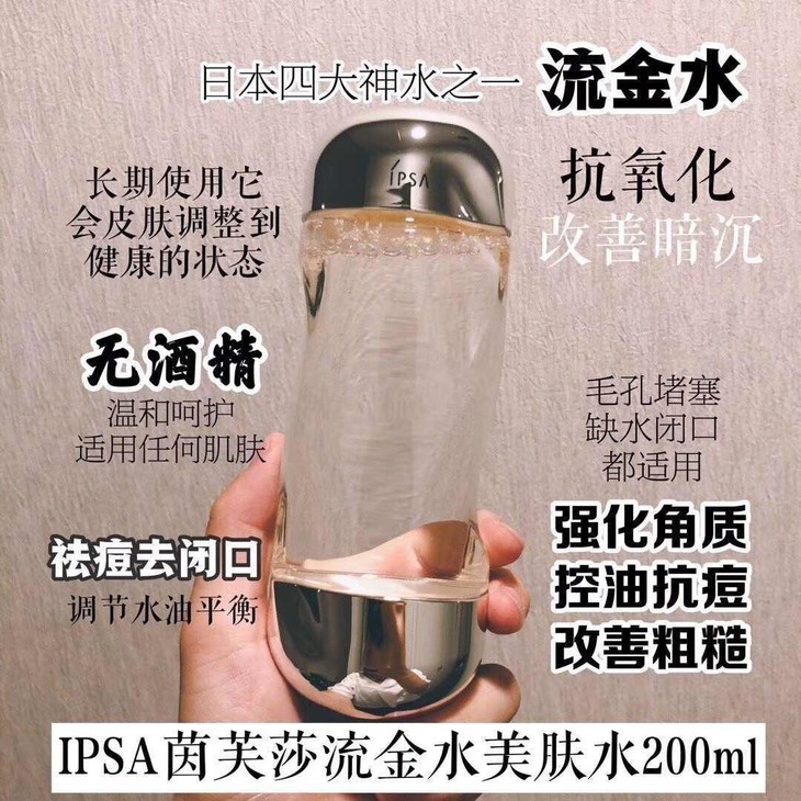 日本本土IPSA流金水~去闭口神器 IPSA流金水,号称最适合亚洲女性的水!👍🏻这款水水强调高保湿💦和明亮肤色,👸🏻添加了一个促进代谢的成分,🍀可以改善粗糙、预防堵塞、🔯毛孔等现象,并可以预防成人粉刺,属于高机能又温和的一款化妆水。🌸这个水补水保湿效果属于“清润型💦”,好吸收,涂再多都不会粘腻🎈,补水后的皮肤有种充盈的满足感;👏🏻使用2周,明显能够感觉到皮肤变得嫩滑、明亮,毛孔细致了😍,没有以前那么容易长黑头、粉刺、暗粒之类的东西👻👻