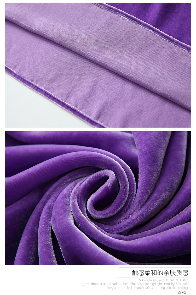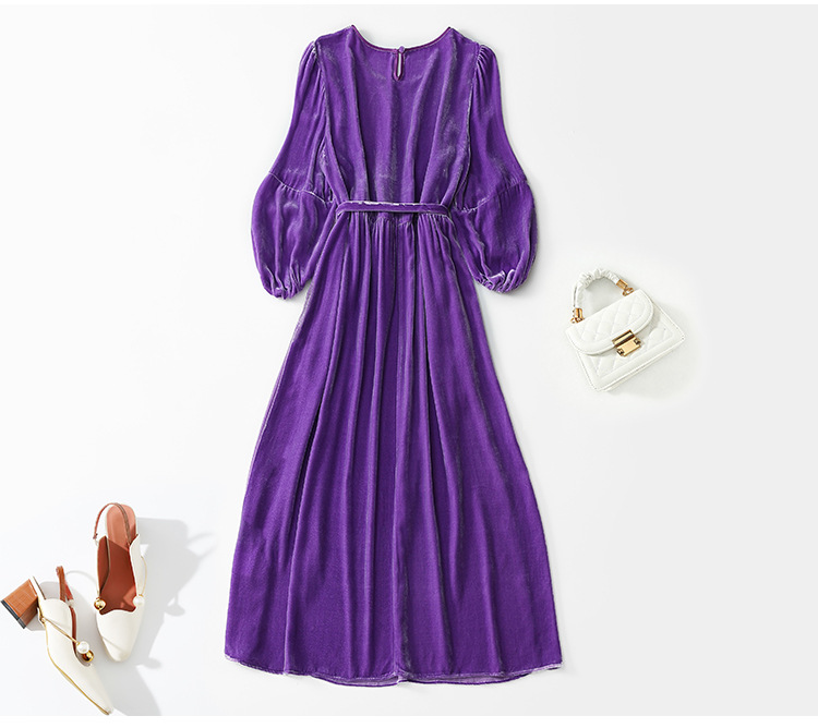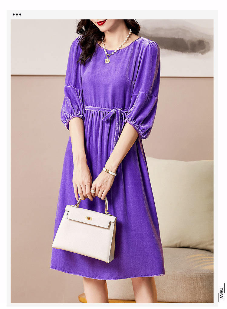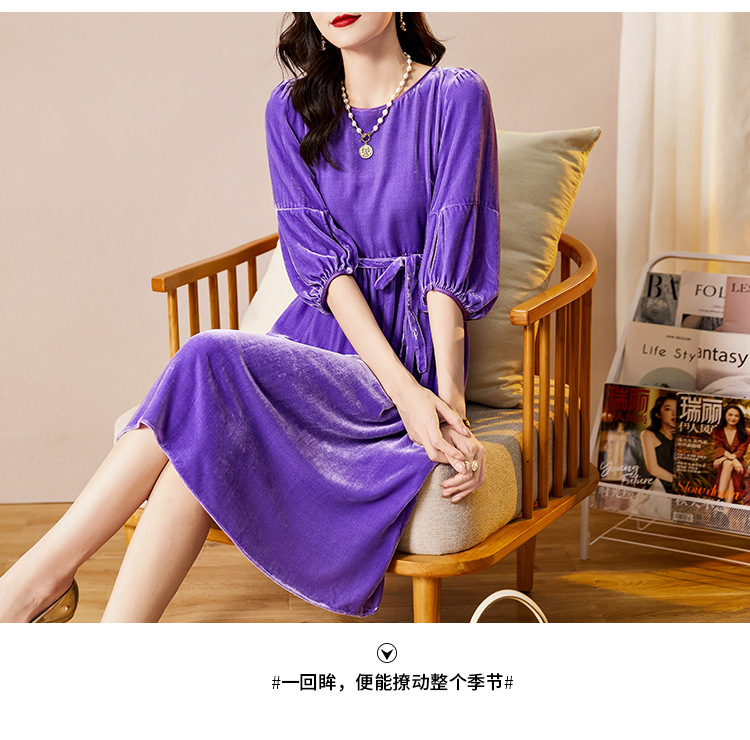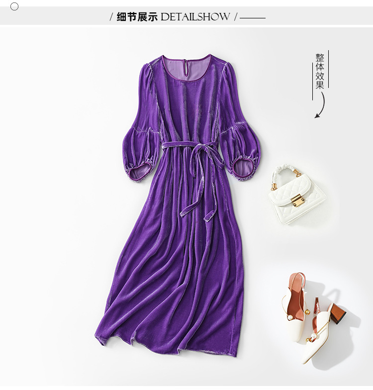 丁摩 秋冬女装纯色真丝丝绒连衣裙收腰配腰带细绳七分袖4ZF-90040