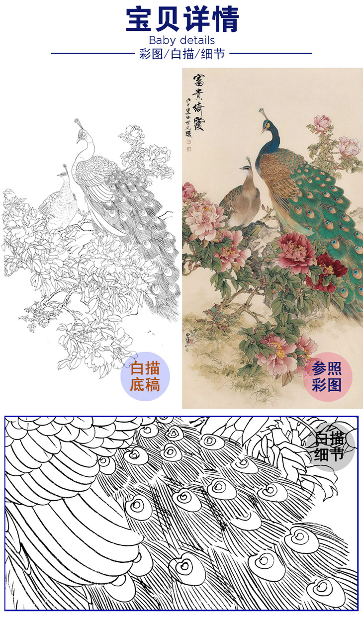 竖幅工笔花鸟白描底稿-田世光-牡丹孔雀-《富贵绮霞》-A081