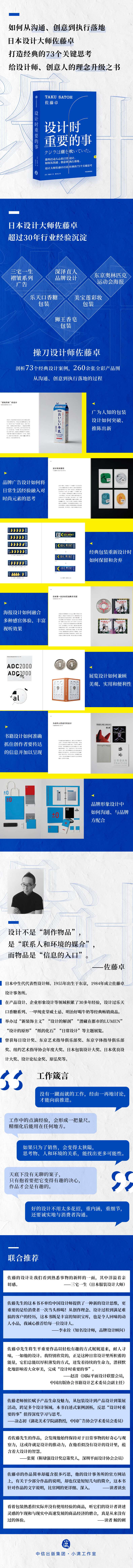 佐藤卓先生将生平重要作品以轻松有趣的方式娓娓道来,耐人寻味,一如他的设计。我特别欣赏的,正是这种日常设计里所积蓄的能量,它们总能以厚积薄发的方式,迸发着持续的生命力,潜移默化地影响着大众审美,完成“设计时重要的事”。