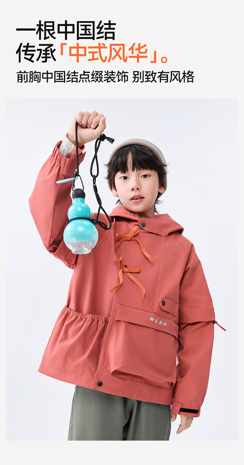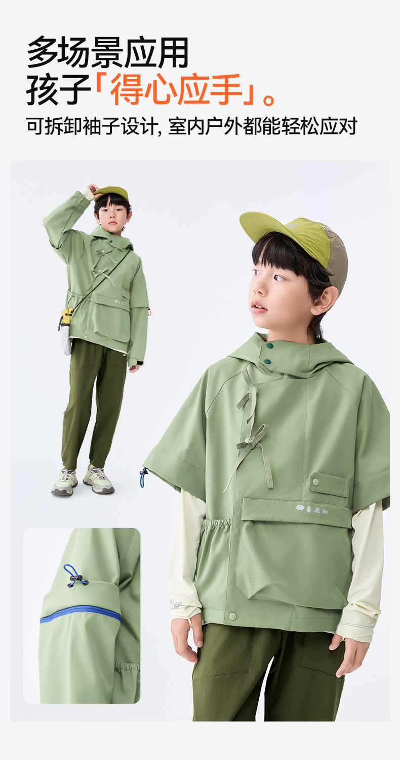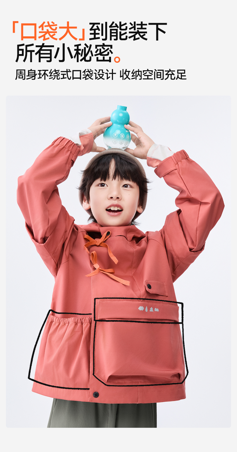 防泼水设计,突发小雨也不慌不乱;袖口可调节魔术贴,松紧自由;超大容量口袋,实用储物空间