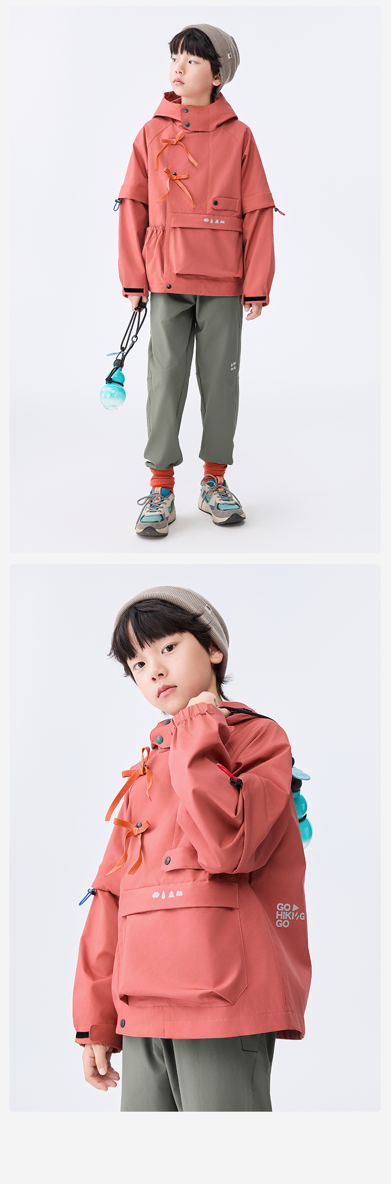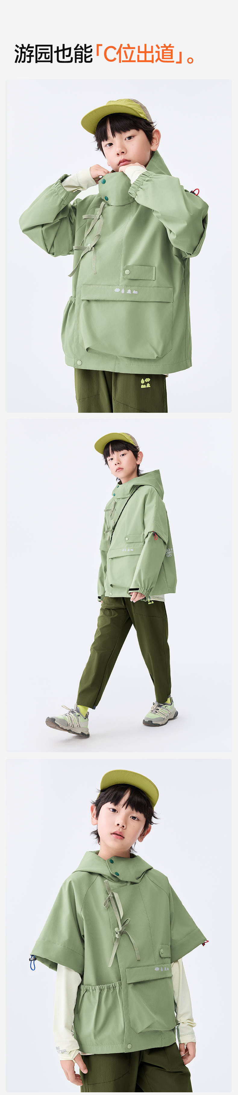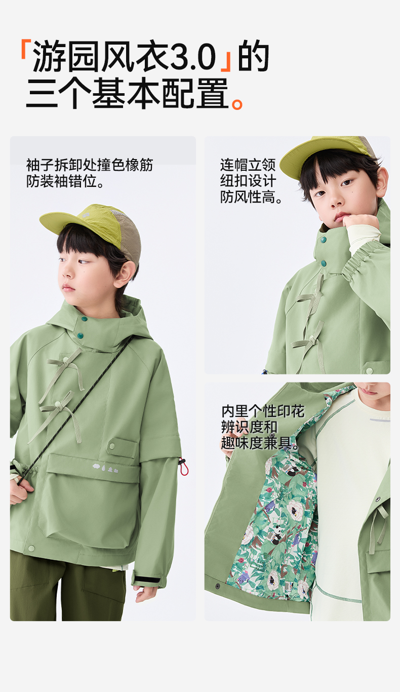 防泼水设计,突发小雨也不慌不乱;袖口可调节魔术贴,松紧自由;超大容量口袋,实用储物空间
