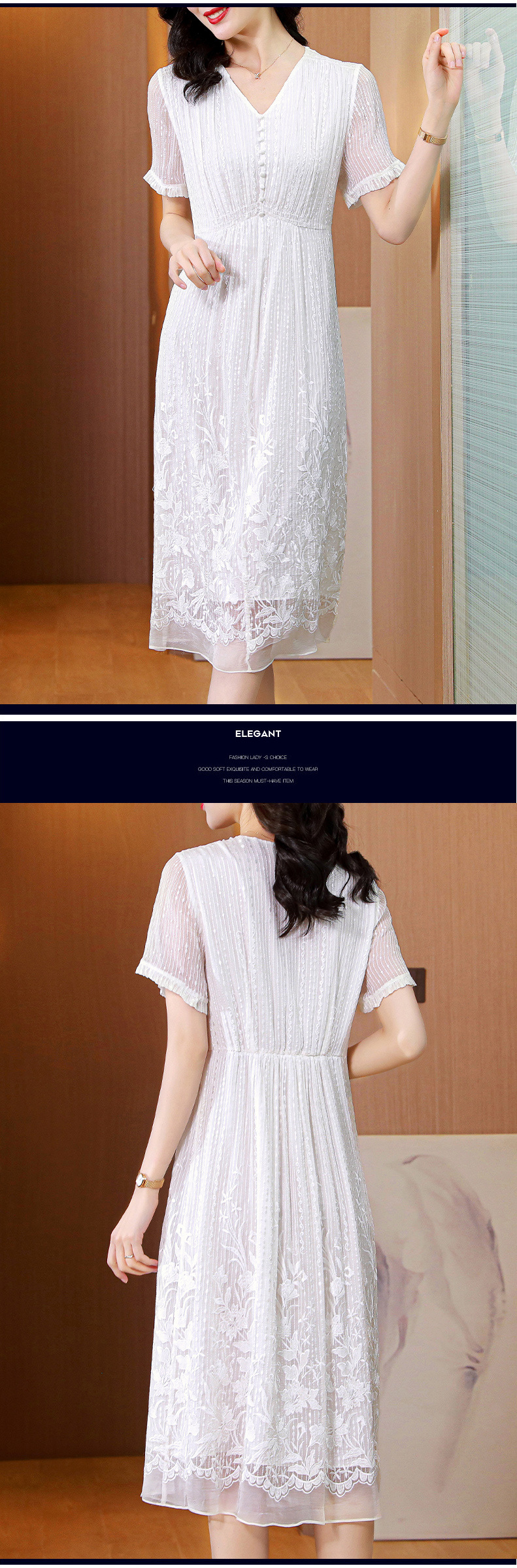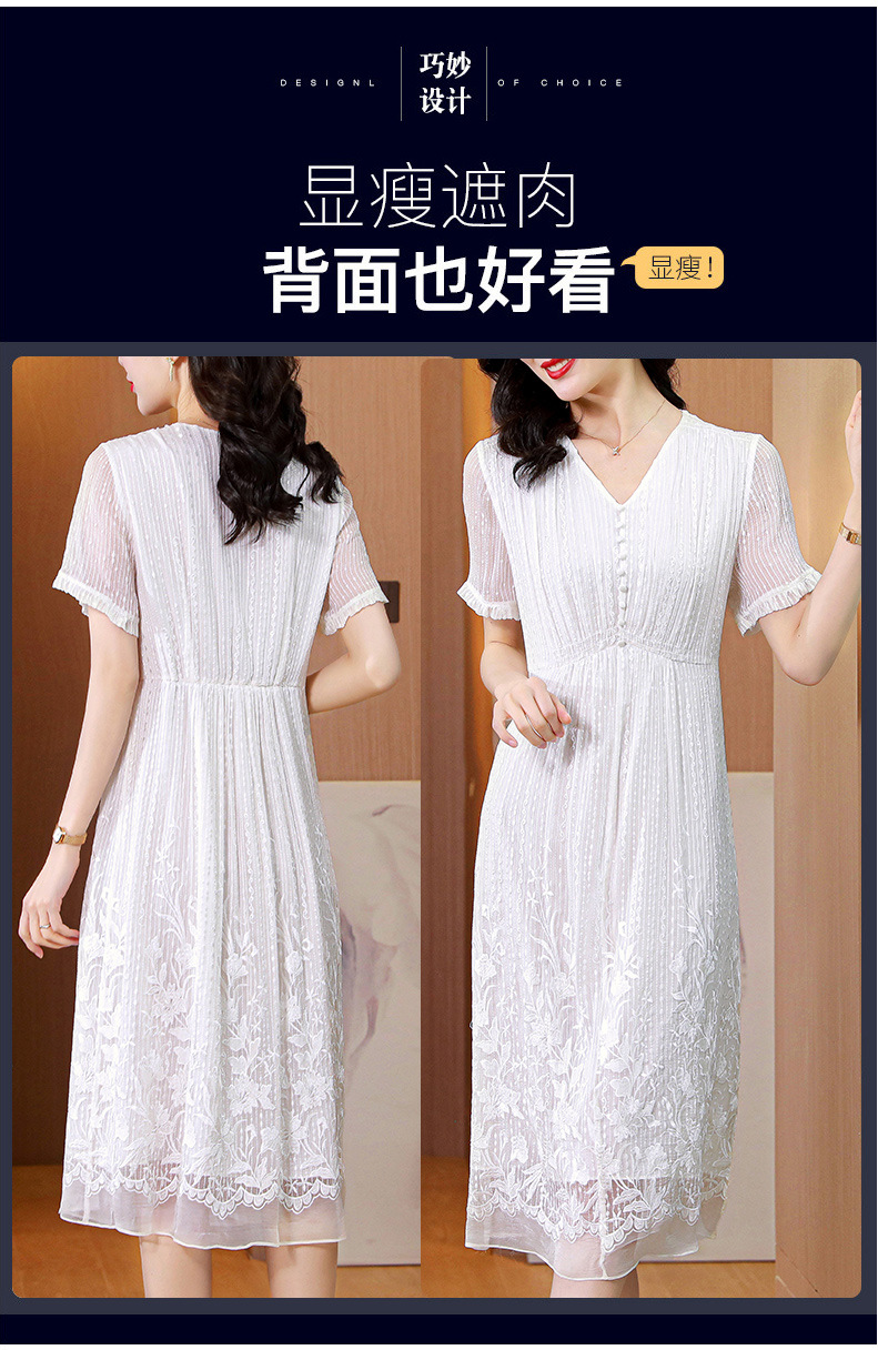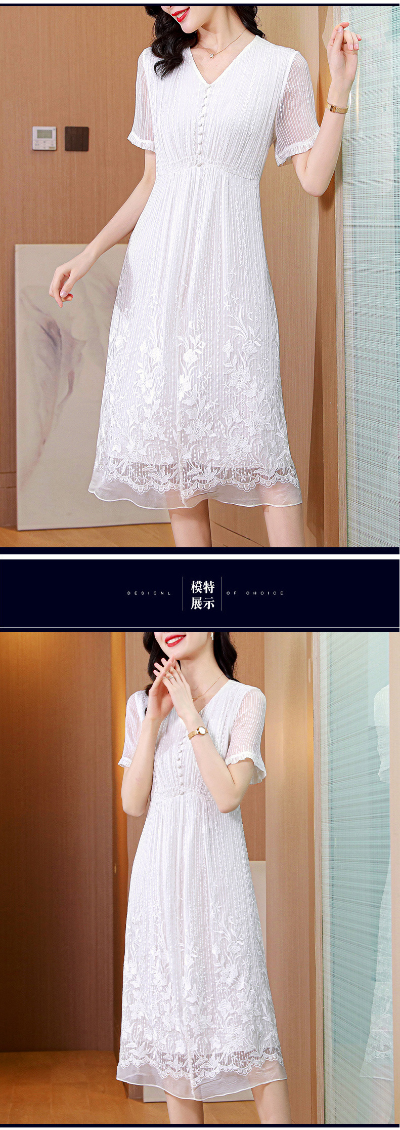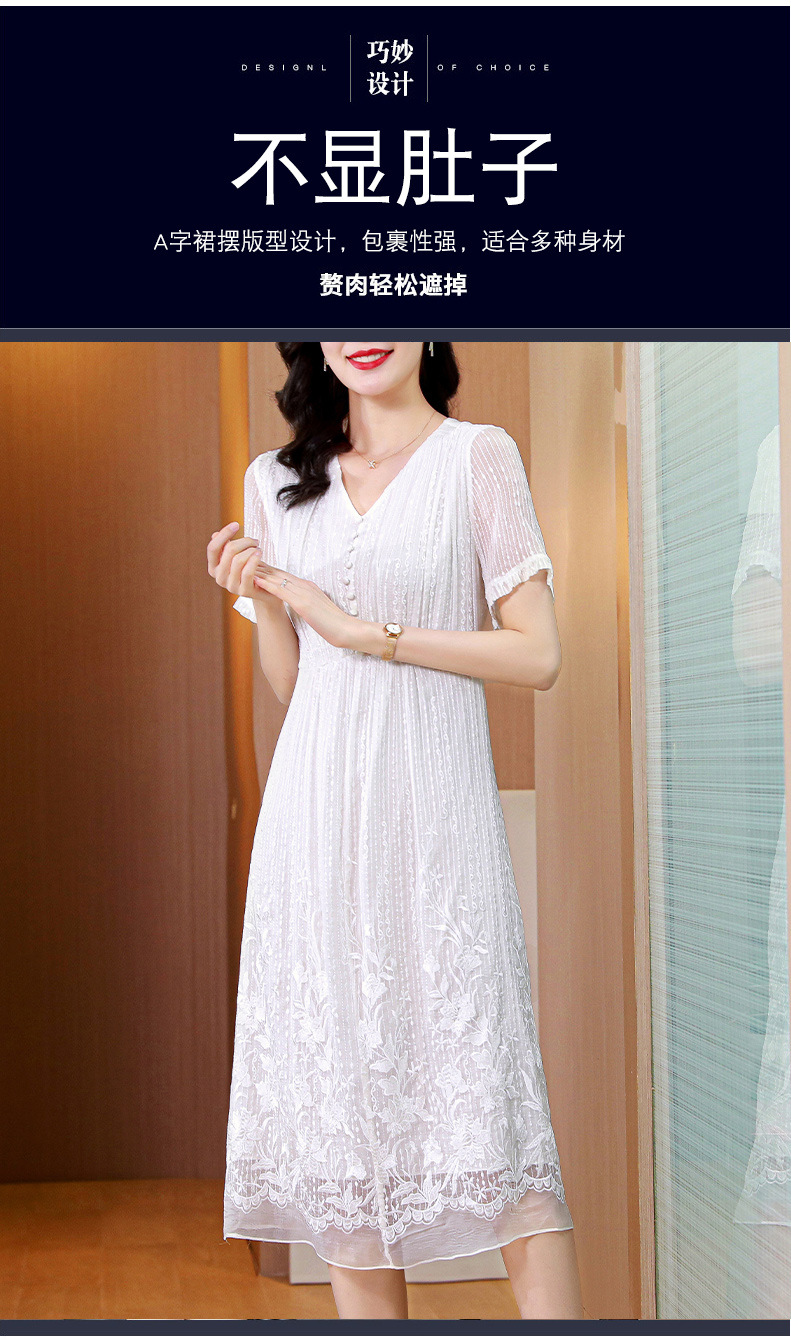 短袖薄款,刺绣V领气质减龄中长款真丝连衣裙KQN-B21010