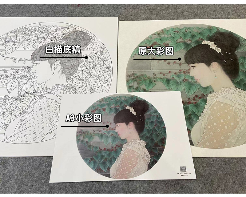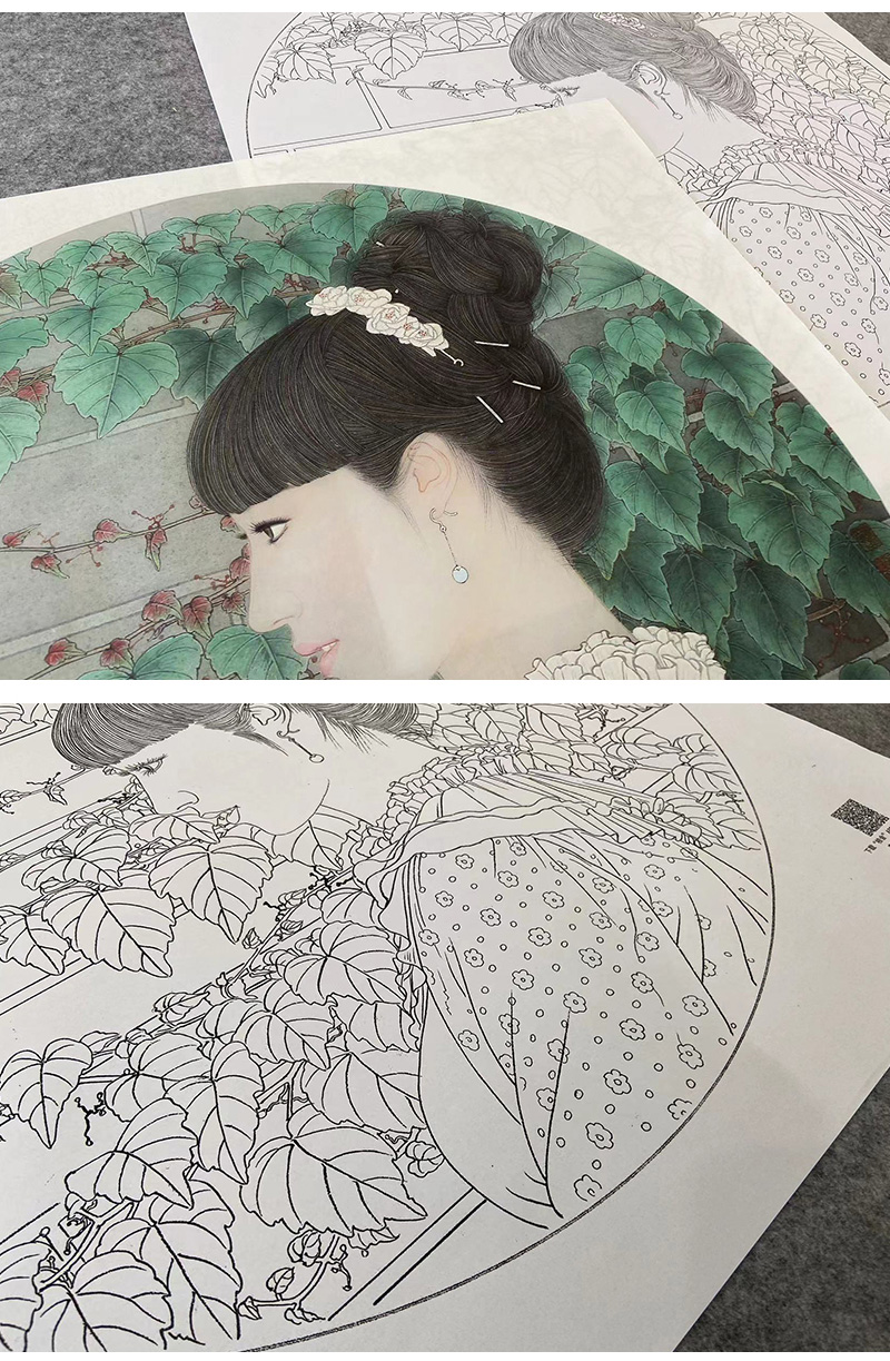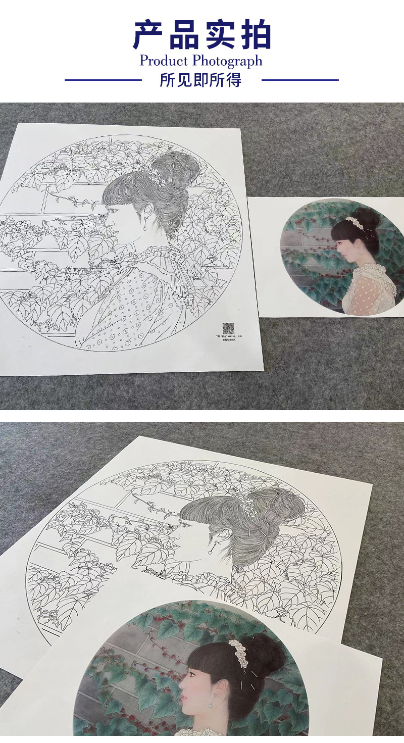 【大彩图】盘虎杰工笔画白描底稿圆形小品《清夏》现代人物高清打印稿HJ29