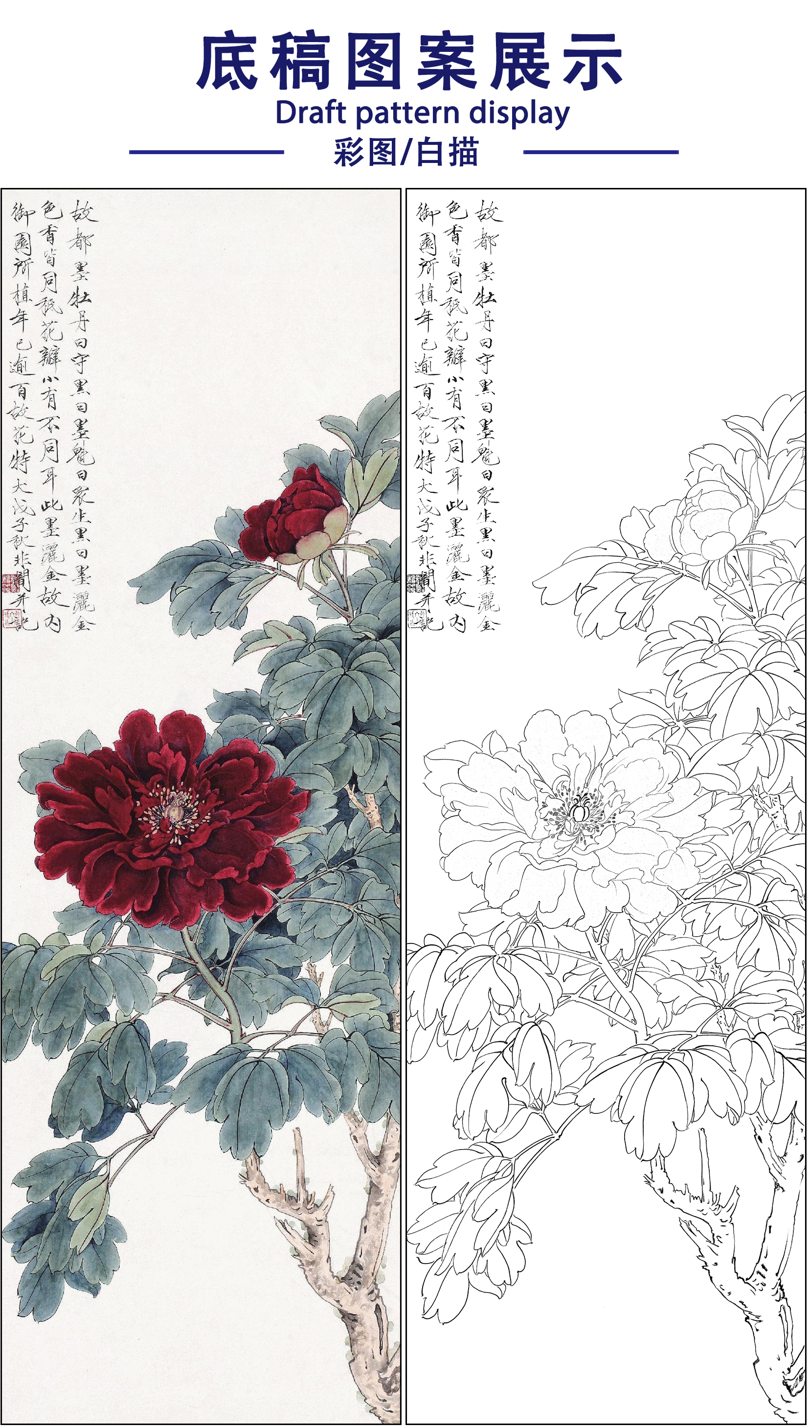 工笔画白描底稿于非闇花鸟牡丹《国色天香》临摹勾线高清打印稿FA49