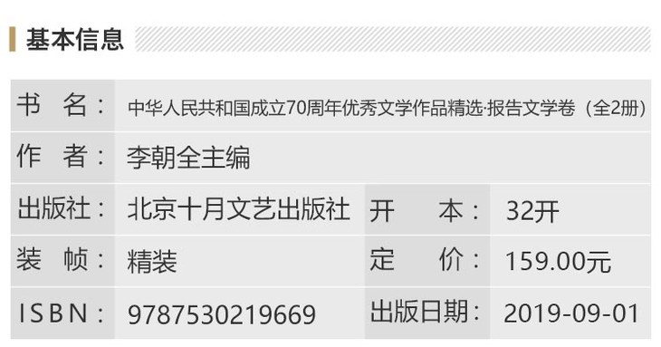书名:***人民共和国成立70周年***文学作品精选·报告文学卷(全2册)