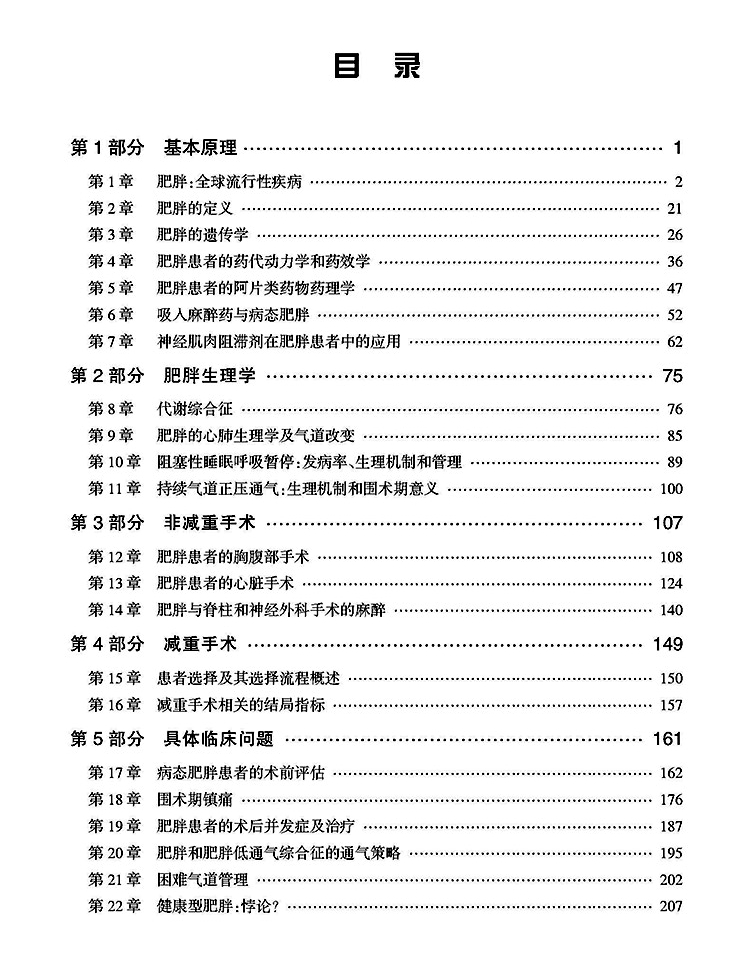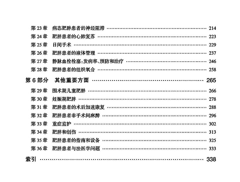 全面性:覆盖该学科的各个方面,包括肥胖的基础理论知识、肥胖生理和药理学改变、减重及非减重手术与麻醉管理、肥胖患者的临床特殊问题处理,以及肥胖在儿科、产科、重症监护和创伤科中所引起的麻醉挑战等。