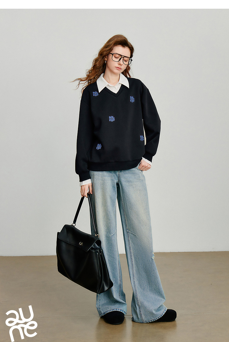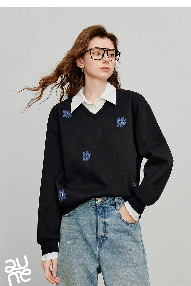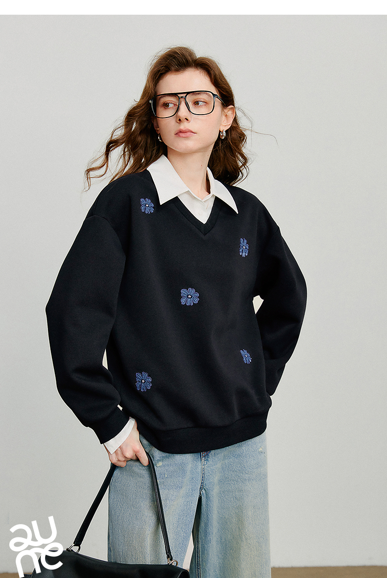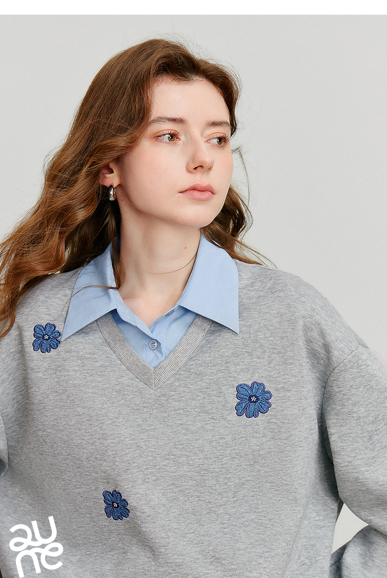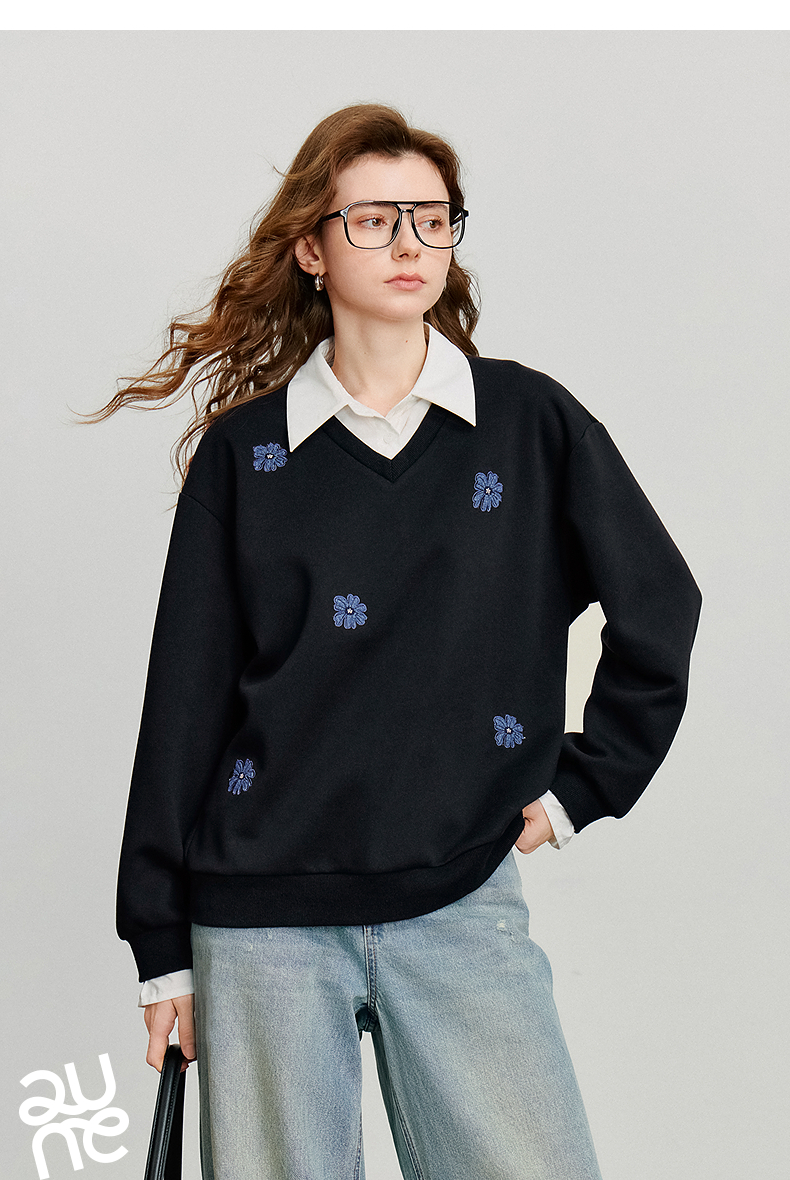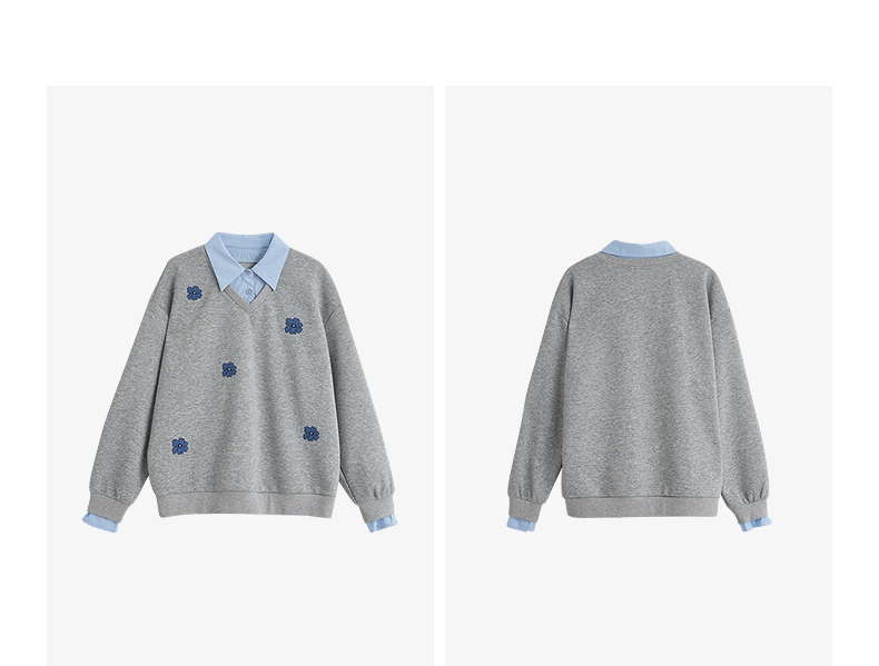 初语上衣女新款智性牛仔花棉质假两件休闲衬衫拼接卫衣