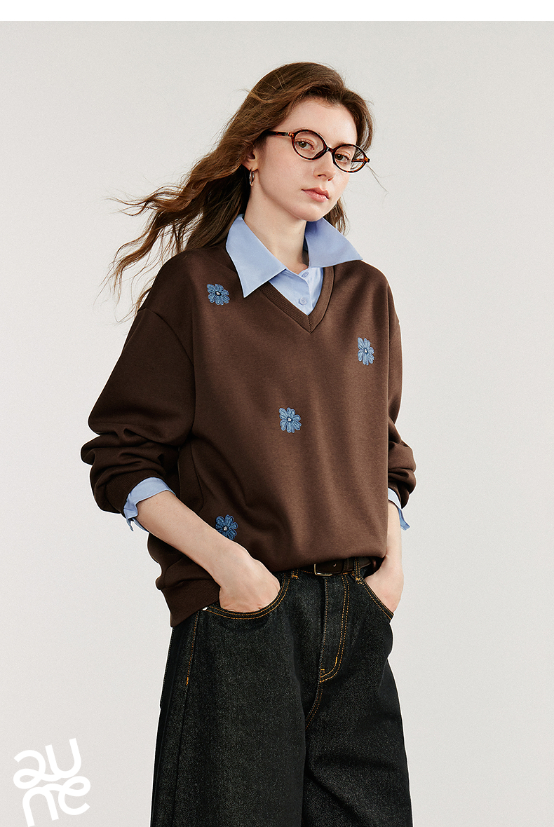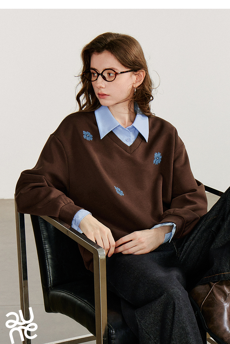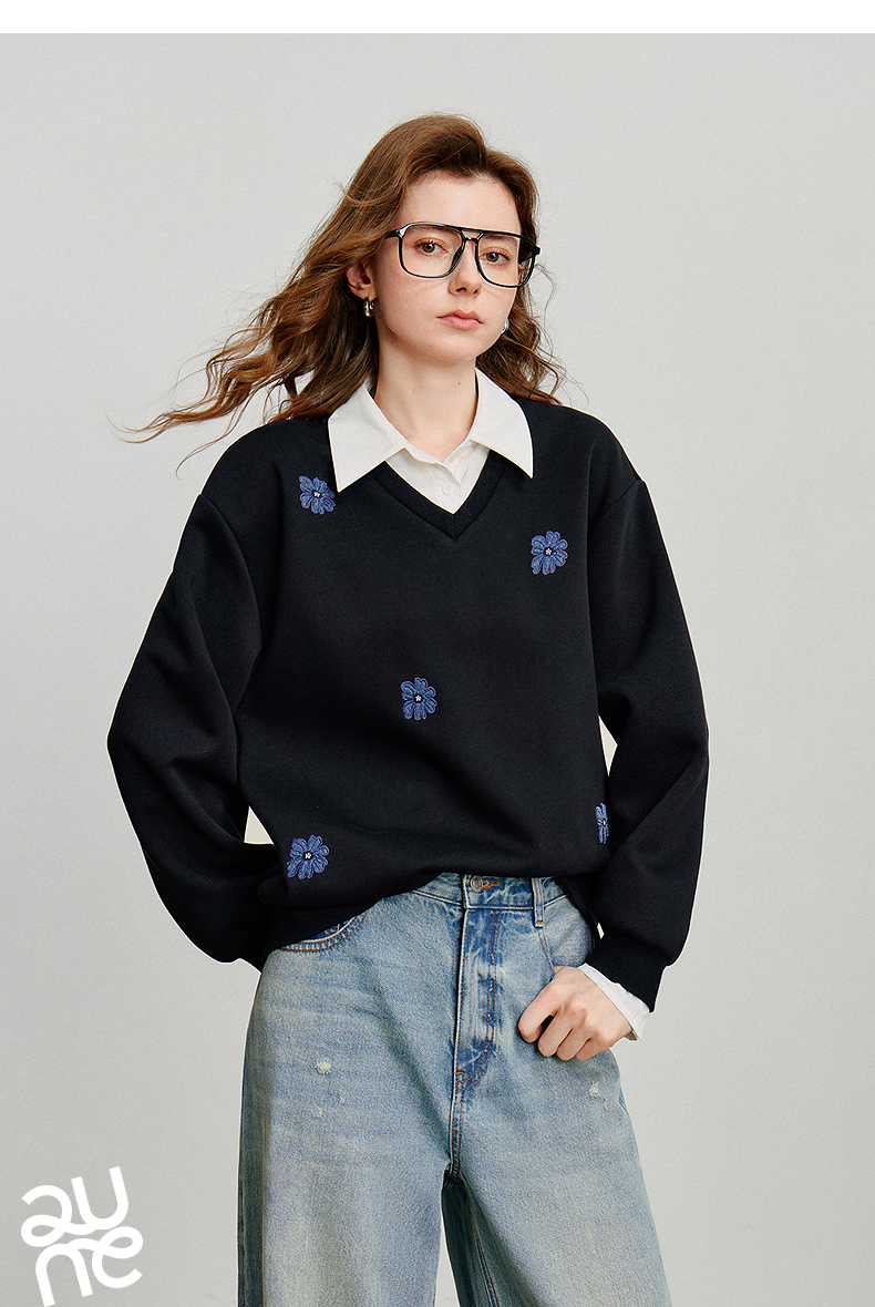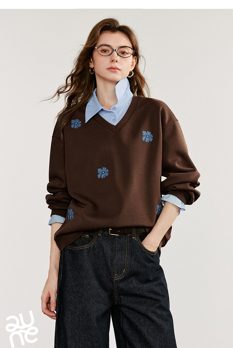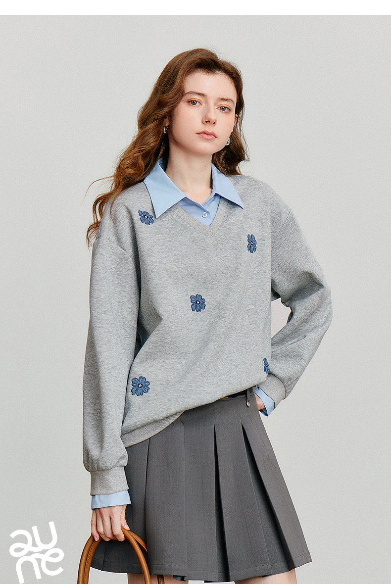 初语上衣女新款智性牛仔花棉质假两件休闲衬衫拼接卫衣