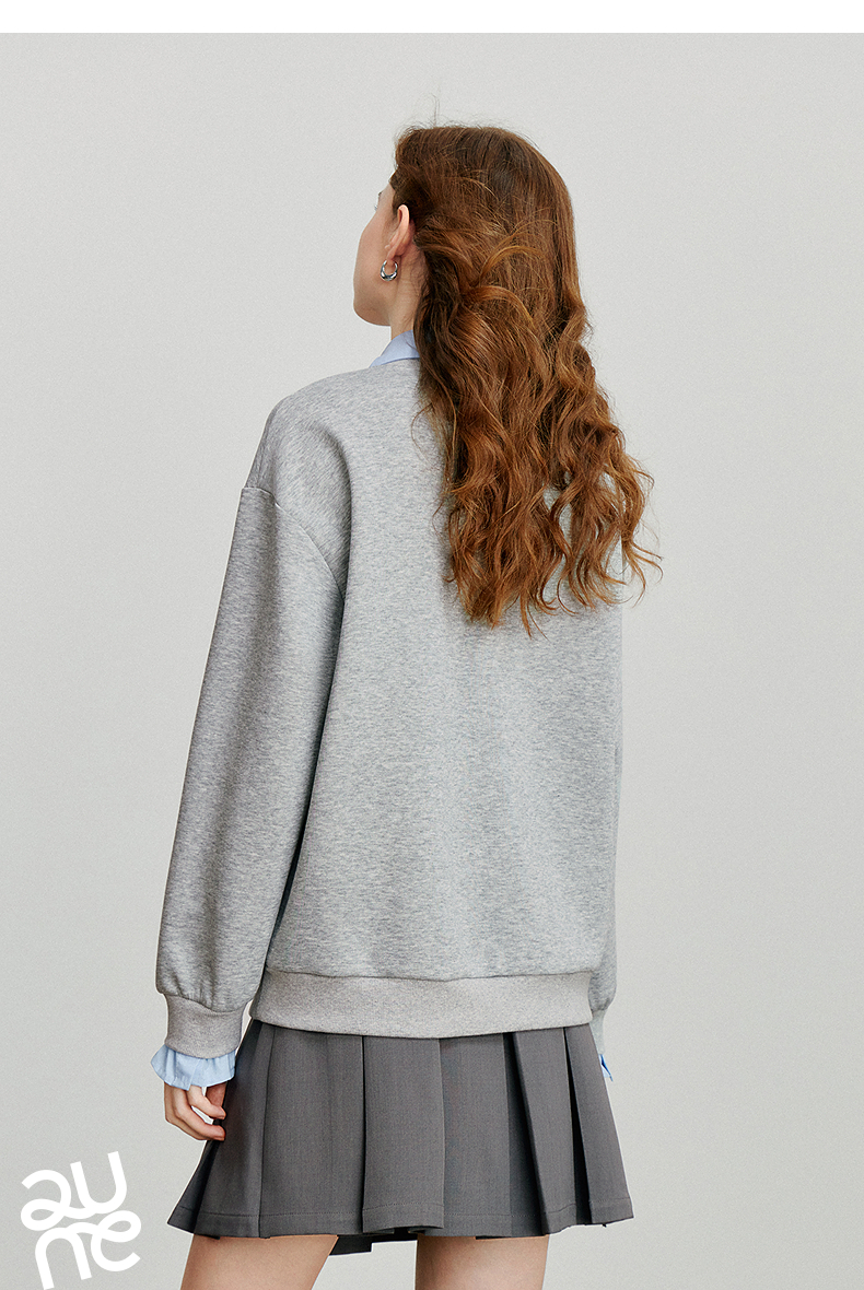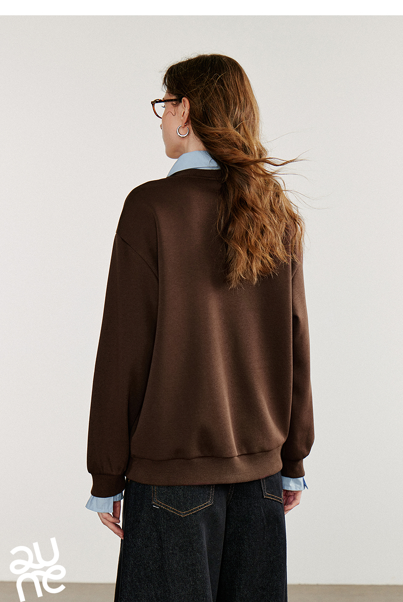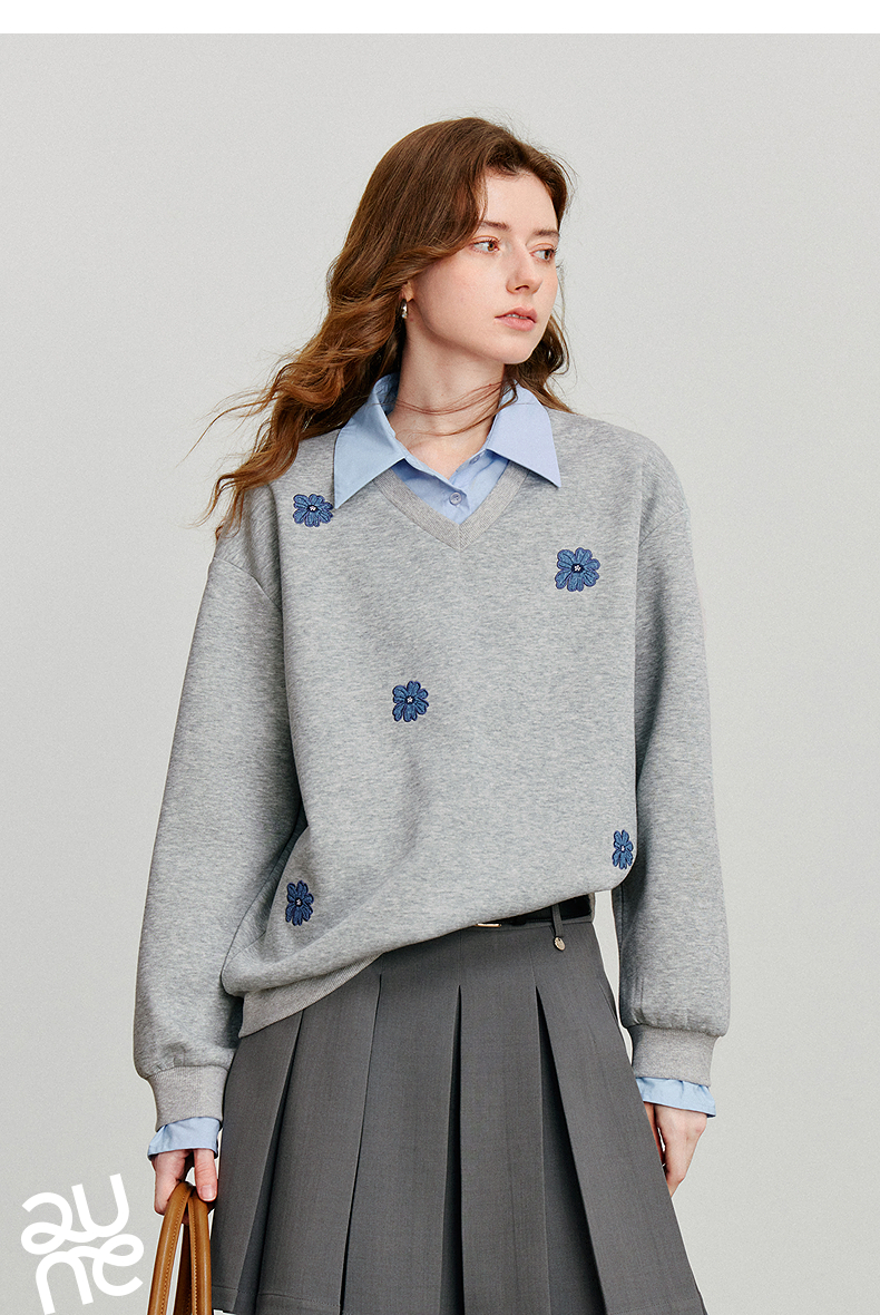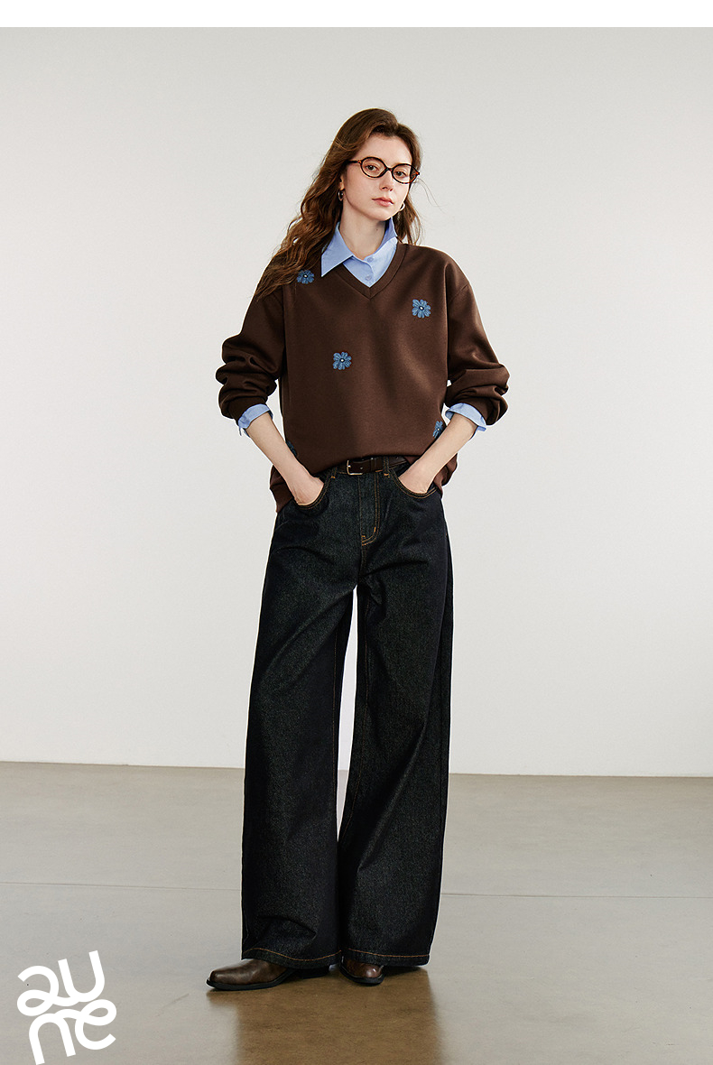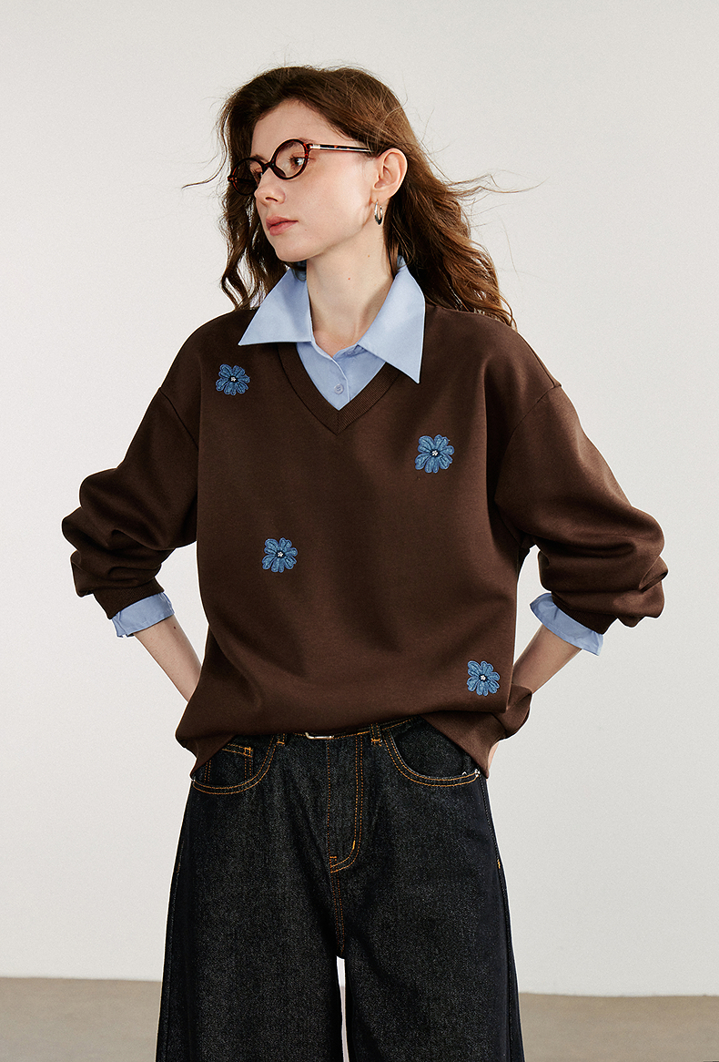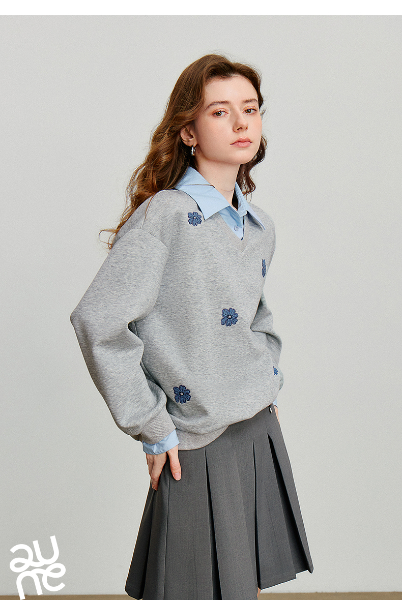 初语上衣女新款智性牛仔花棉质假两件休闲衬衫拼接卫衣