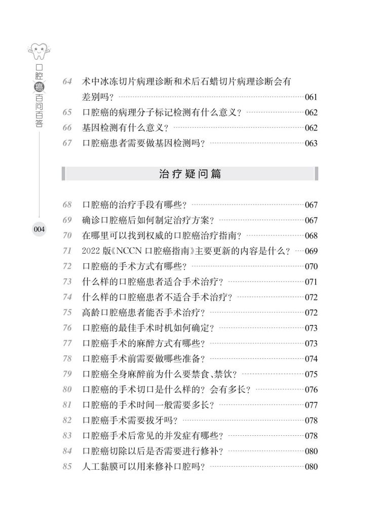 本书是一本关于口腔癌的科普手册。从口腔癌的基础、诊断、治疗、护理和康复知识5个方面展开,共有169个问答。对口腔癌的发病因素、预防措施、评定方法、检查手段以及检查报告的解读进行了详细解答;对术前评估措施、手术方式选择、术后注意事项和康复护理措施、居家自查等也做了详细解析。