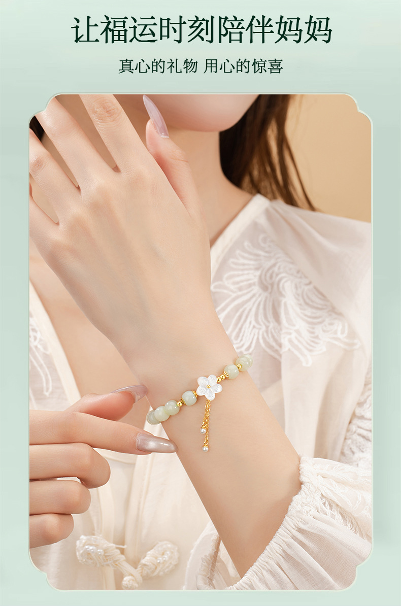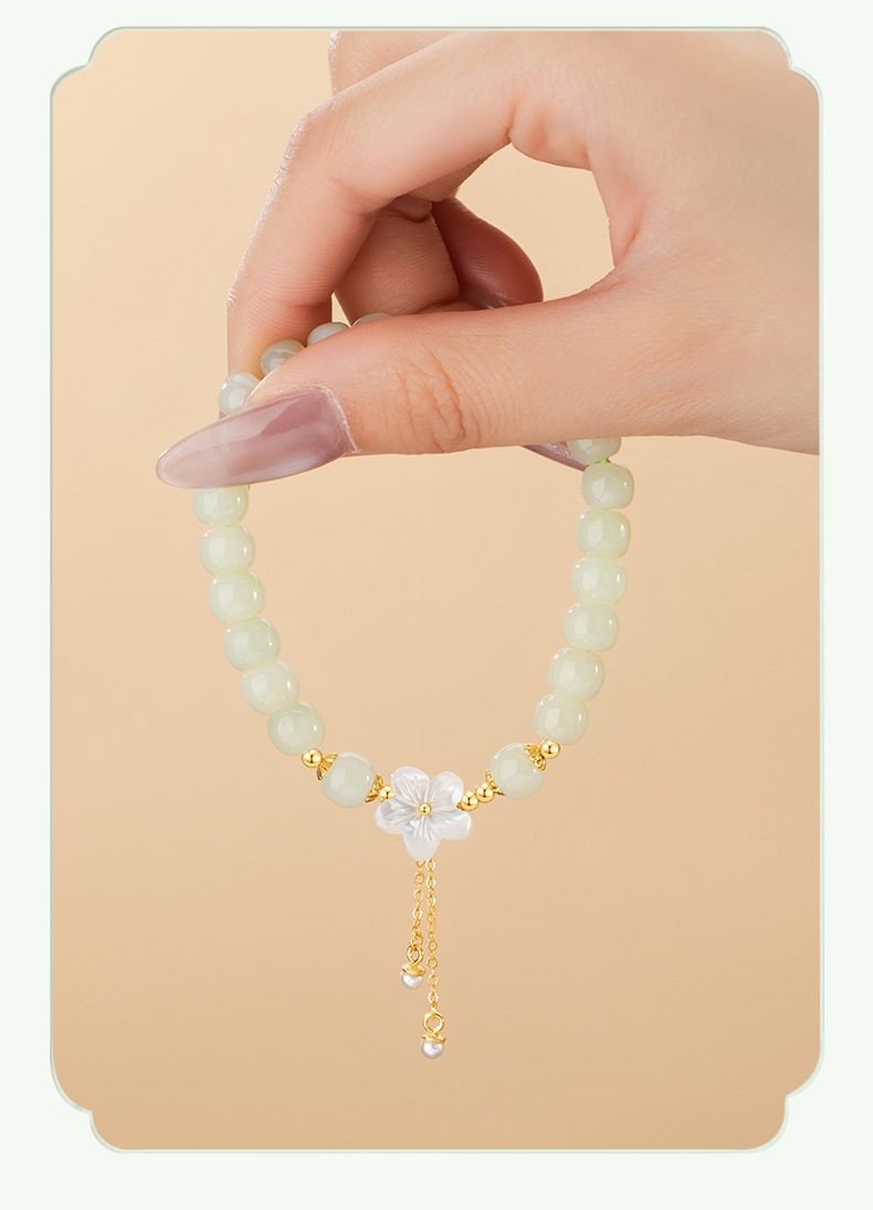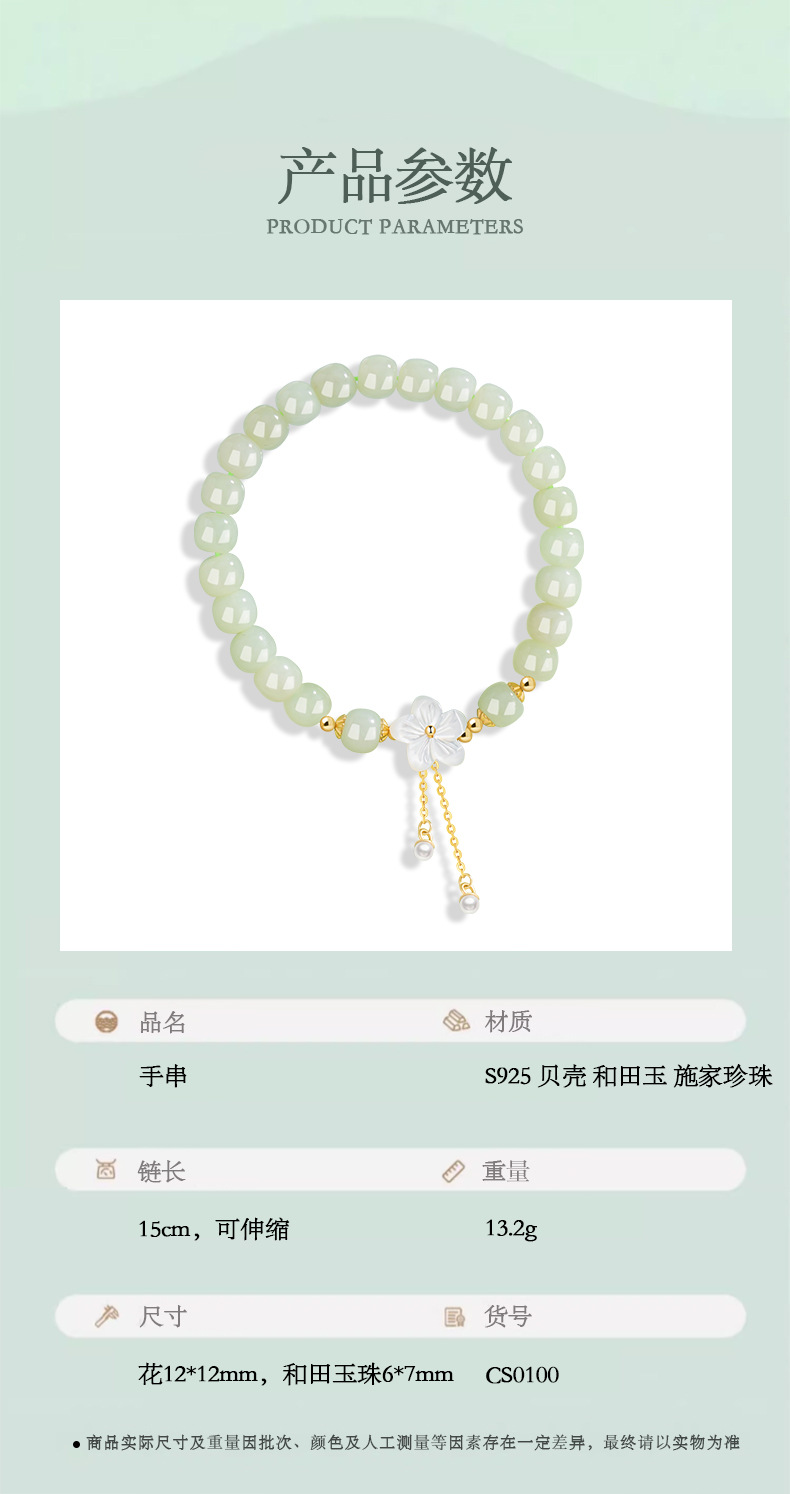 桃花朵朵纯银925和田玉手串女新中式国潮贝壳花朵手饰ins珍珠手链CS0100