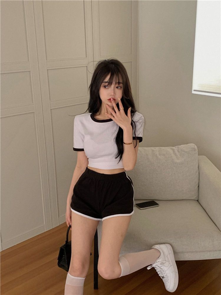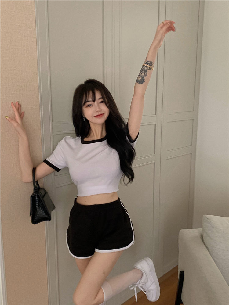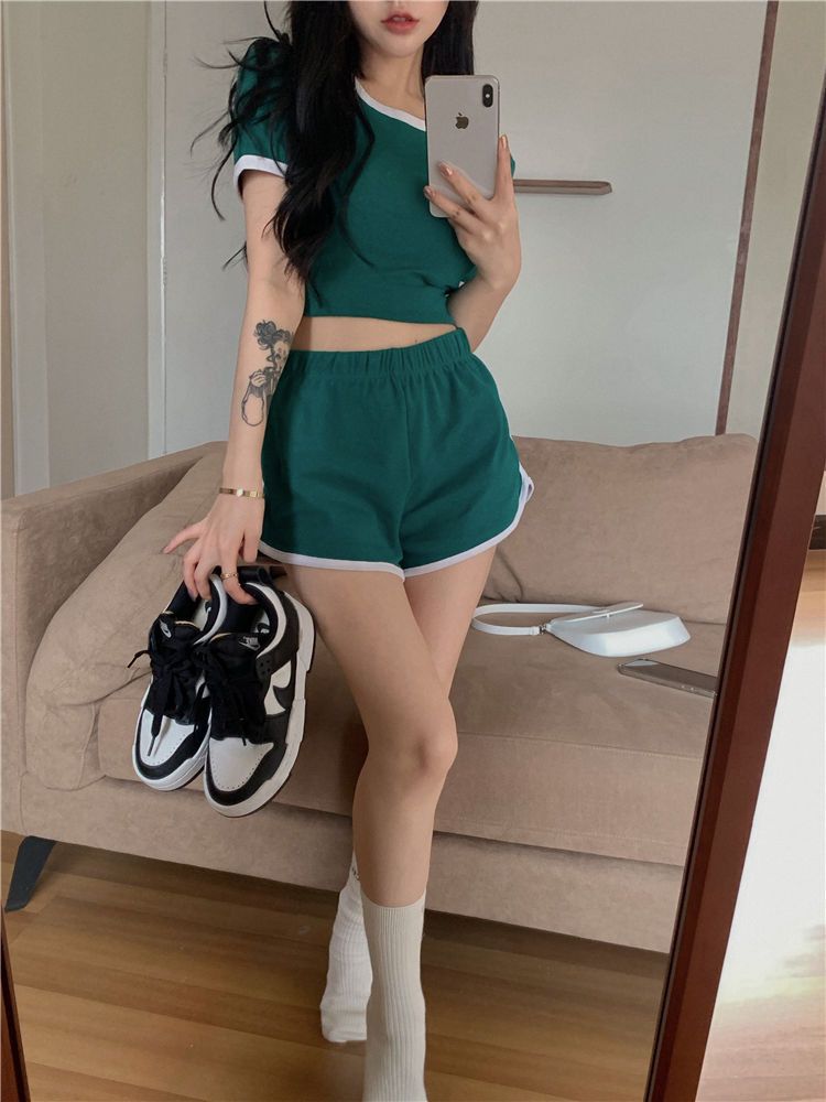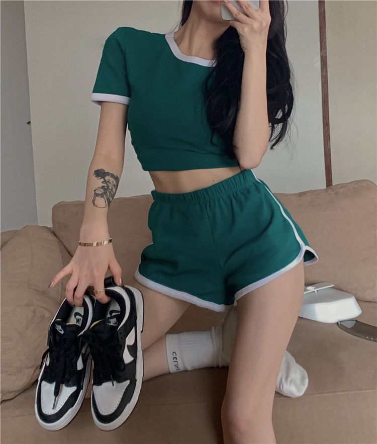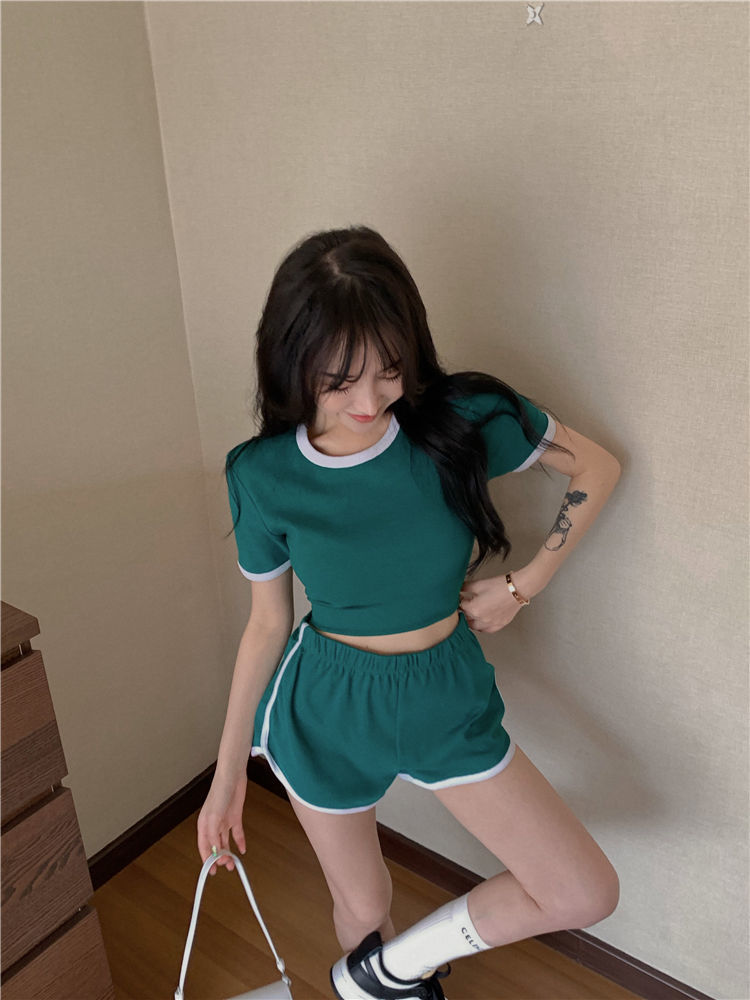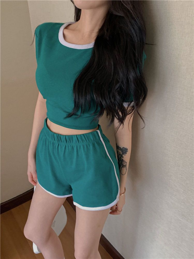 【时尚运动风!夏季短款撞色运动两件套】活力四射,时尚舒适,女夏季短款T恤露脐短袖上衣搭配休闲短裤两件套装