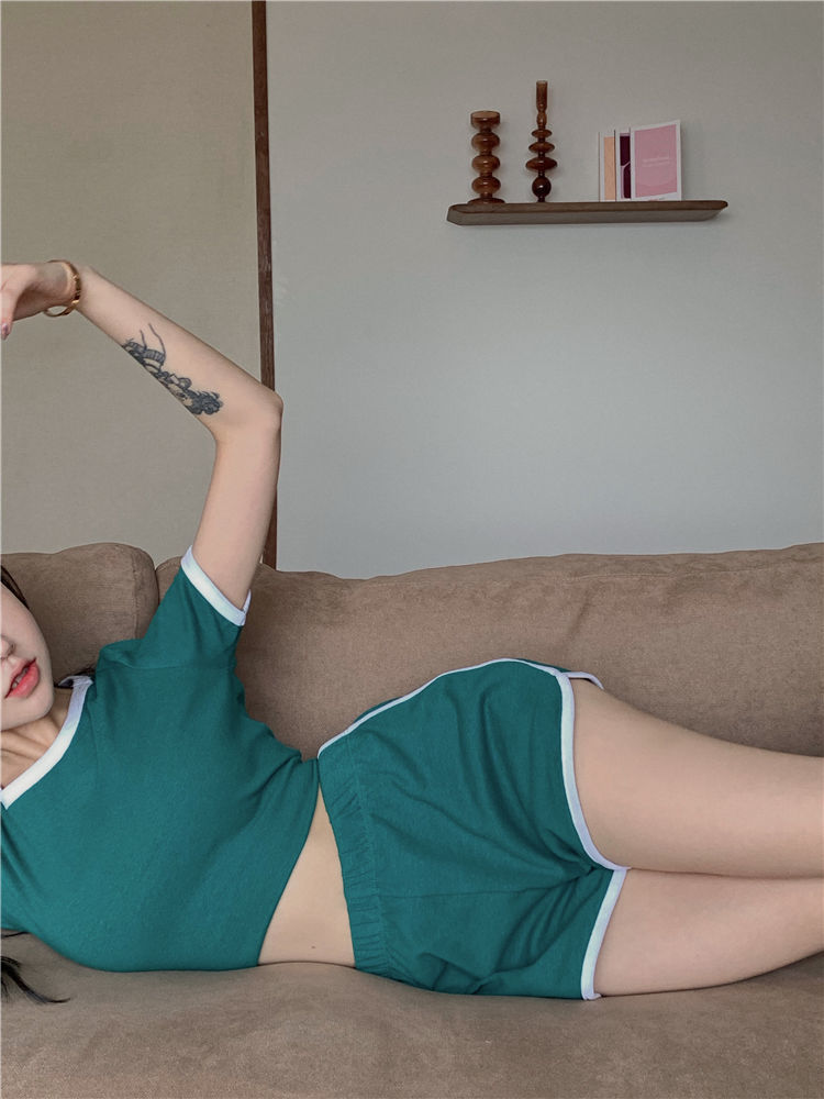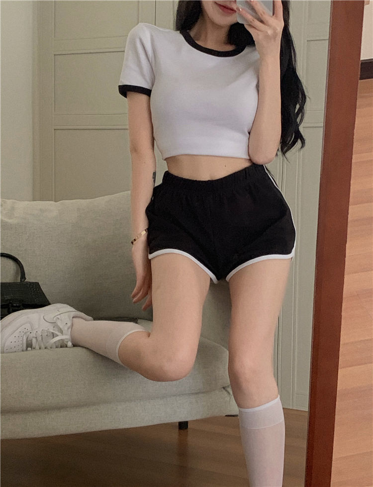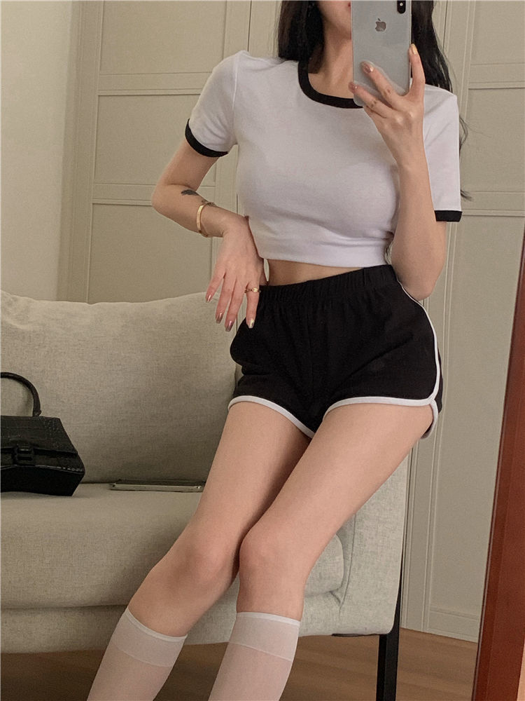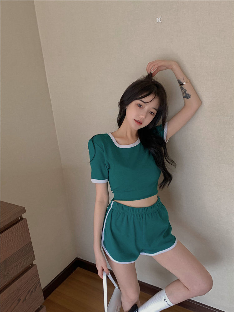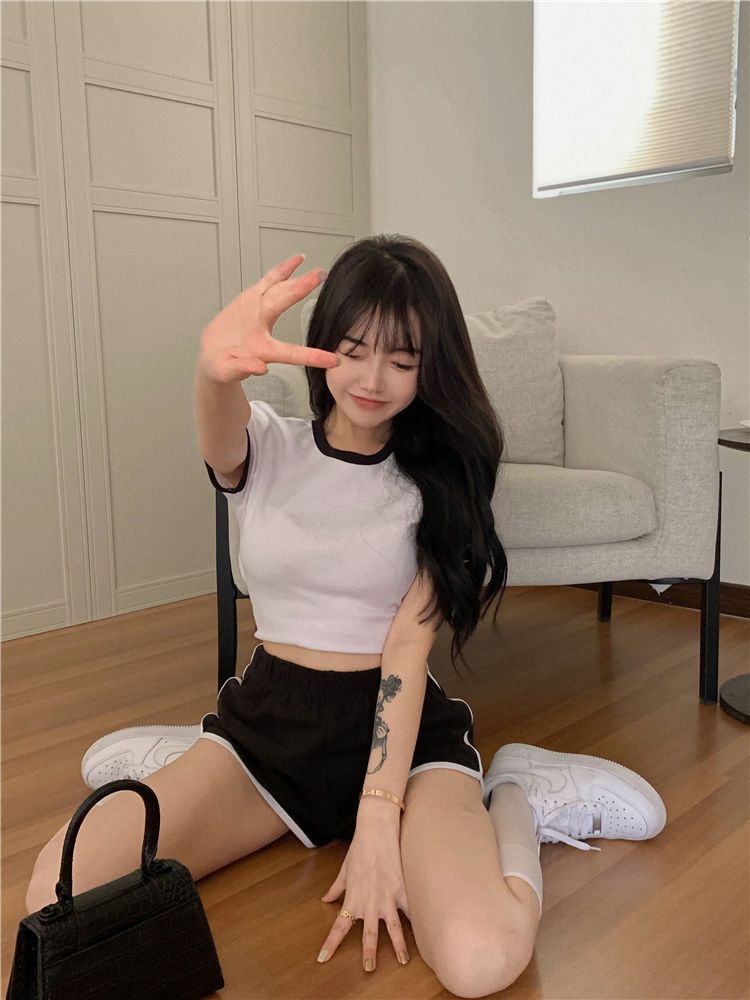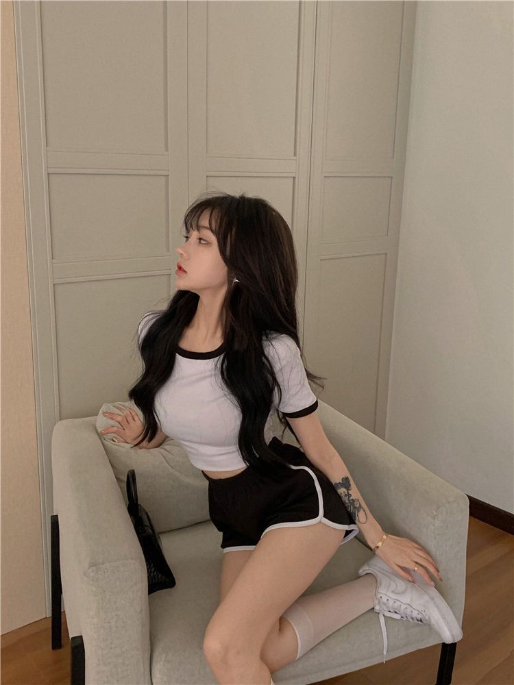 【时尚运动风!夏季短款撞色运动两件套】活力四射,时尚舒适,女夏季短款T恤露脐短袖上衣搭配休闲短裤两件套装