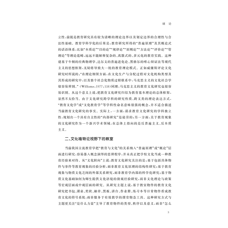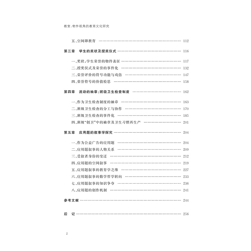 书稿从书包、课桌、奖状、袖章、作业册等五种学生日常生活的物件出发,研究教室的文化实践方式。物件是教室文化研究的切入点,它的背后暗含着学理性的研究对象。具体地说,书包这一物件的研究对象指向课业方式的重感体验;课桌作为研究对象则指向教室空间的制序问题,以及教学组织文化的主题。奖状作为研究对象关注的是奖状文本的符号结构及其价值导向机制,以及颁奖仪式中的教育文化主题;袖章作为学生轮值性卫生检查的配饰符号,它的基本指向是班级卫生检查制度及其文化规训机制;数学作业册的研究,主要通过数学应用题的文学性维度,探究应用题的叙事方式与结构的变迁。正是透过这些不同层面的物件及其文化符号方面的意蕴,来整体性描述与阐释教室日常文化实践的基本样态。