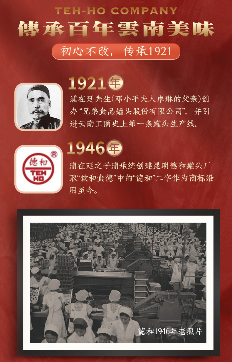 - 昆明德和罐头厂是中国最早开始生产制造罐头的企业之一,至今已有九十八年的悠久历史,现已形成以罐头食品为主,腌腊制品、糕点月饼等为辅的云南省规模最大和最具影响力综合食品制造企业,奠定了云南罐头行业的基石。