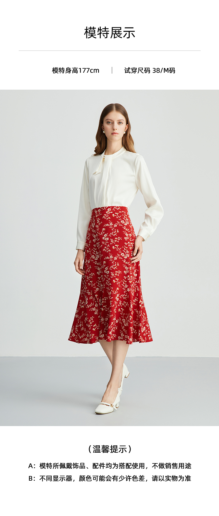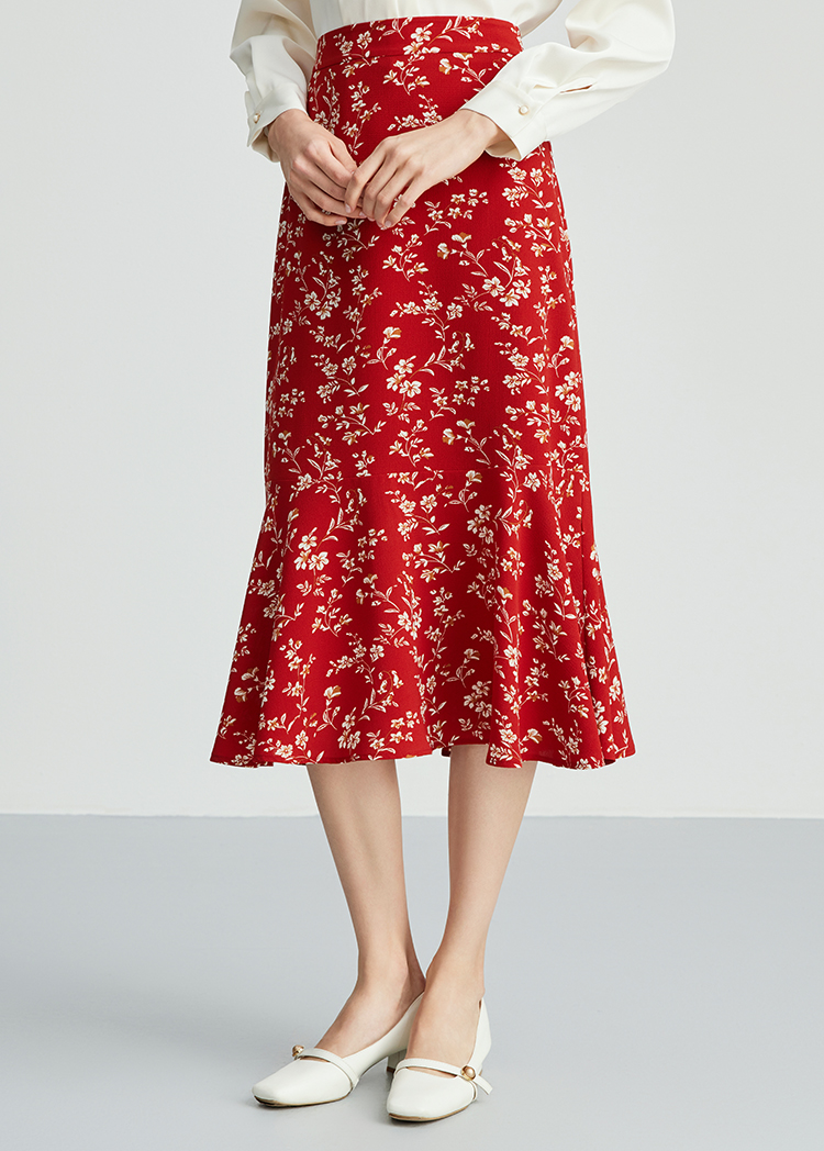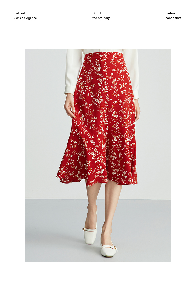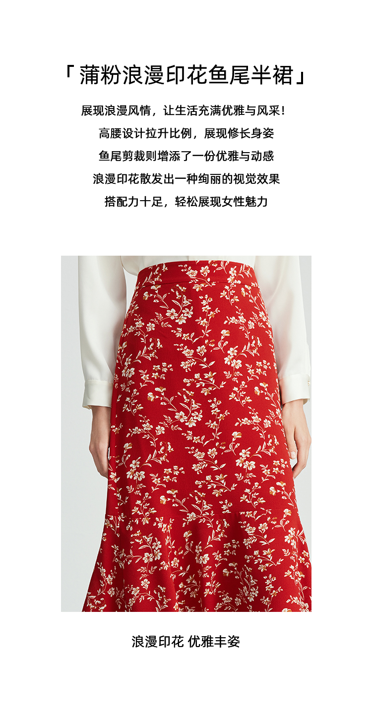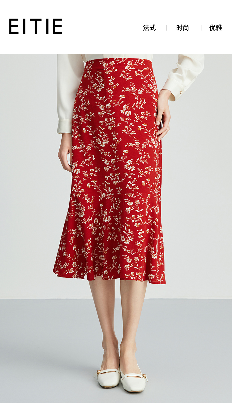 EITIE爱特爱秋季新款时尚高腰a字显瘦红色印花复古法式通勤半身裙C2406410