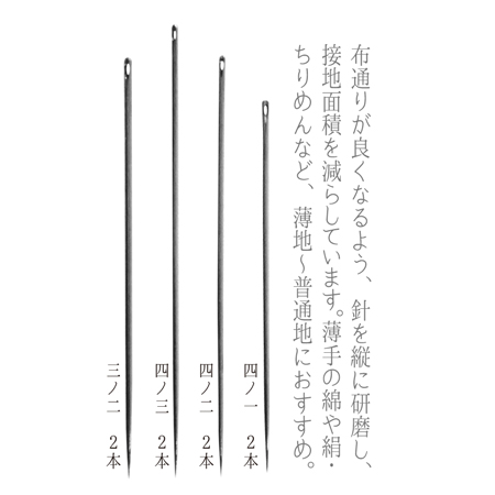 这种针头套装推荐用于薄布到平纹区域,如薄棉和丝绸·绉纱。