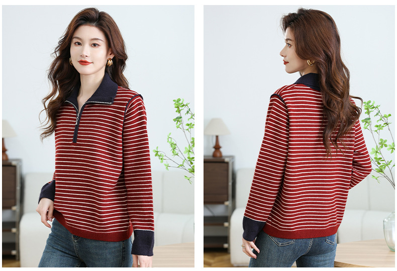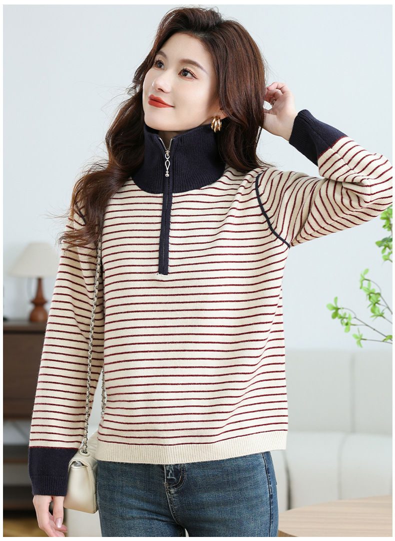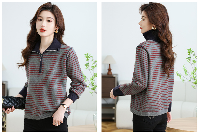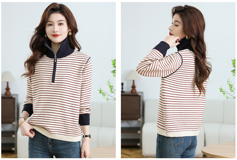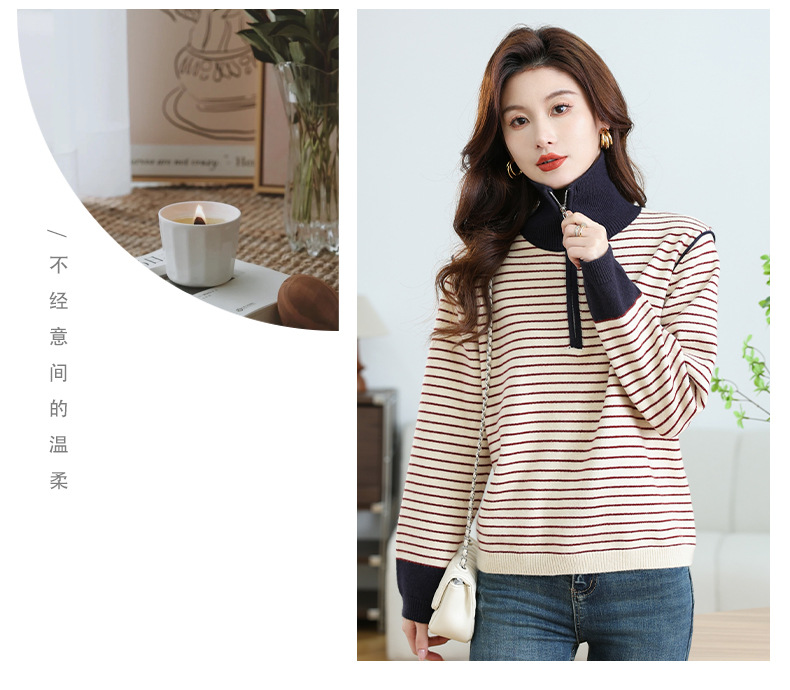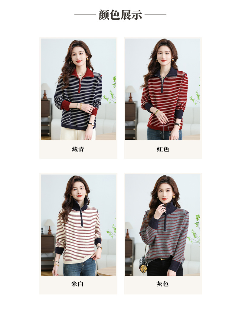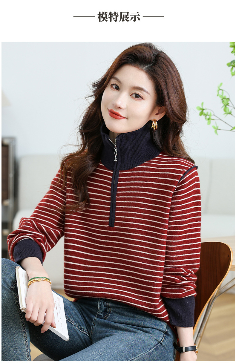 CC-17-6765小个子半拉链立领毛衣女士2024新款秋冬季洋气条纹显瘦厚款打底衫