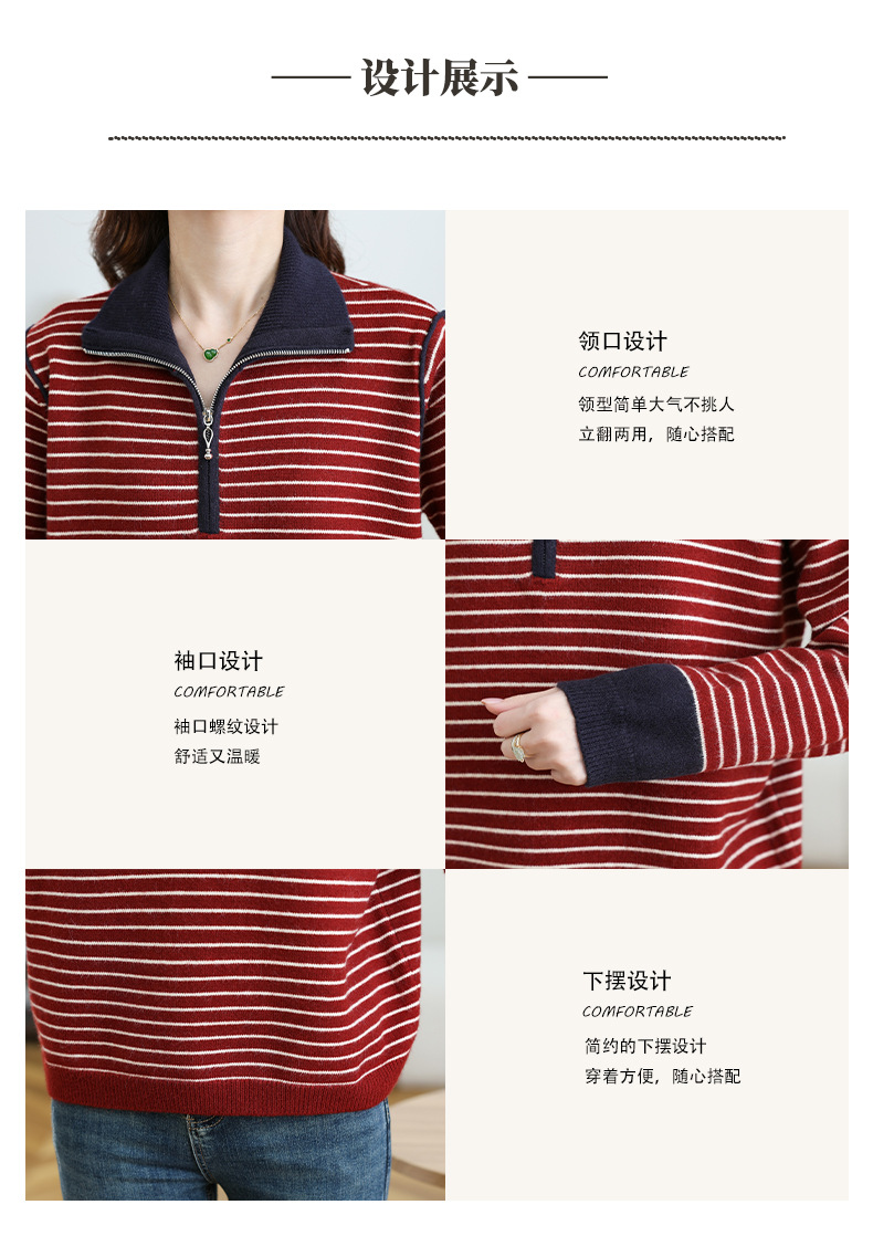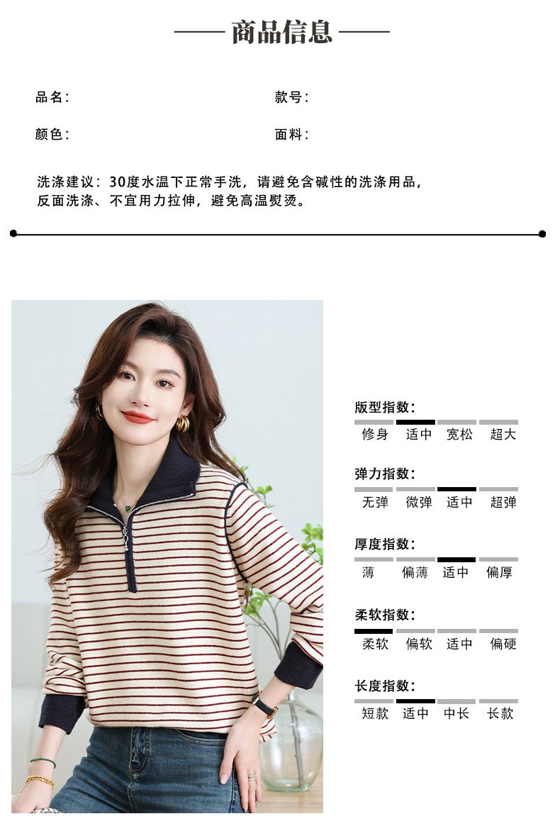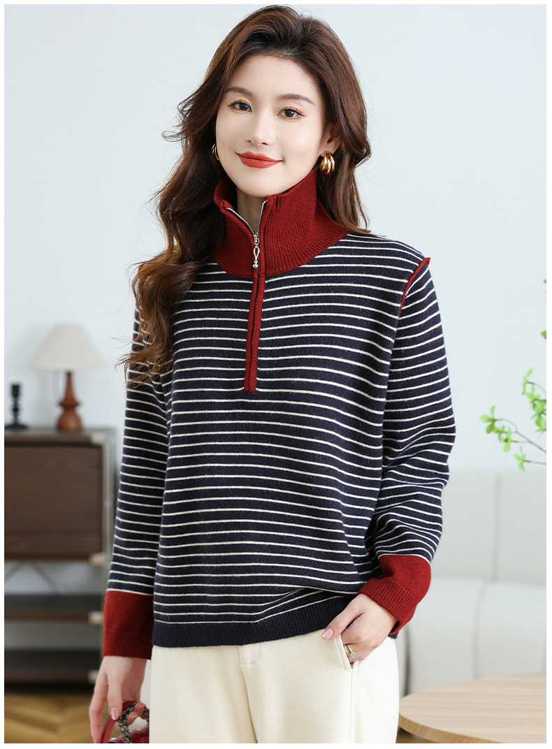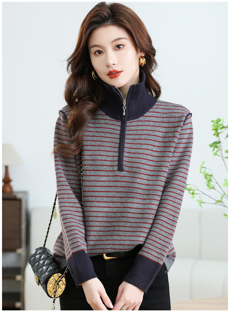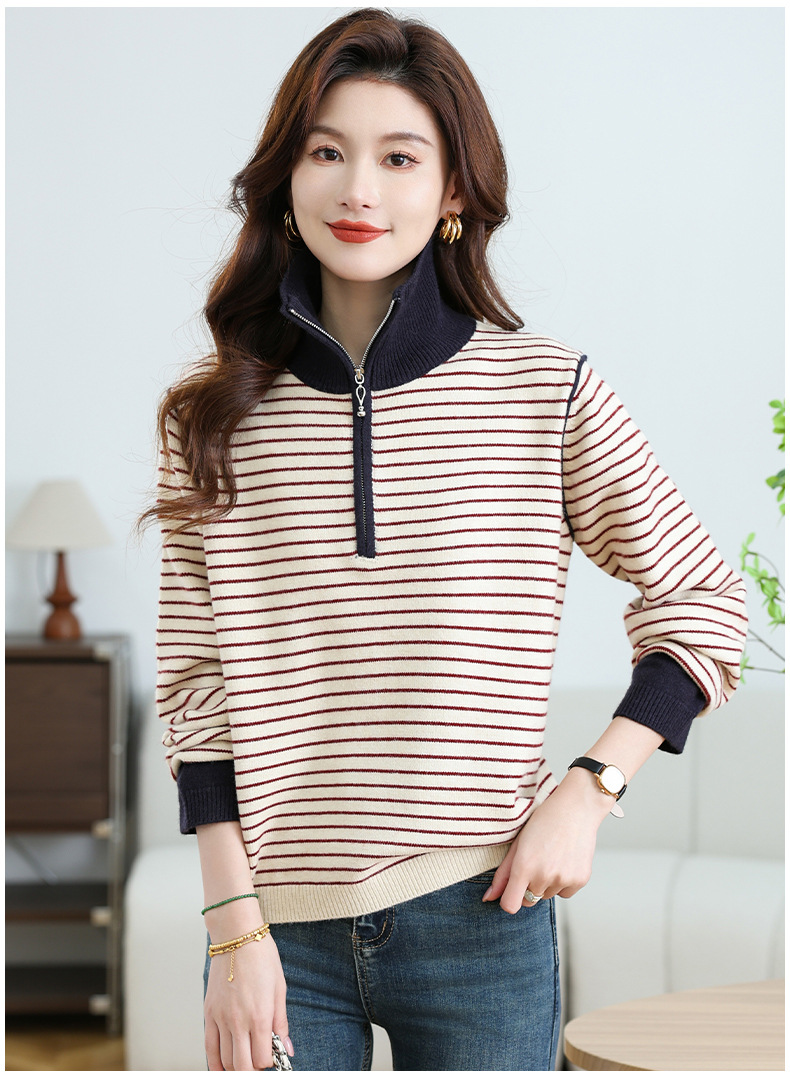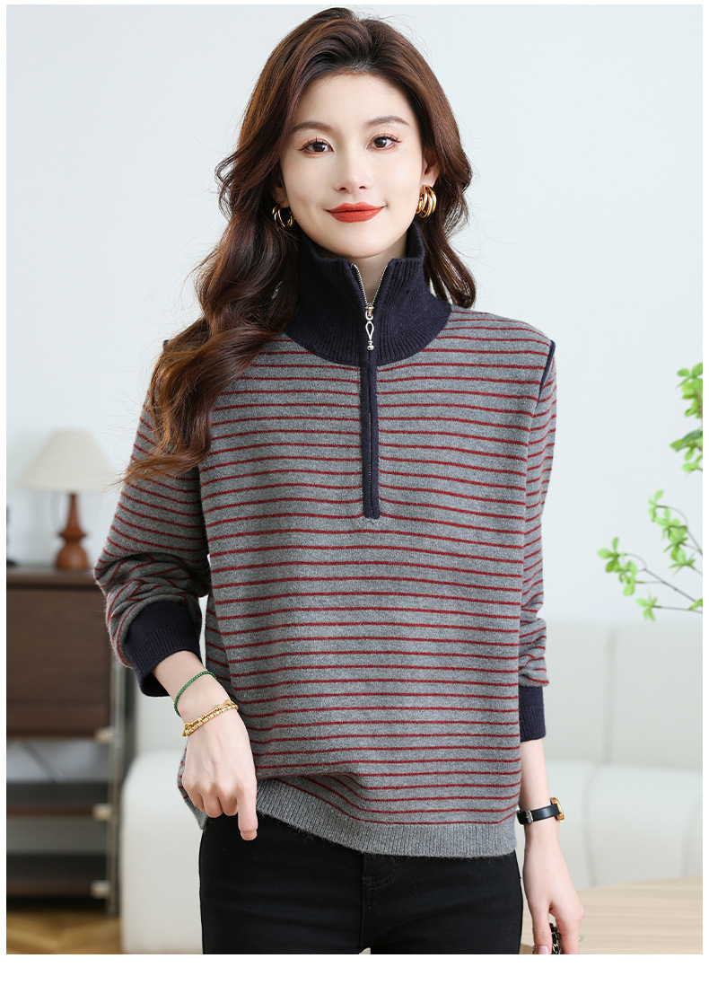 CC-17-6765小个子半拉链立领毛衣女士2024新款秋冬季洋气条纹显瘦厚款打底衫