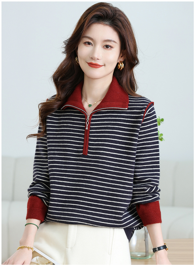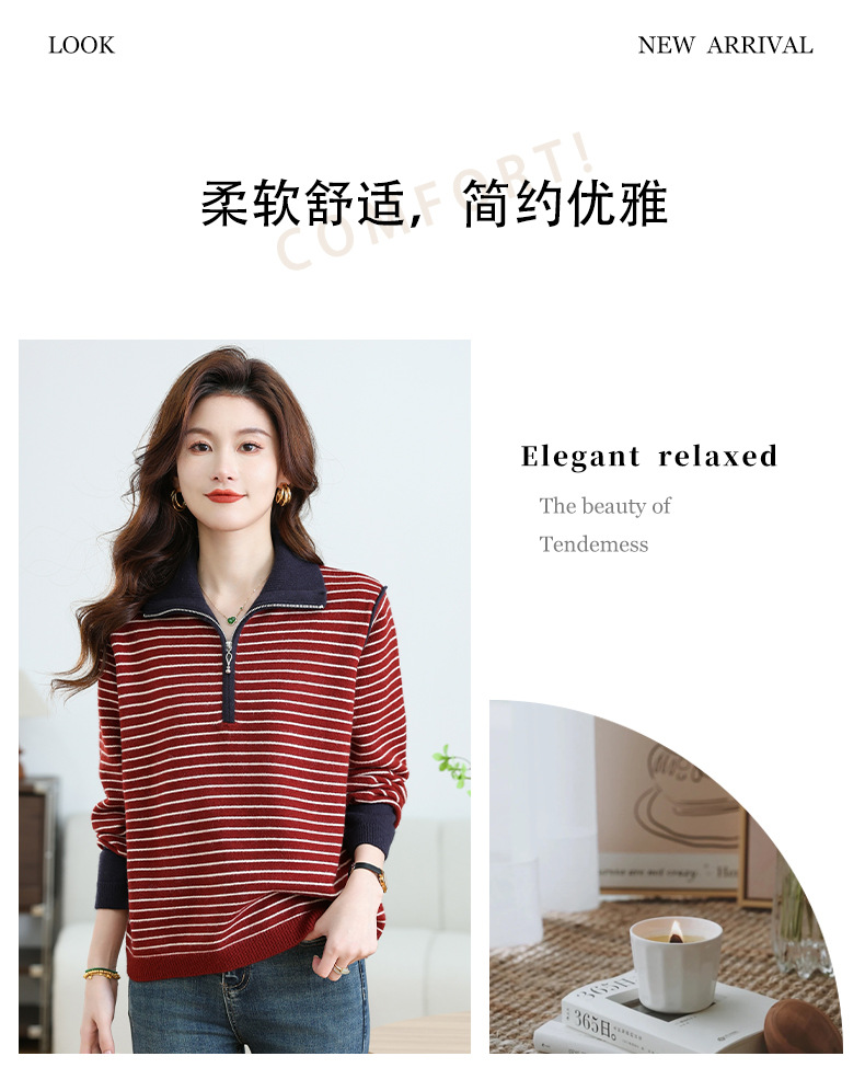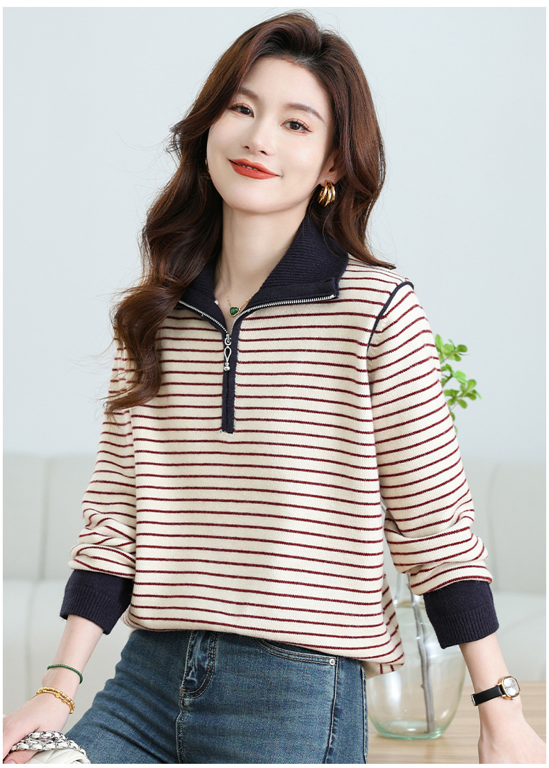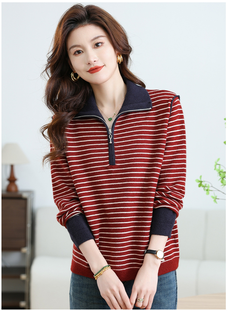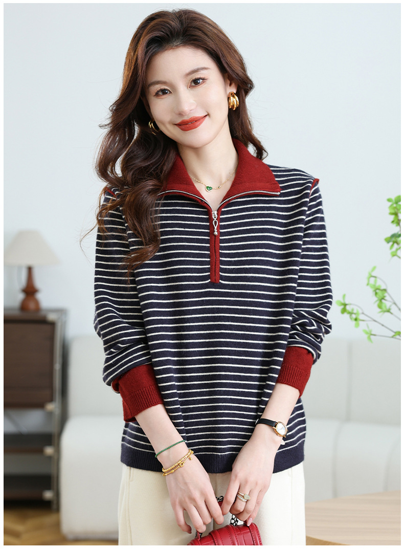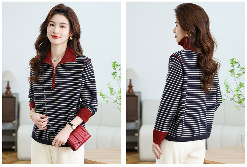 CC-17-6765小个子半拉链立领毛衣女士2024新款秋冬季洋气条纹显瘦厚款打底衫