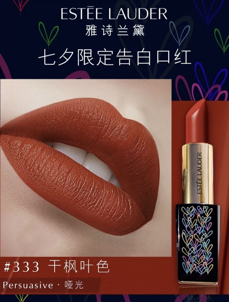 雅诗兰黛口红#333-限量版👍七夕限定告白口红,涂鸦与爱心的邂逅❤。#333干枫叶色必须拥有姓名,不挑肤色和妆容的暖调枫叶橘红棕🍁,薄涂是暖番茄橘红调,素颜提气色,活泼感十足😝!厚涂是浓郁饱满的枫叶橘红棕,黄黑皮轻松驾驭,无敌显白自带高级感。哑光丝绒质地,添加了玻尿酸💦,哑而不干,不需要润唇膏打底也很滋润哦。平时通勤上学还是聚会涂它都不会出错。