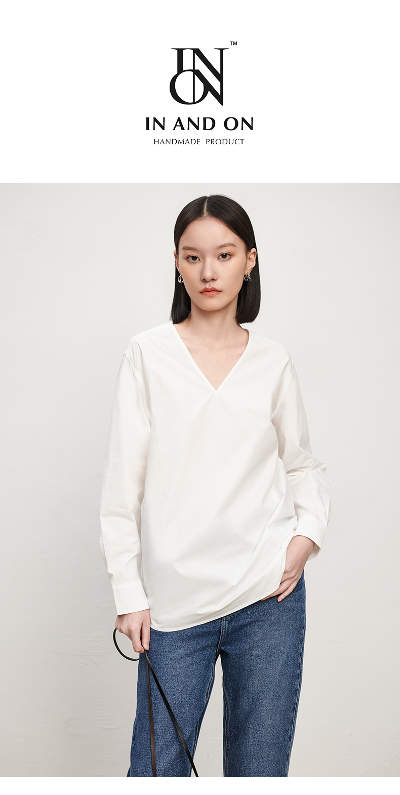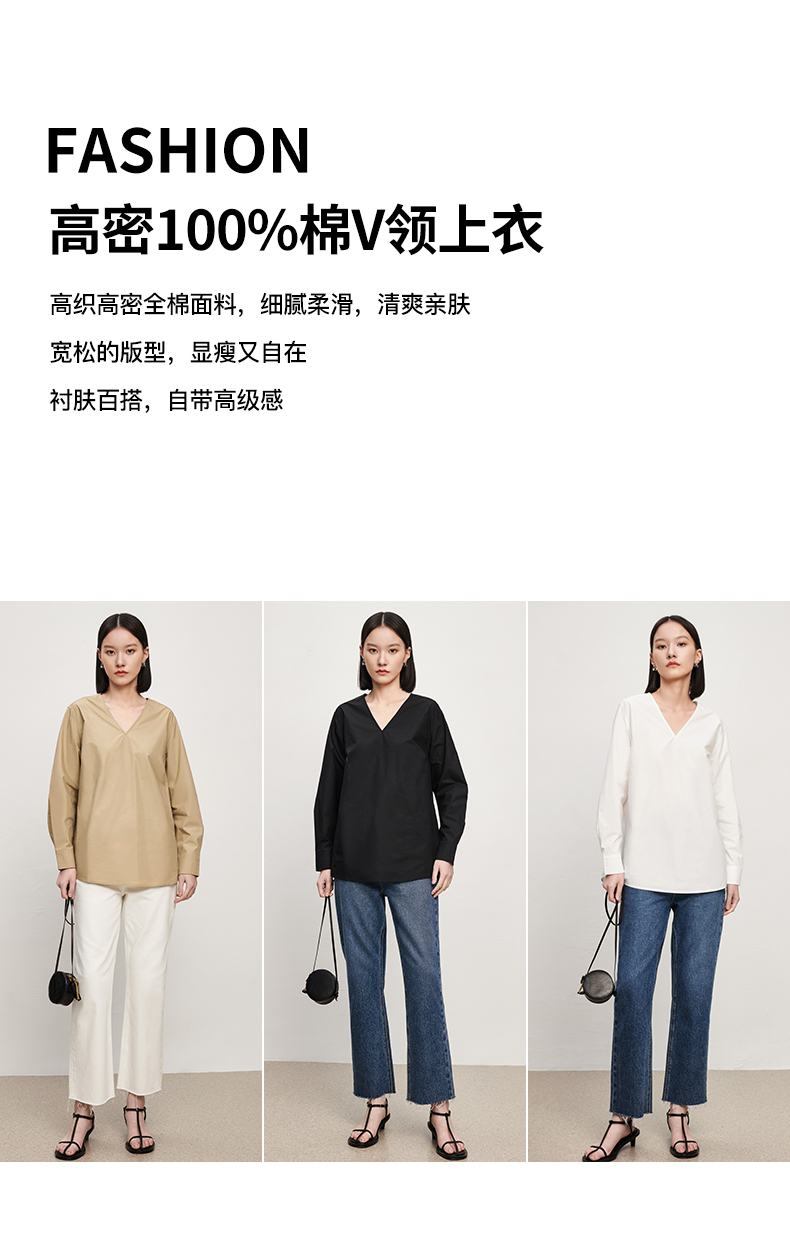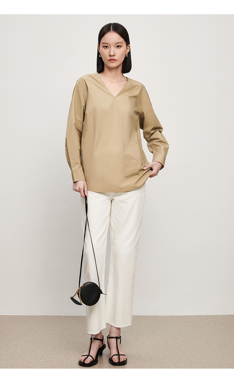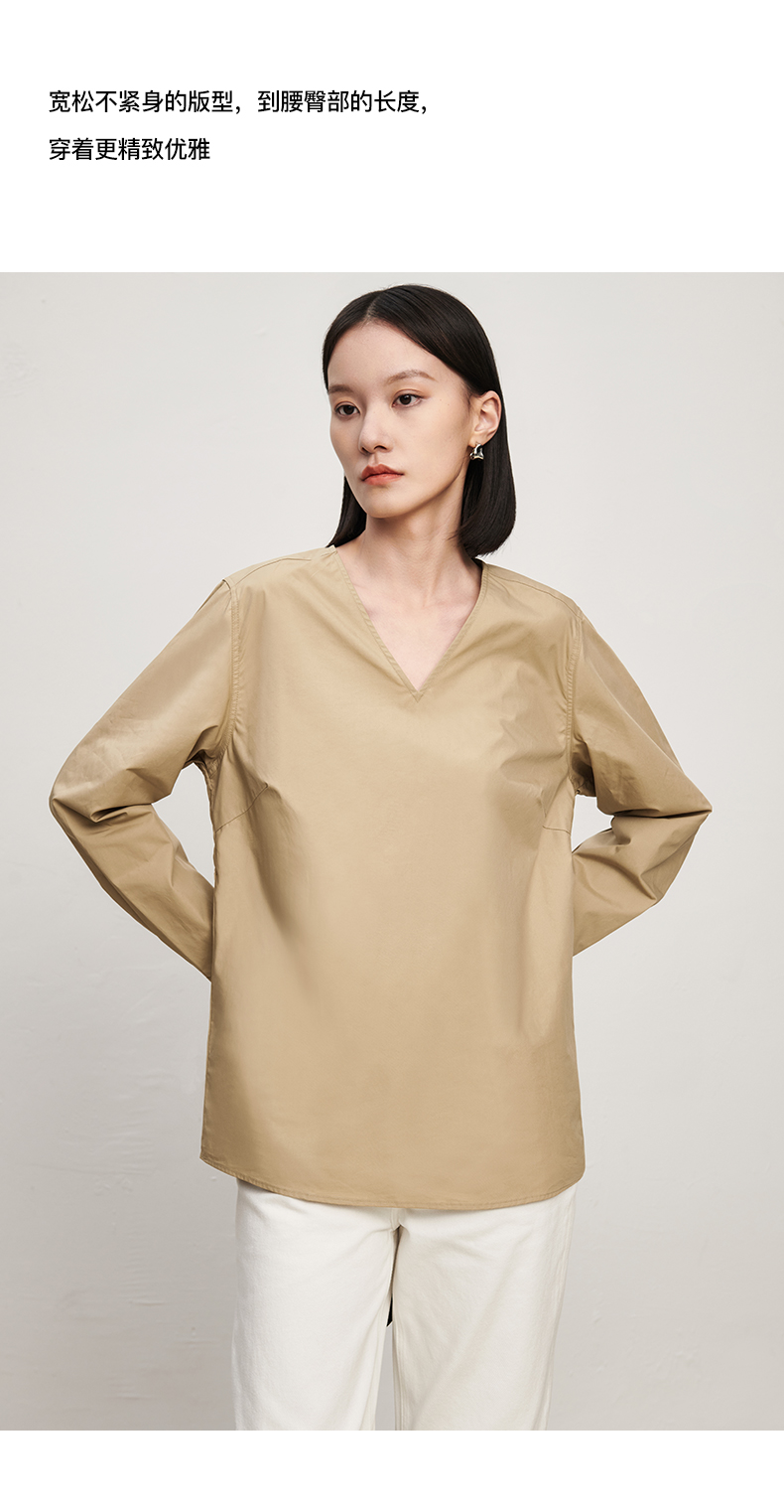 IN AND ON 春秋新款衬衫女纯棉纯色简约质感百搭宽松V领上衣