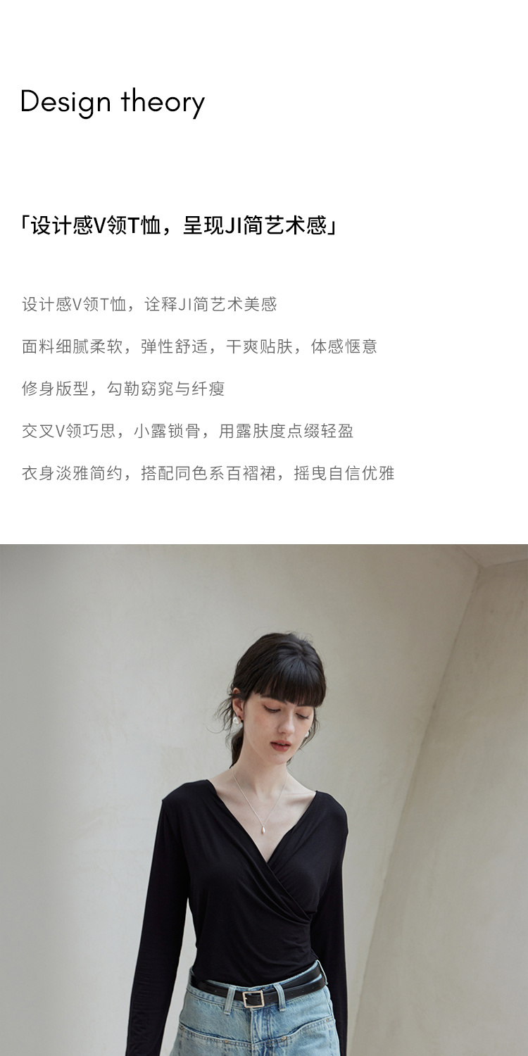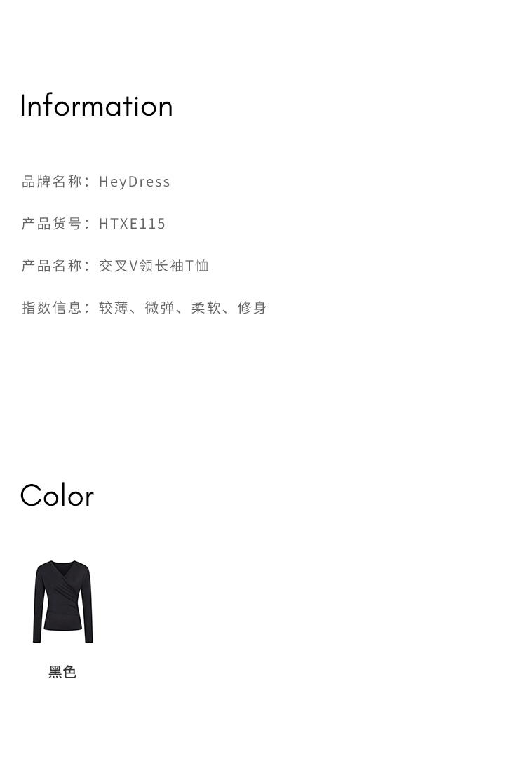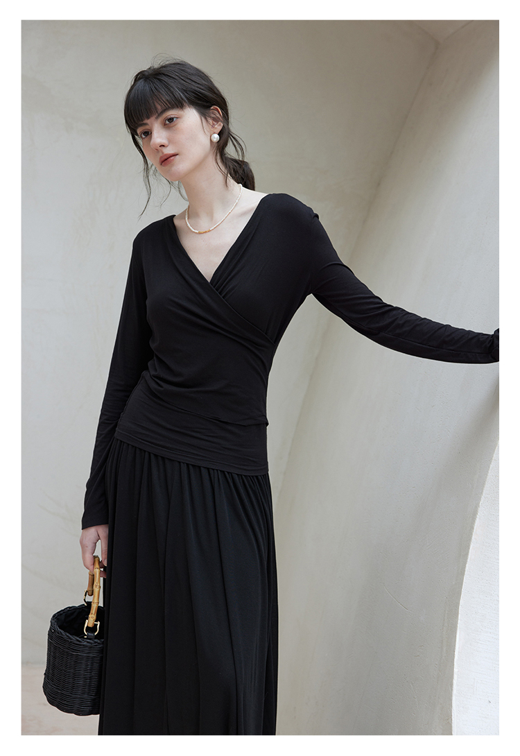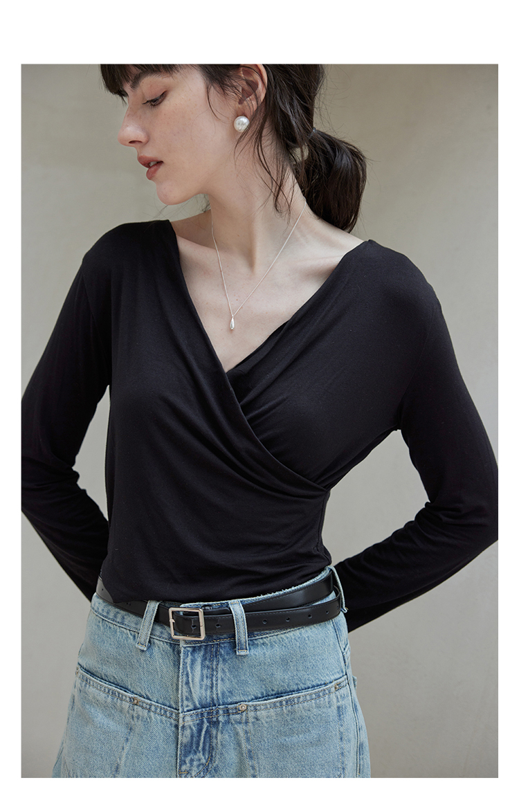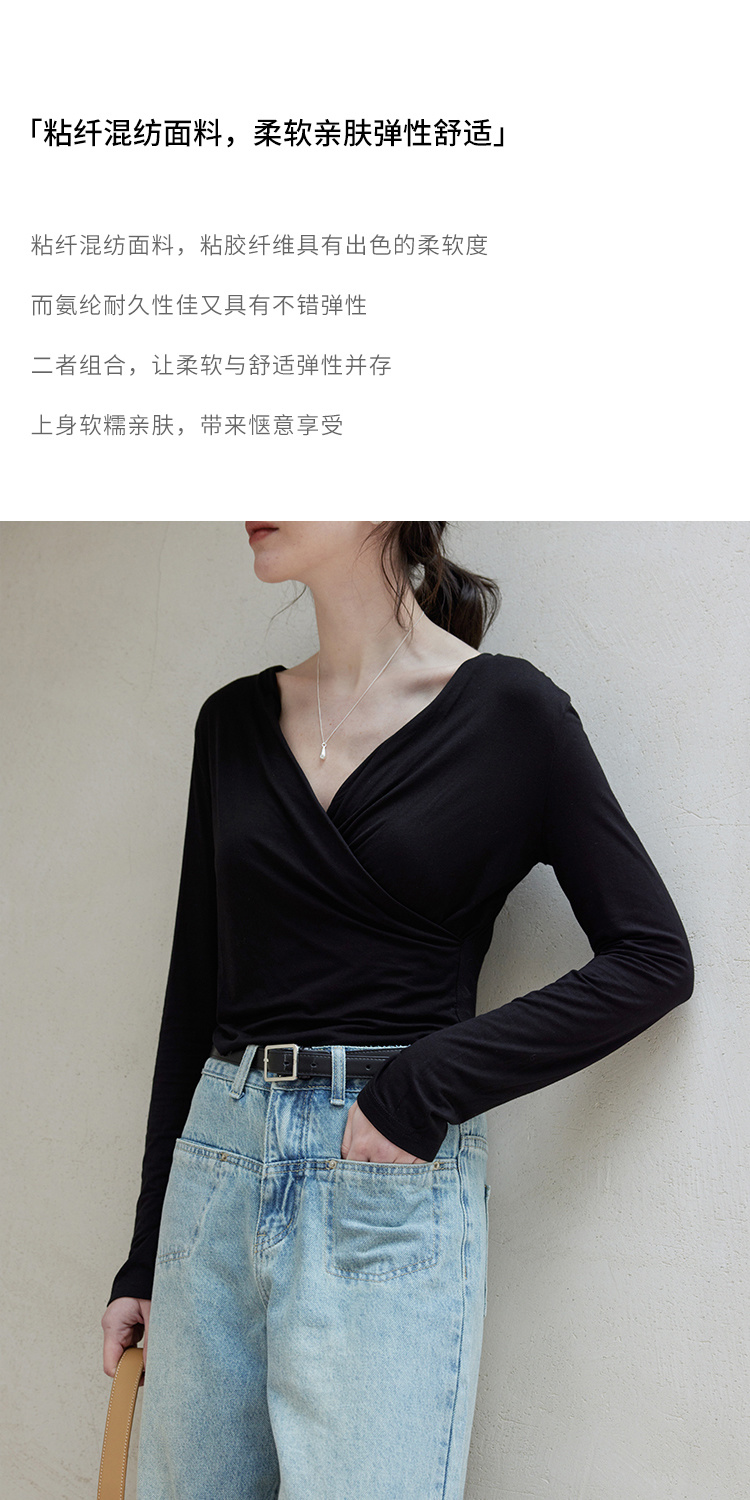 HeyDress长袖T恤女春季修身黑色内搭打底衫交叉V领设计感别致上衣